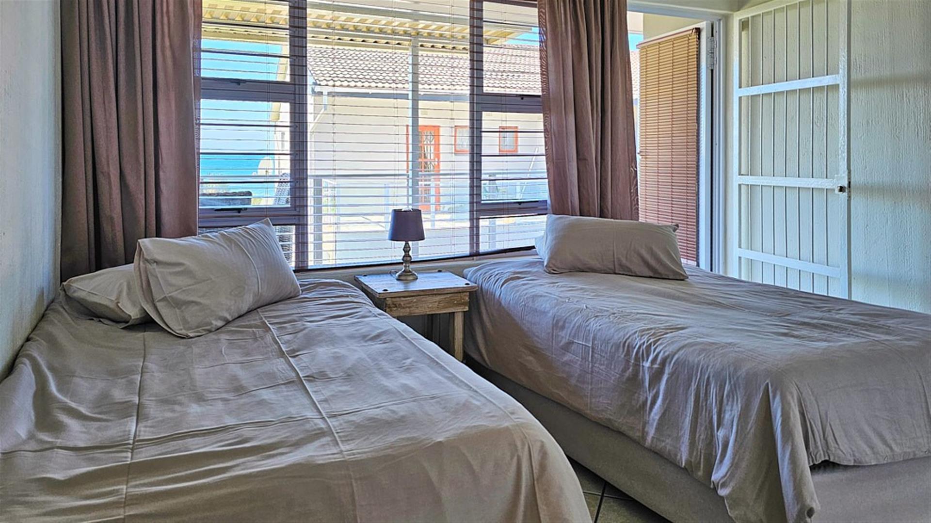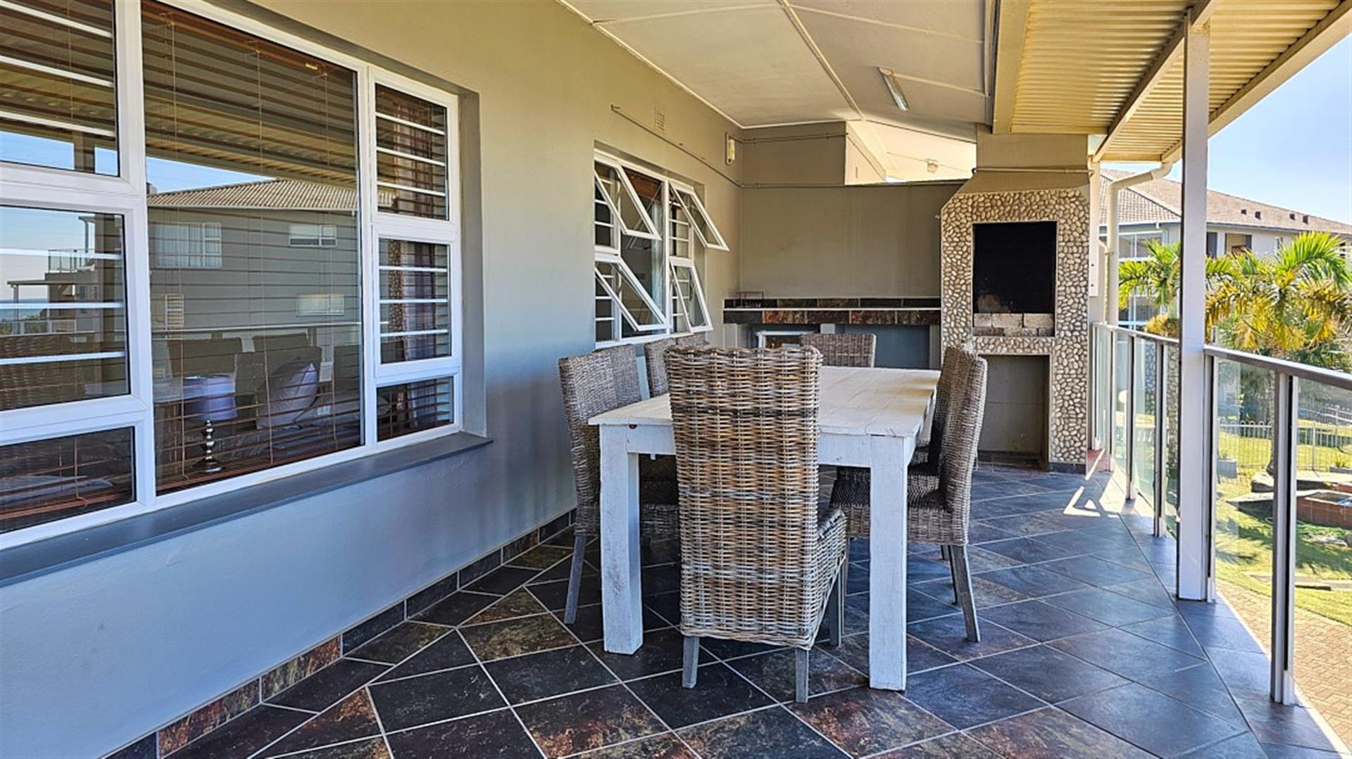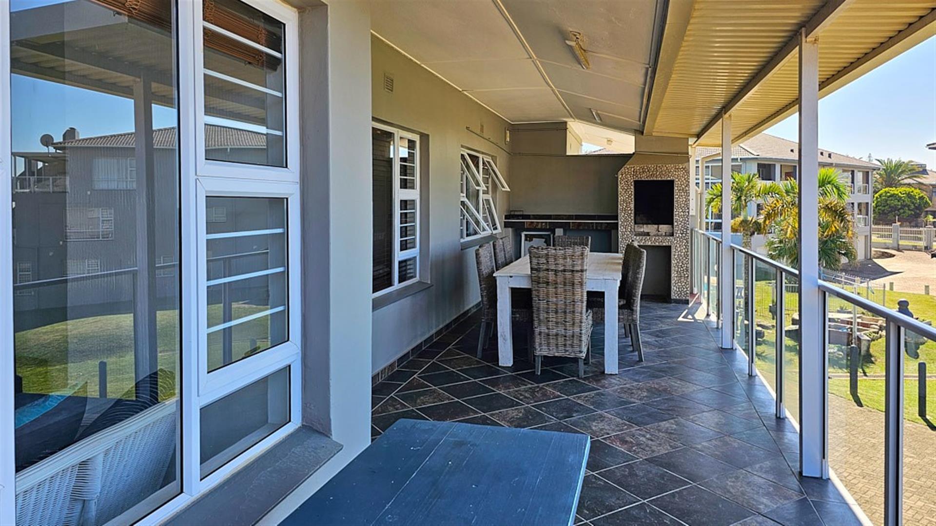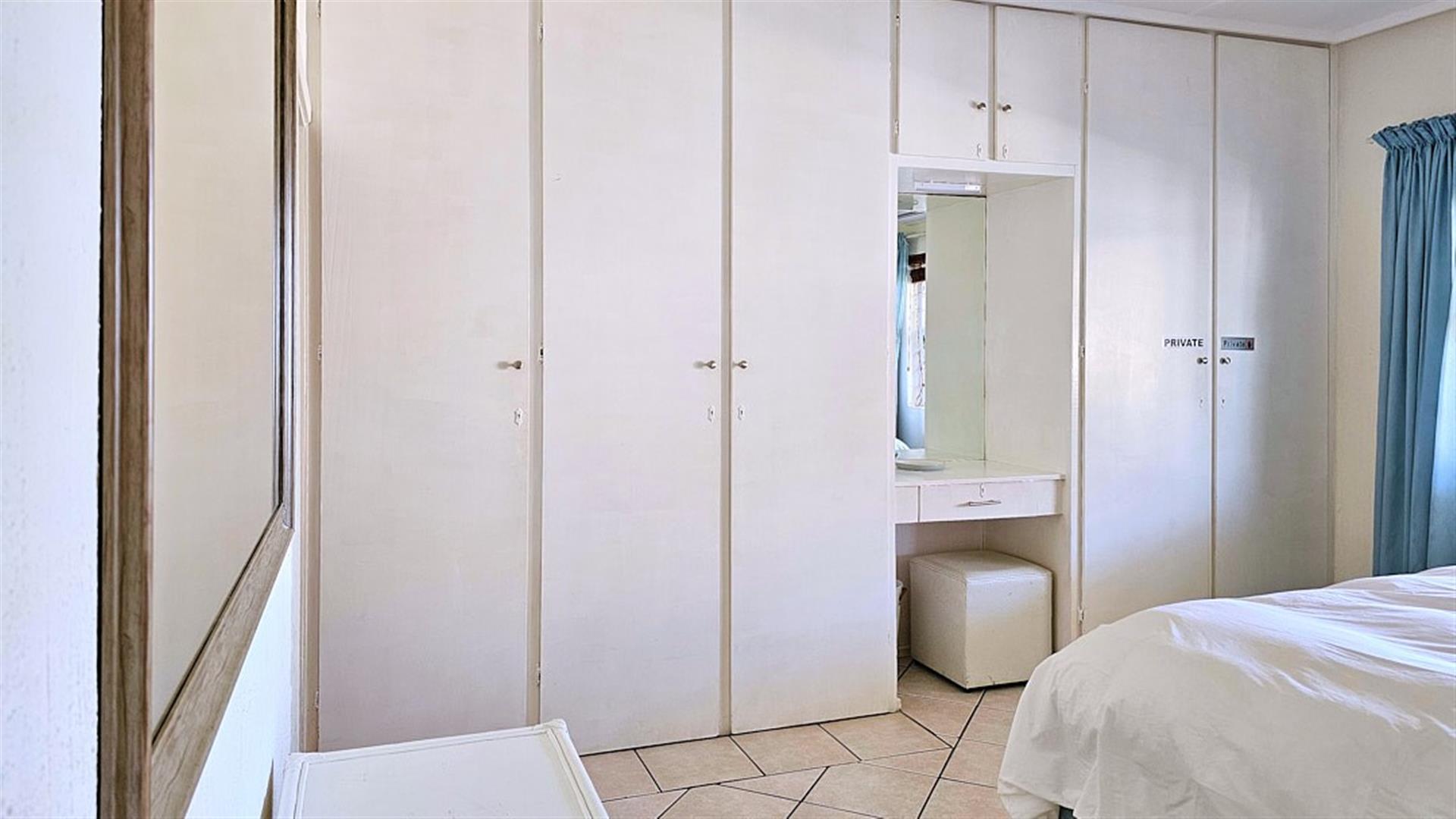 INVESTMENT BEACH Apartment JACKPOT!! AND PET FRIENDLY TOO! As you enter the PRISTINE, LIGHT open plan living/ dining/ kitchen area the intensity of the ocean takes your breath away. SEA VIEWS TO DIE FOR.....AND MORE SEA VIEWS TO LIVE FOR!!! Absolute BEACH BLISS! The apartment oozes a holiday vibe that is hard to find. Professionally decorated with quality furniture, the blue and white theme accentuates the closeness of the ocean. Filled with natural ight, the lounge area opens to an absolutely HUGE balcony, from where you can admire the ocean all day and night long. The florescent white of the waves will keep you enthralled as you relax before bedtime on the balcony. This balcony is a perfect entertainment area when you have friends over, with a built in REAL braai... what a bonus indeed!! The kitchen is spacious and light, shimmering white with same said, stunning sea views. It has all the appliances that you could possibly need. Beautiful!