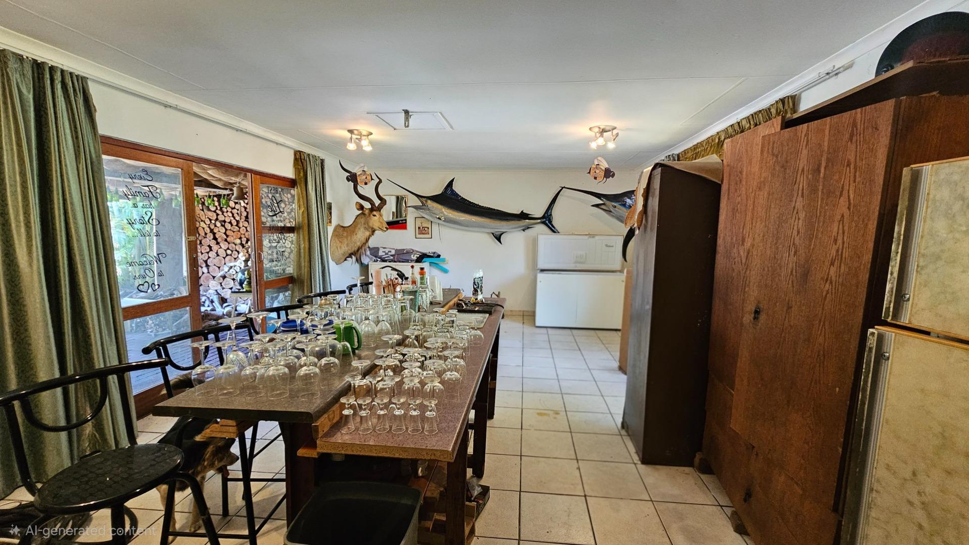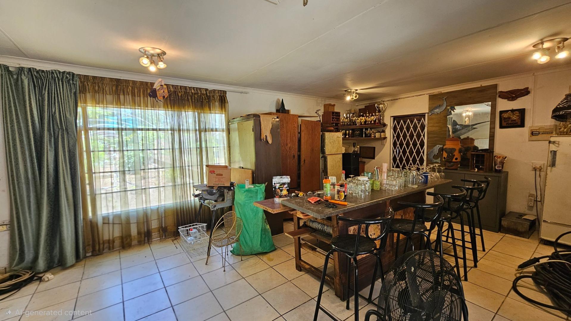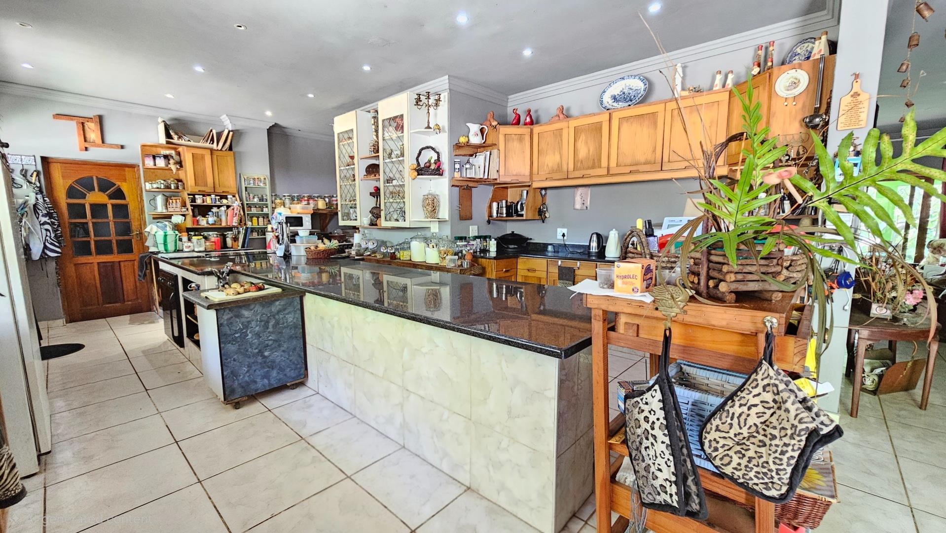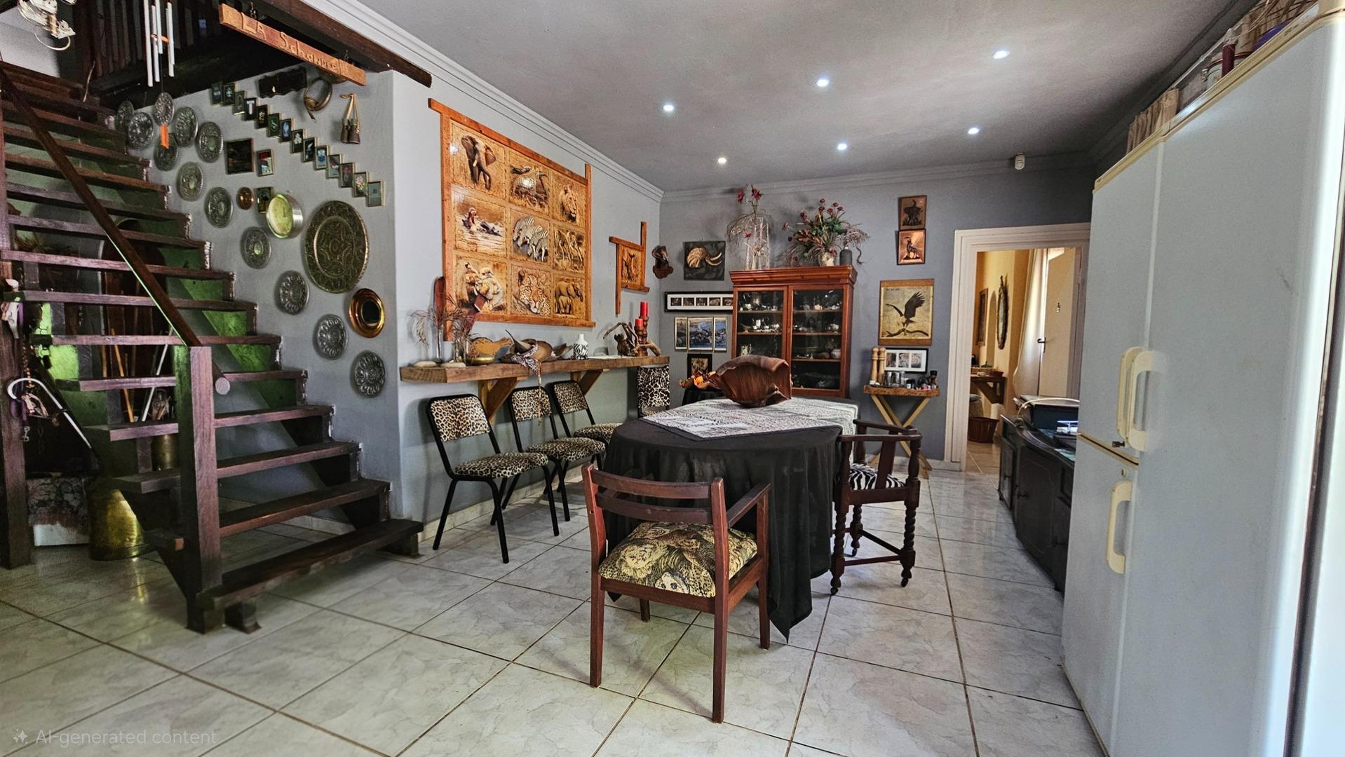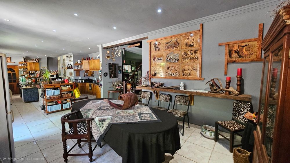 Set on a generous 8 921 m2 stand, this impressive farm-style property is surrounded by well-established gardens filled with mature trees, fruit trees, vegetable beds, and abundant greenery. You enter the home through a welcoming farmhouse kitchen that immediately showcases the size and character of the residence. This central living space offers extensive cupboard storage, a pantry, granite worktops, a prep basin, two under-counter ovens, a glass hob, and a large breakfast counter with seating for eight or more. There are connections for both a washing machine and dishwasher, and the garages provide direct access into the kitchen for added ease. The kitchen flows into a spacious dining room, where stairs lead to a flexible loft area ideal for storage, a home office, or an additional room.