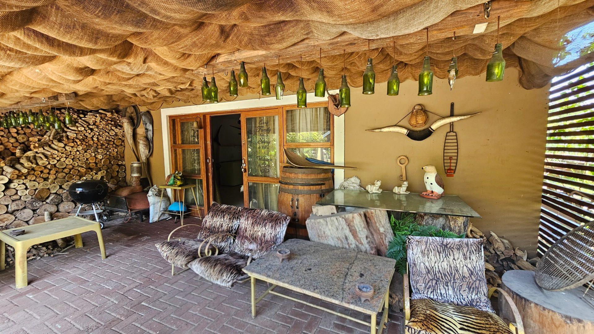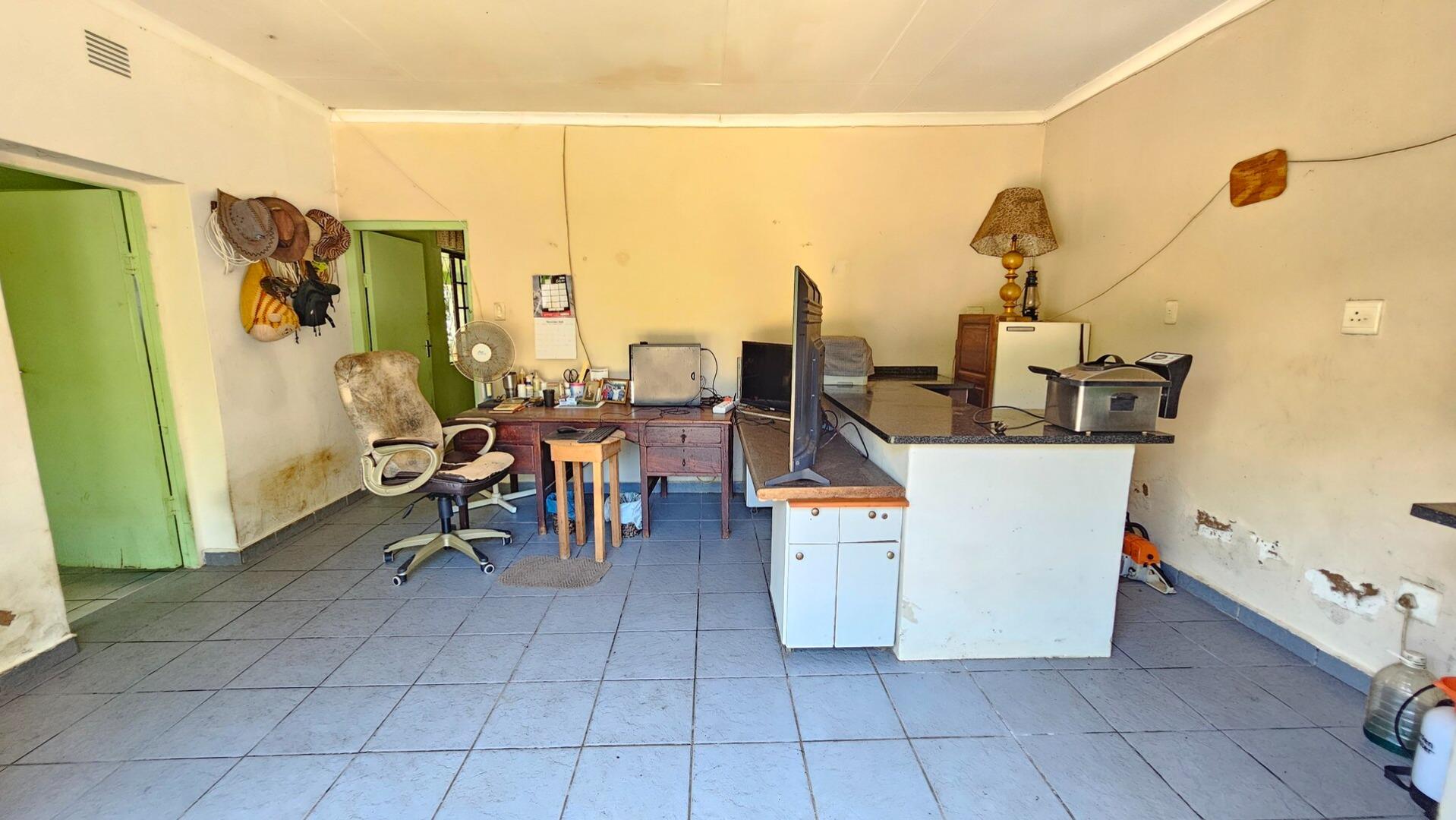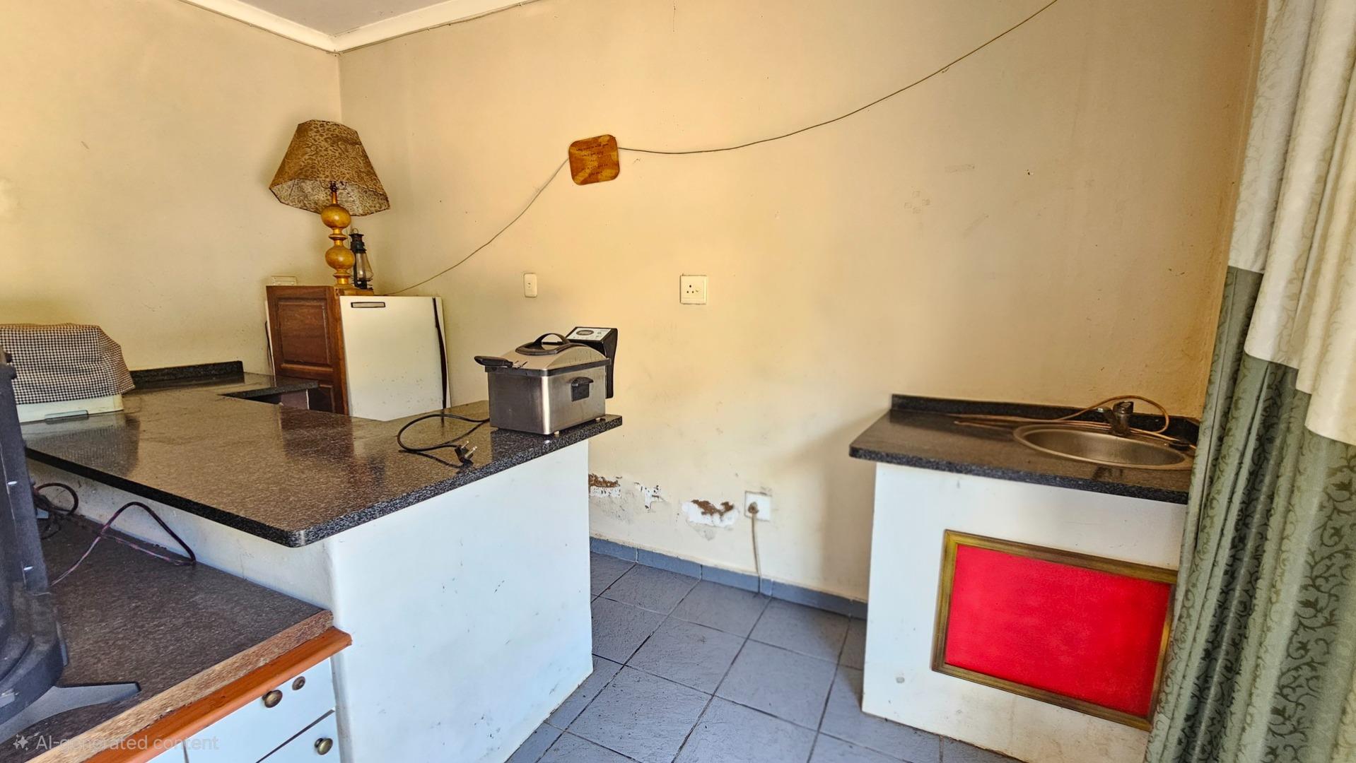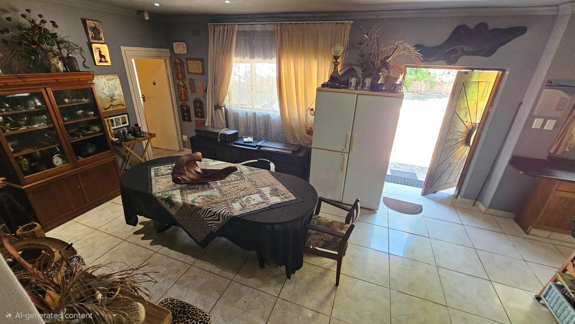Set on a generous 8 921 m2 stand, this impressive farm-style property is surrounded by well-established gardens filled with mature trees, fruit trees, vegetable beds, and abundant greenery. You enter the home through a welcoming farmhouse kitchen that immediately showcases the size and character of the residence. This central living space offers extensive cupboard storage, a pantry, granite worktops, a prep basin, two under-counter ovens, a glass hob, and a large breakfast counter with seating for eight or more. There are connections for both a washing machine and dishwasher, and the garages provide direct access into the kitchen for added ease. The kitchen flows into a spacious dining room, where stairs lead to a flexible loft area ideal for storage, a home office, or an additional room.