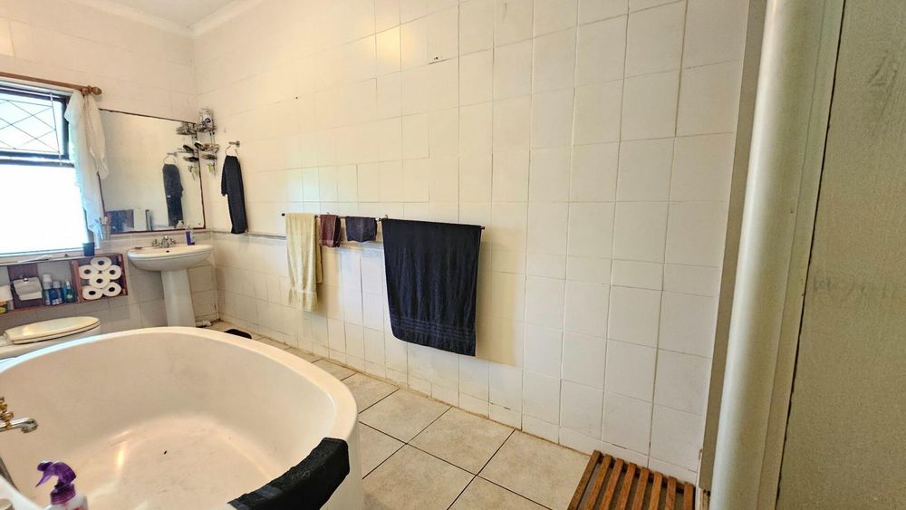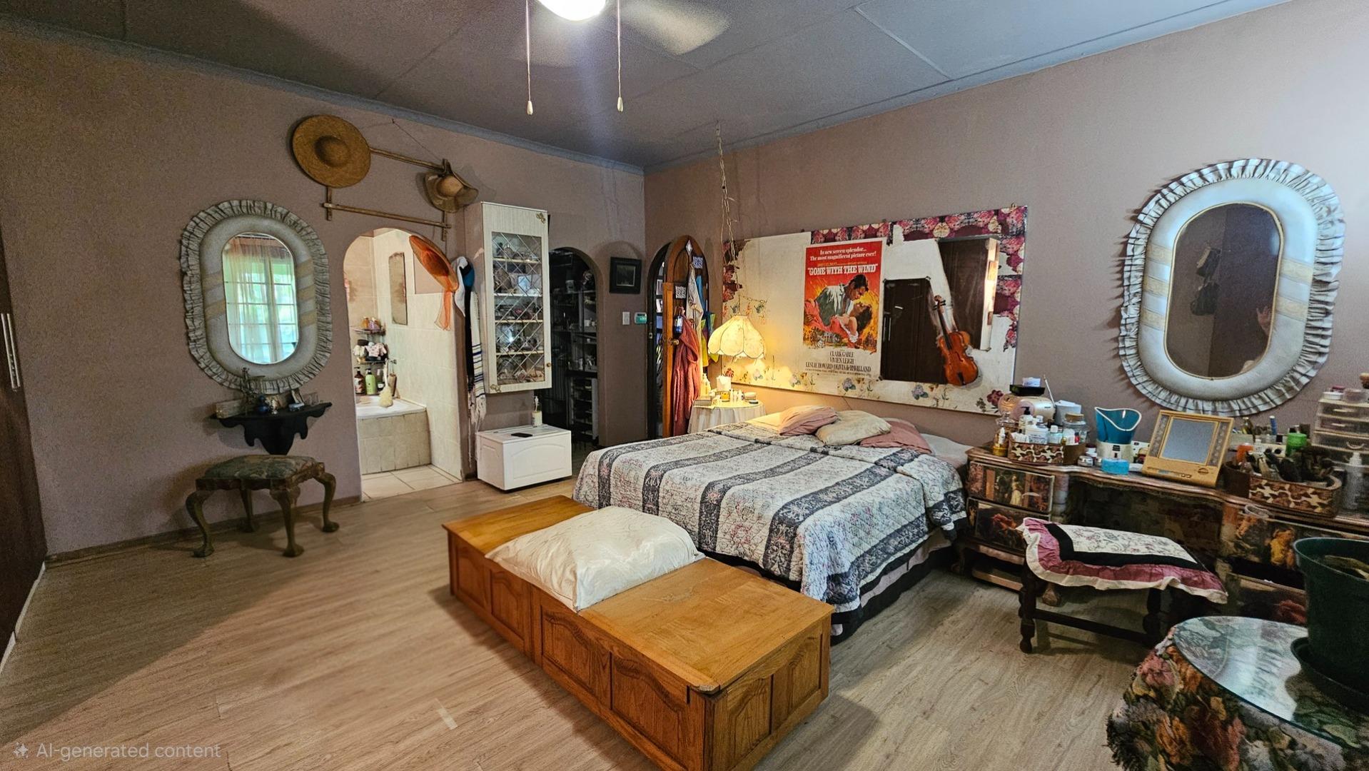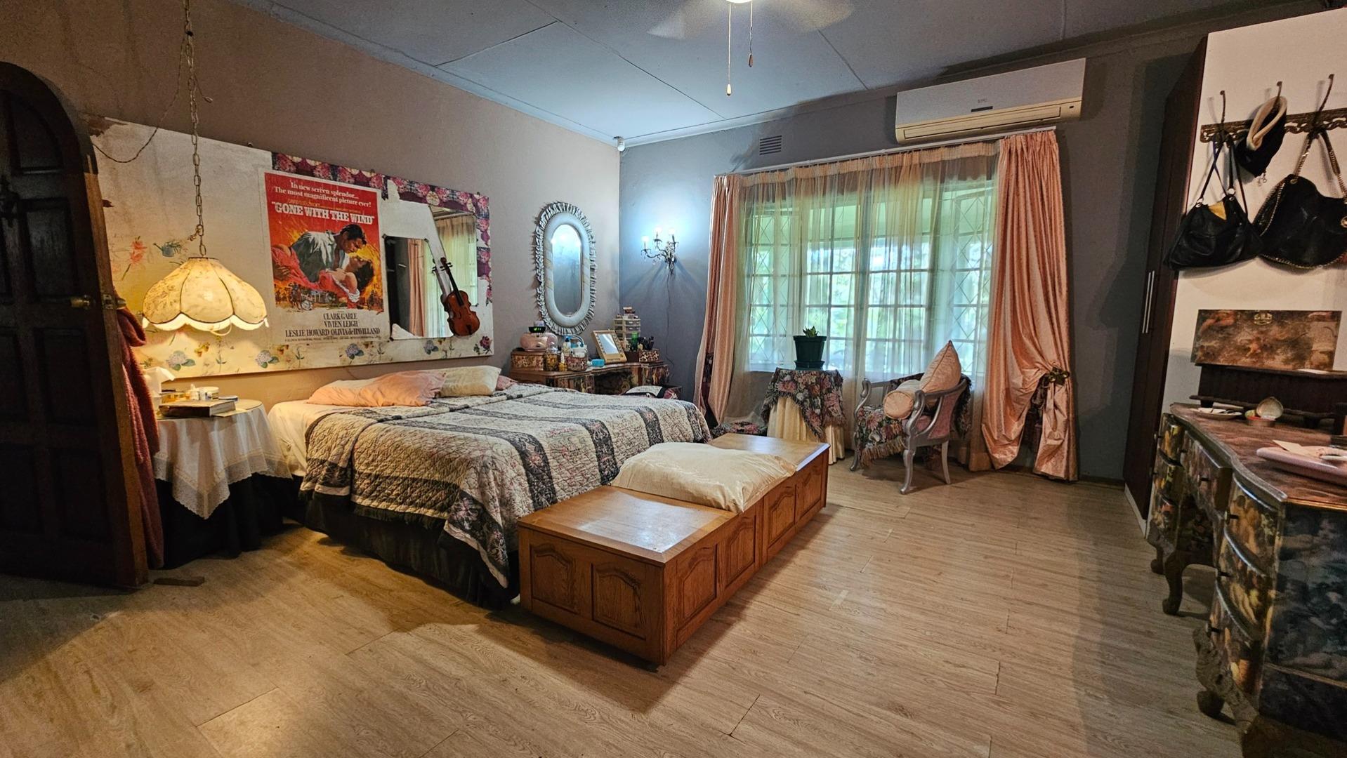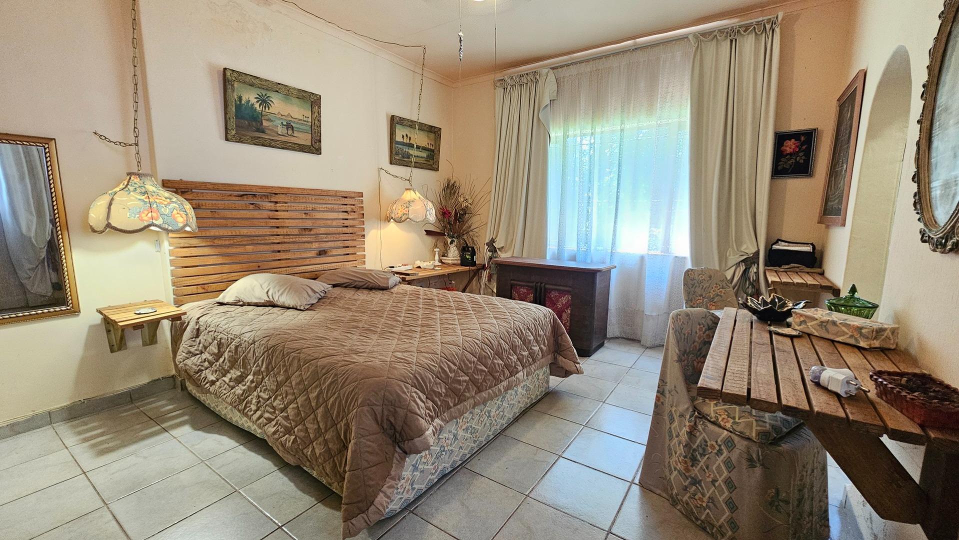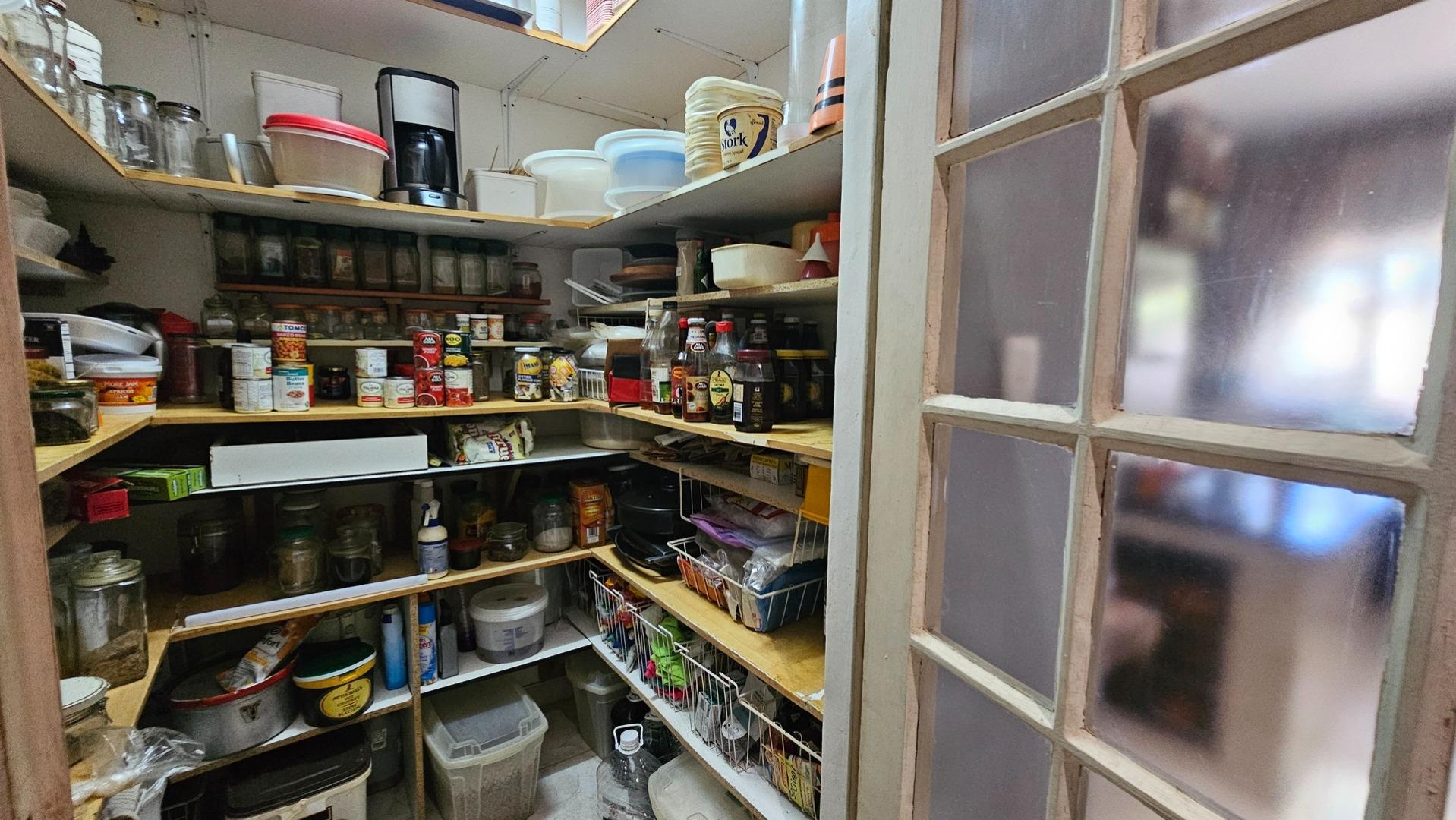 Set on a generous 8 921 m2 stand, this impressive farm-style property is surrounded by well-established gardens filled with mature trees, fruit trees, vegetable beds, and abundant greenery. You enter the home through a welcoming farmhouse kitchen that immediately showcases the size and character of the residence. This central living space offers extensive cupboard storage, a pantry, granite worktops, a prep basin, two under-counter ovens, a glass hob, and a large breakfast counter with seating for eight or more. There are connections for both a washing machine and dishwasher, and the garages provide direct access into the kitchen for added ease. The kitchen flows into a spacious dining room, where stairs lead to a flexible loft area ideal for storage, a home office, or an additional room.
