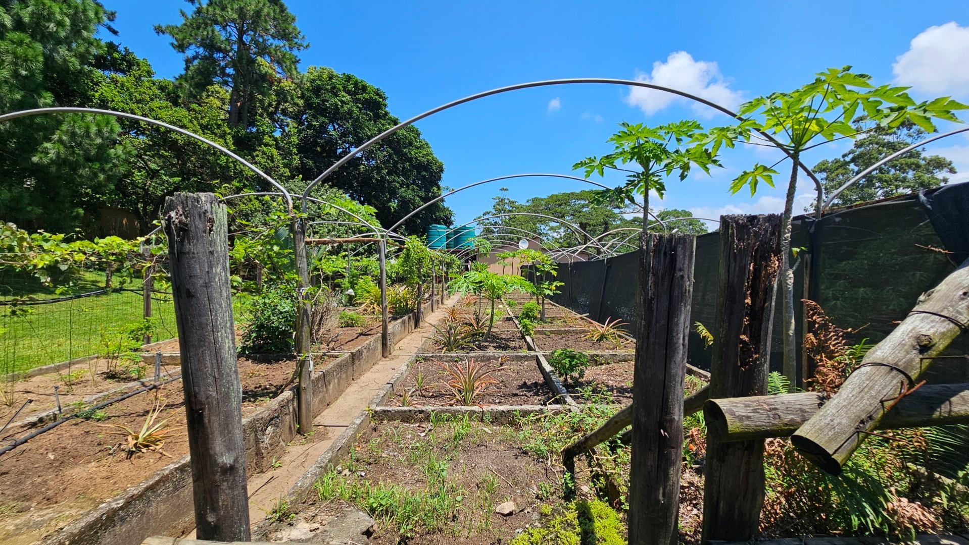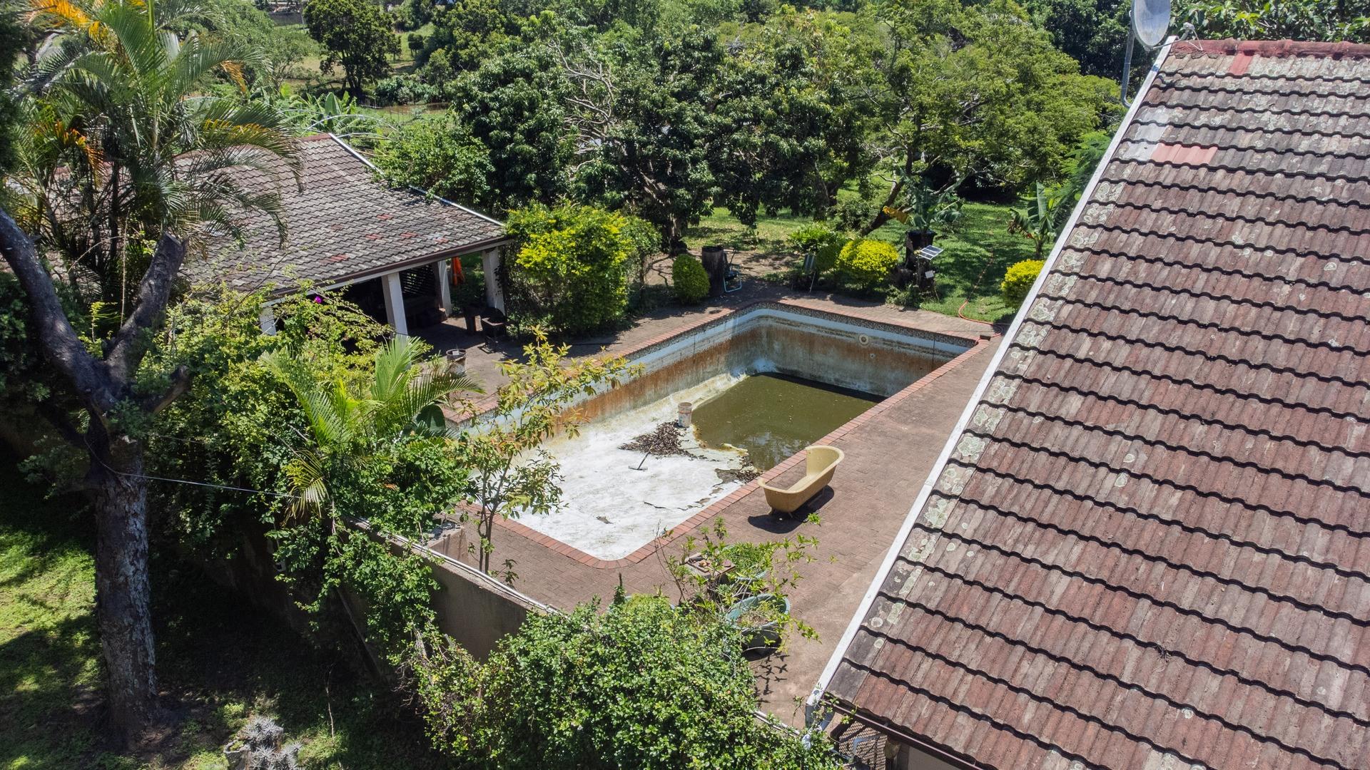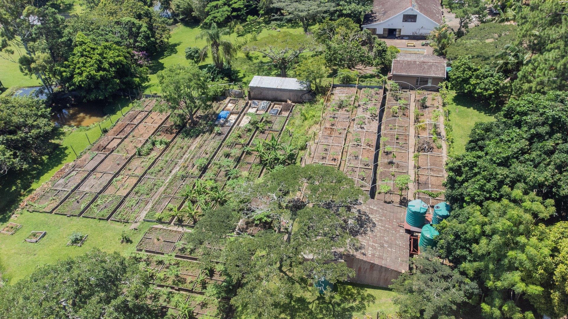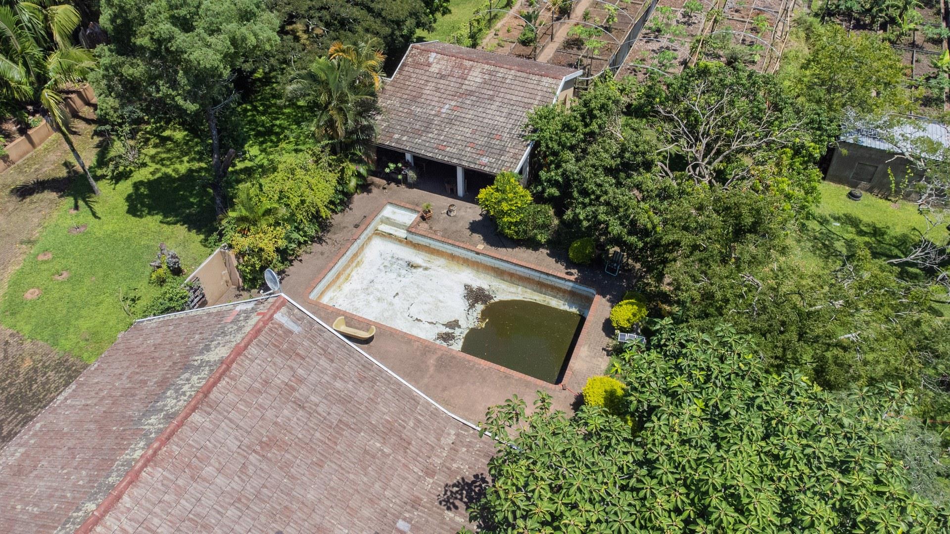 To the left of the patio, you will find the pool and entertainment area, which includes a sizeable swimming pool in need of attention and a generous enclosed entertainment room with excellent hosting potential. Ample parking makes accommodating guests easy. Water supply is a standout feature, with a borehole, three spring-fed dams, and four water tanks servicing the property. A large storeroom for garden equipment is located nearby, along with staff accommodation consisting of two bedrooms, a bathroom, and a small kitchen close to the vegetable garden.