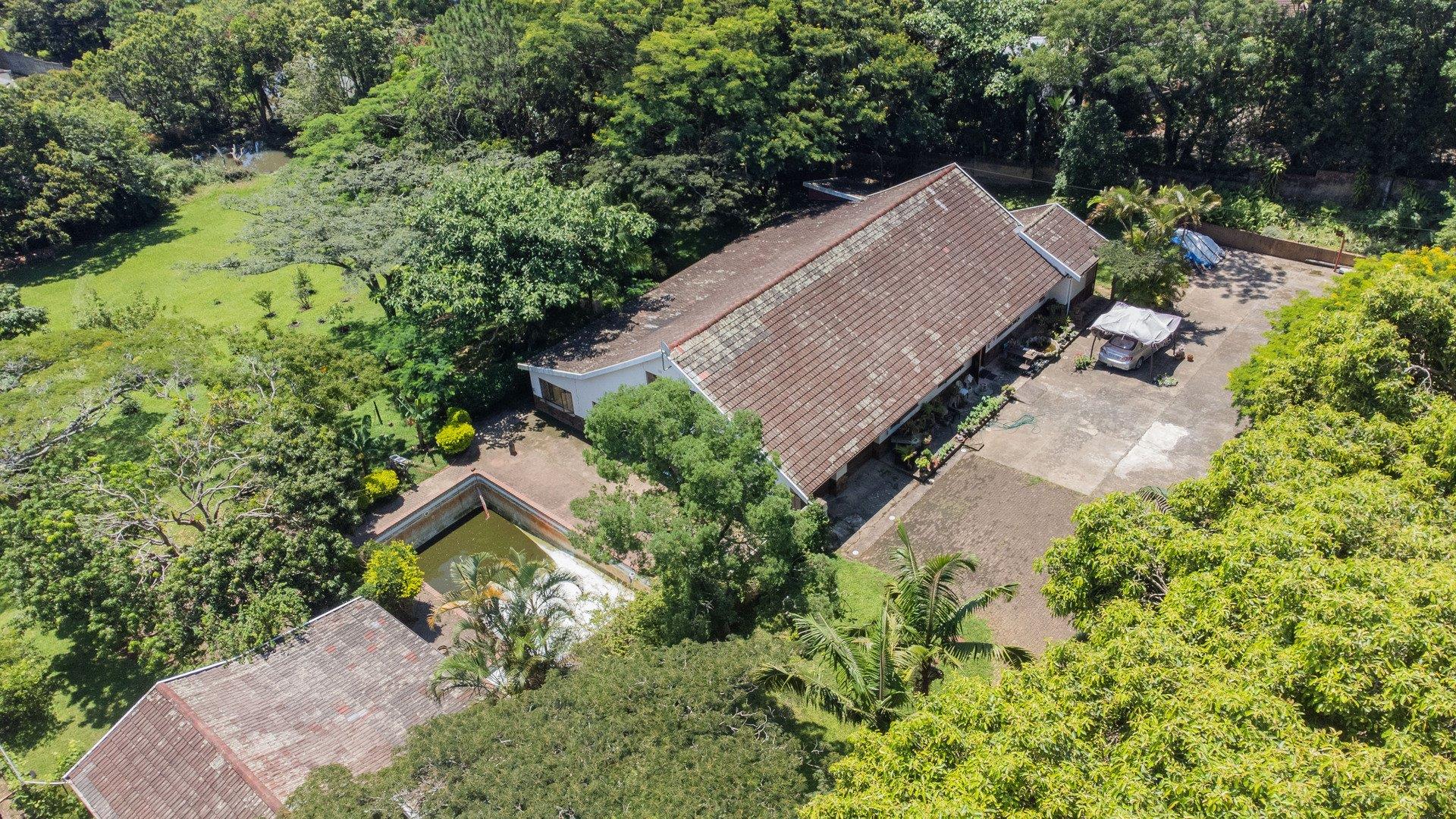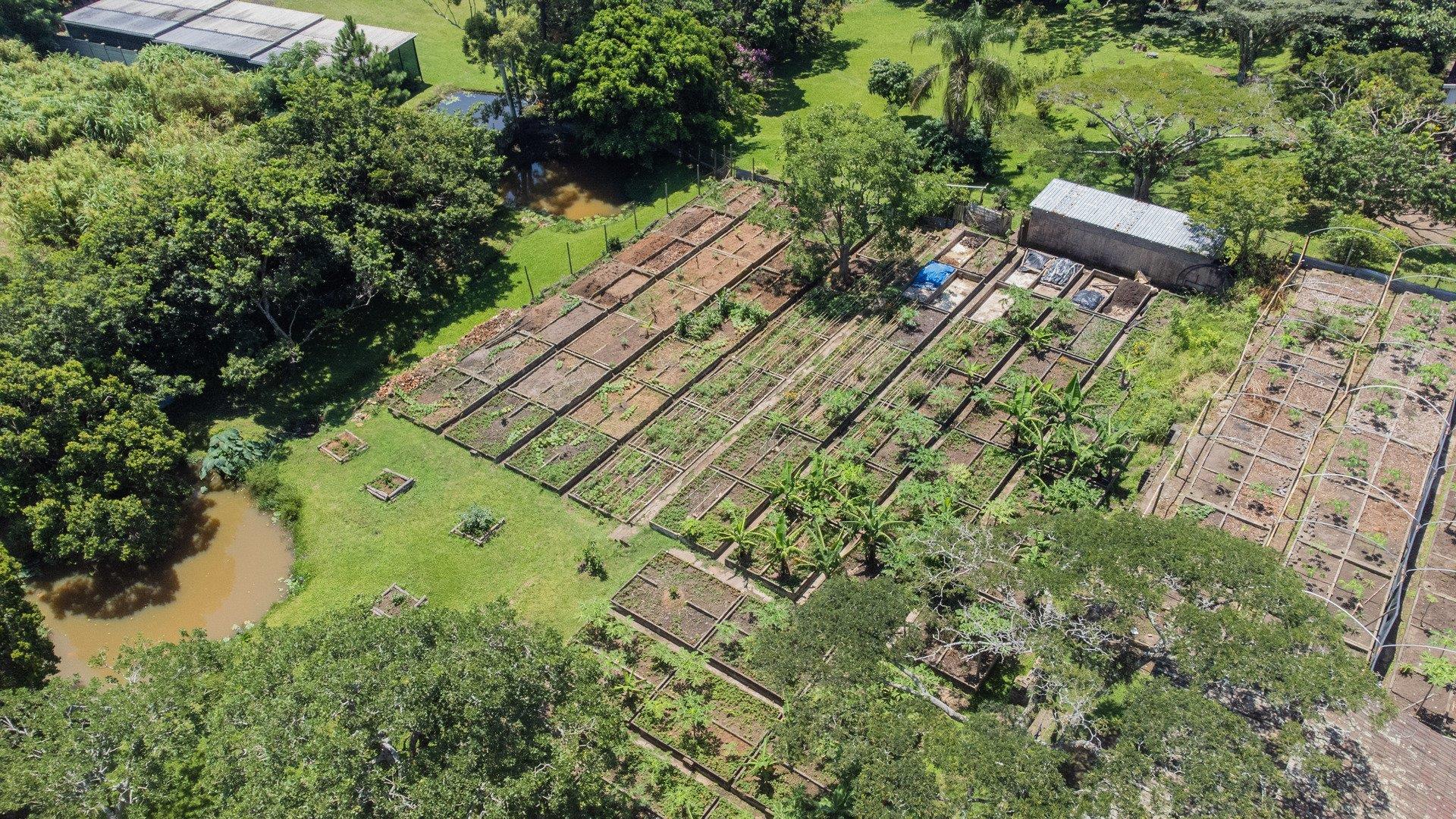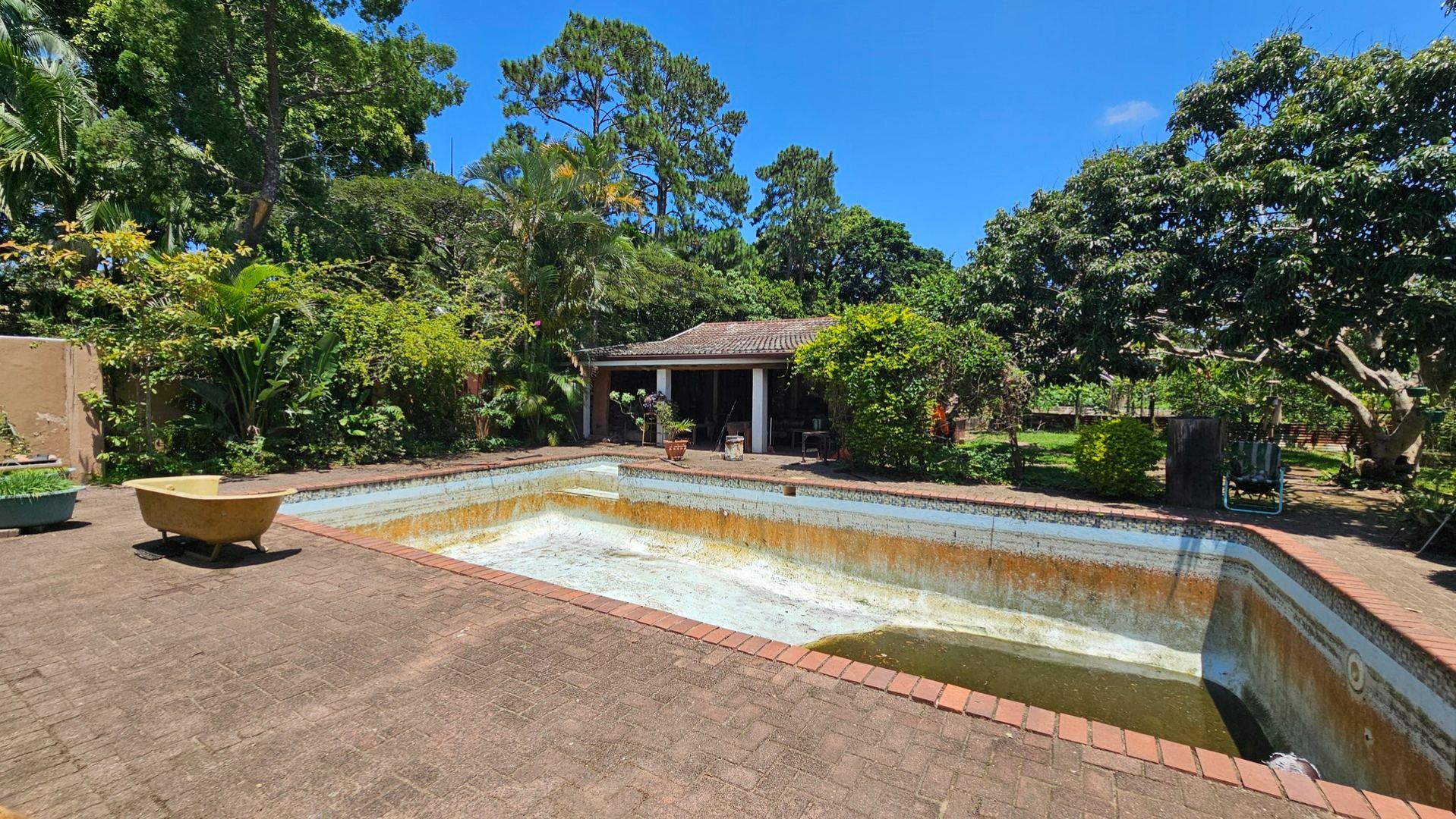 To the left of the patio, you will find the pool and entertainment area, which includes a sizeable swimming pool in need of attention and a generous enclosed entertainment room with excellent hosting potential. Ample parking makes accommodating guests easy. Water supply is a standout feature, with a borehole, three spring-fed dams, and four water tanks servicing the property. A large storeroom for garden equipment is located nearby, along with staff accommodation consisting of two bedrooms, a bathroom, and a small kitchen close to the vegetable garden.