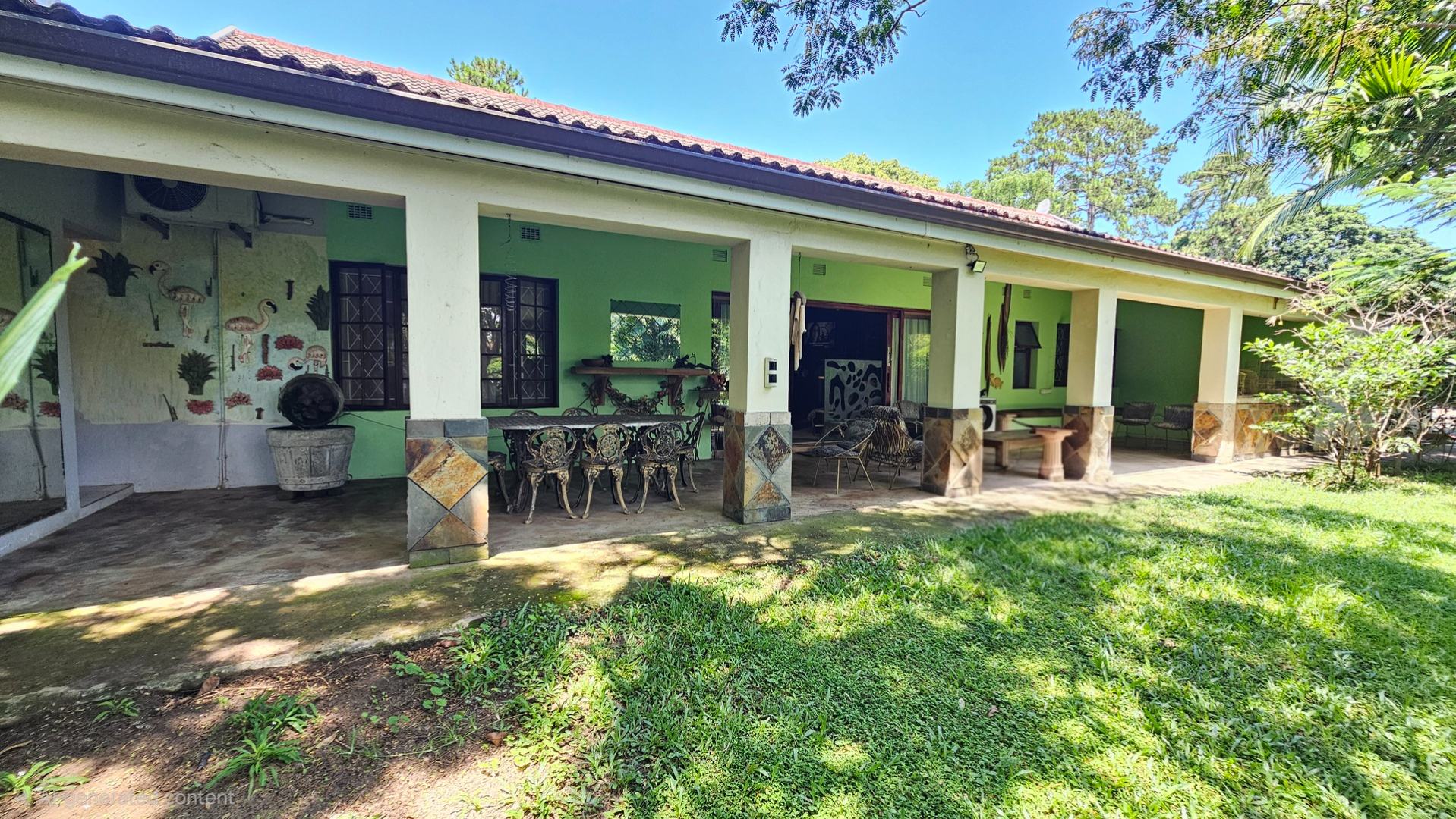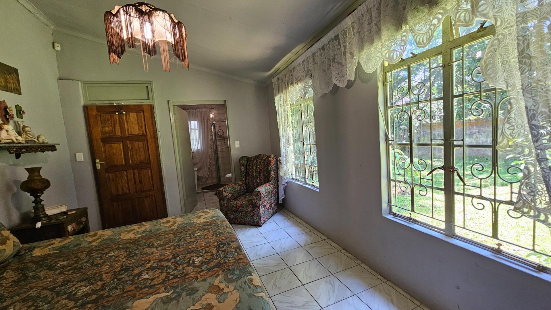 From the dining area, the home opens into an exceptionally large lounge, creating a bright and airy atmosphere. Sliding doors extend onto a full-length covered patio, perfect for entertaining or unwinding while enjoying the tranquil, countryside setting. The main house offers three en-suite bedrooms, while a separate two-bedroom flatlet includes its own en-suite bathrooms, kitchenette, and small lounge, making it well suited for extended family or rental income.