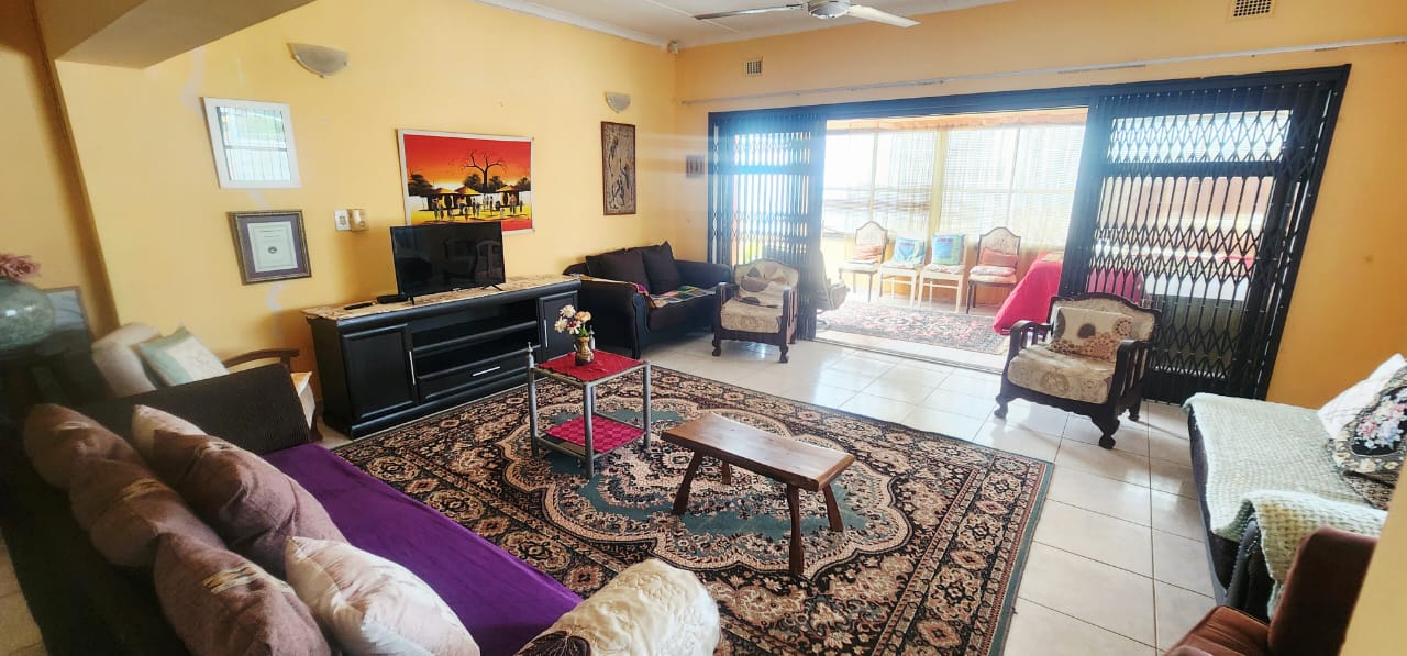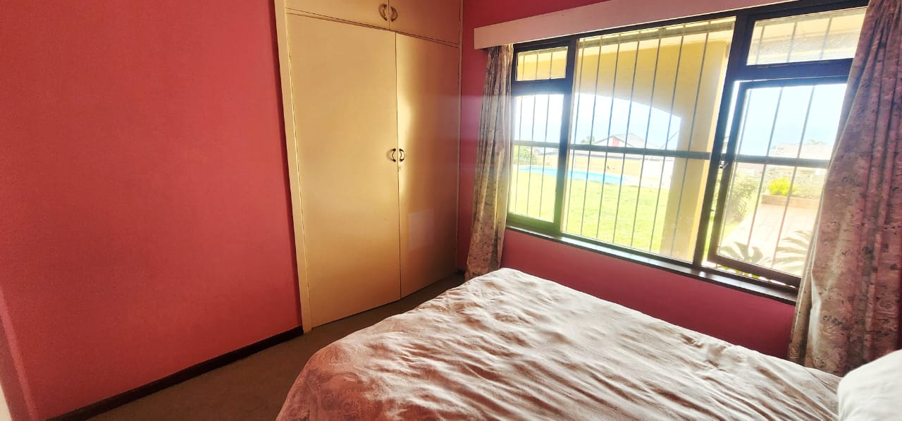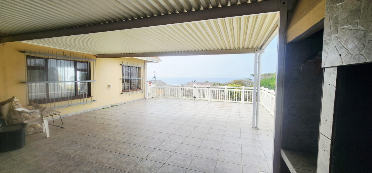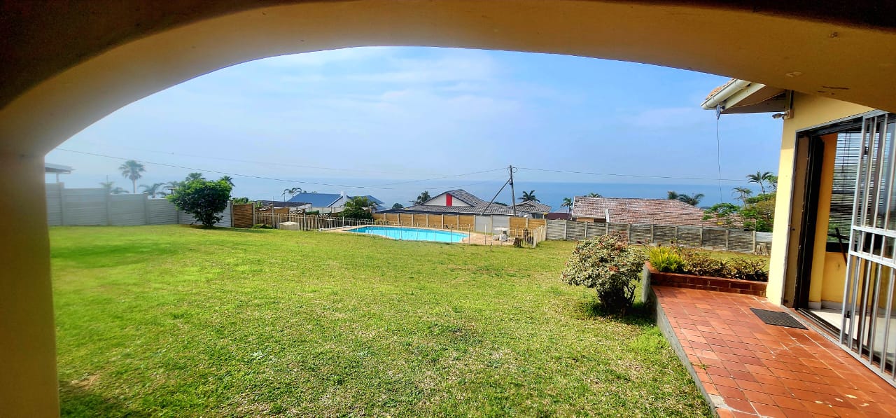 Boasting a lovely ocean view and set in a serene area of Uvongo, a short drive to Shelly Beach Malls, the local supermarket just down the road and the magical Uvongo Beach. The home is on a large portion of land with plenty of lawned areas flowing down to the large fenced swimming pool. The main home consists of 4 bedrooms (2 ensuite bathrooms) plus a family bathroom. The one ensuite bedroom has a separate entrance off the large covered entertainment patio with a built-in braai and lovely ocean view. The living area is open plan and consists of a large lounge and dining area (plenty of space for a home office) and these flow to the enclosed patio (sunroom) The kitchen is separate and has plenty of cupboard and counter space.