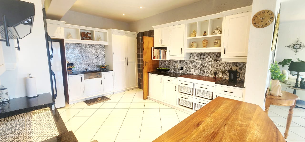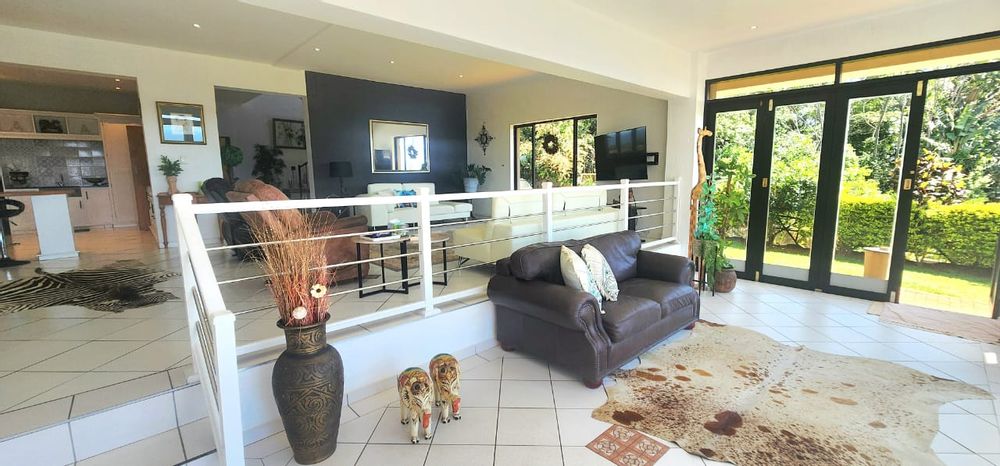 Perched on a hill in Uvongo, Commanding amazing ocean and surrounding views, is this amazing home, stylish and loved! A lovely portico entrance welcomes one, into the large entrance hall with vaulted ceilings and a dramatic stairway. Enter into the exceptionally large open plan living area, lounge, dining and stunning kitchen with granite and wooden tops, breakfast counter and separate scullery and laundry. This area steps down to another lounging area, with stacker doors opening to the pool deck and entertainment lapa, all with the 'view.' Down the passage are 3 large bedrooms (one ensuite) plus a family bathroom. On the upper level is a landing overlooking the entrance hall, to the one side is a coffee station or office and to the other is the large main, with stunning ensuite bathroom and lots of cupboard space. This bedroom opens to the private balcony with ocean views and a gym or office room. There is a double garage with an automated door leading directly into the home, a solar system, back-up water tanks and a lovely garden. This home is stunning and move in ready!
