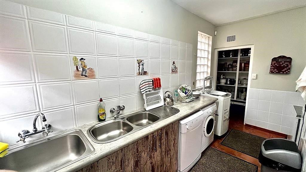 An open plan kitchen with breakfast nook, ample cupboard space, gas hob with extra fan, double electric oven, separate scullery and laundry area with large pantry.