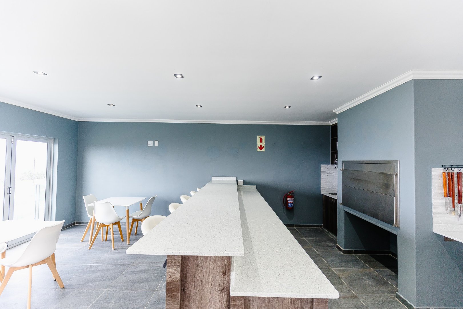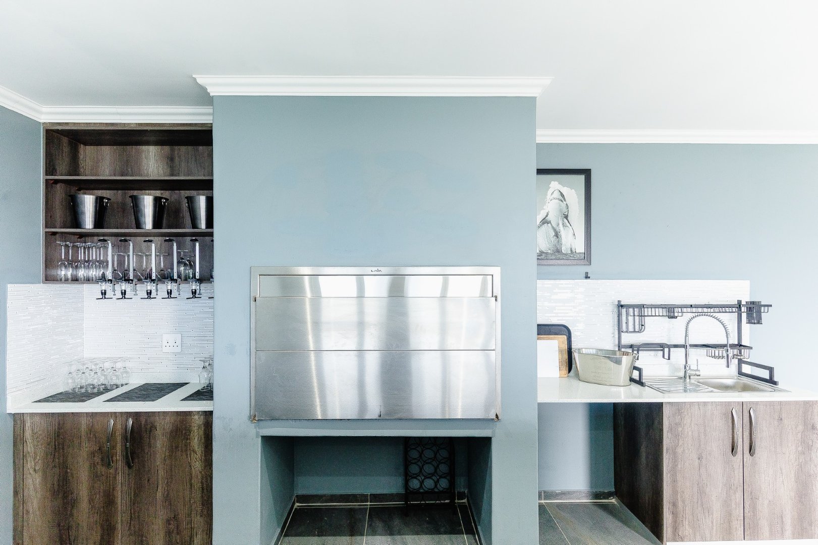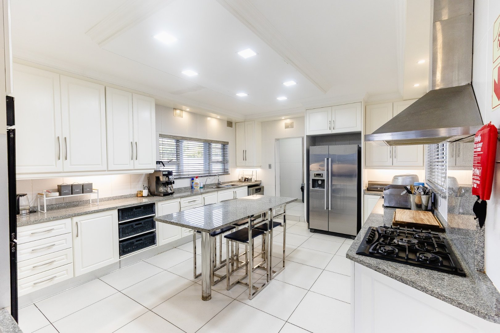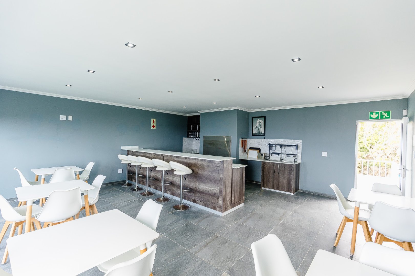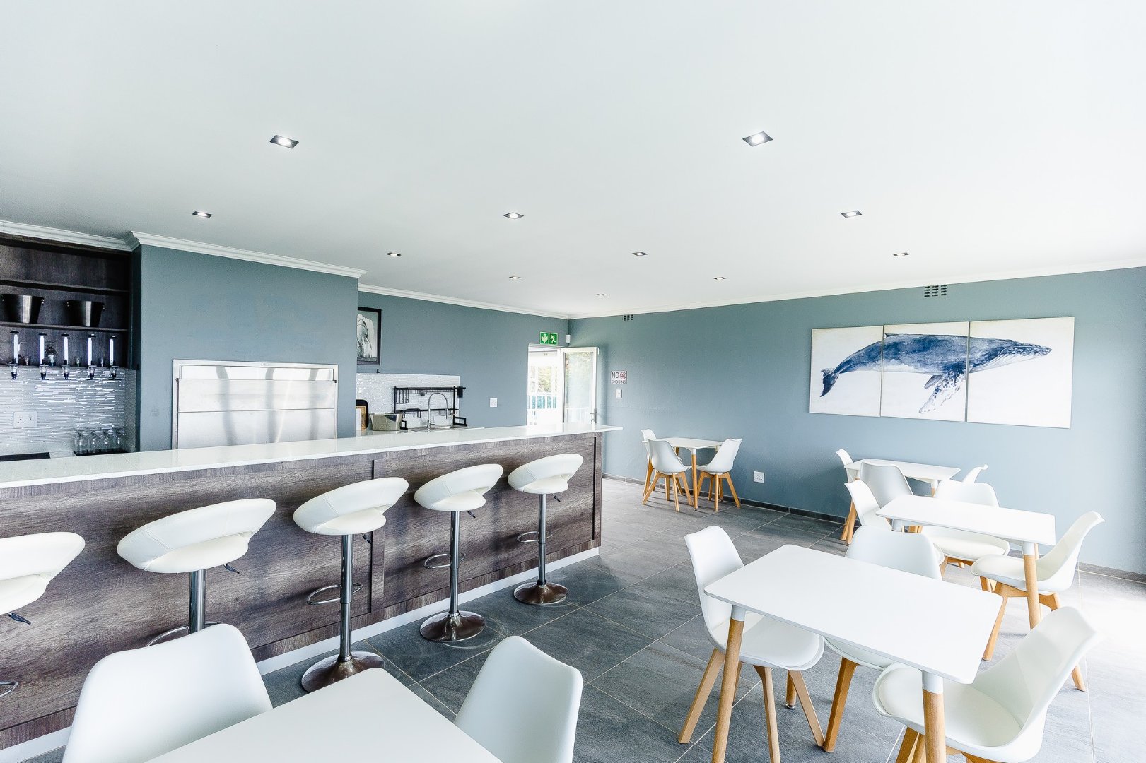 The open-plan living area leads out to a patio and beautifully designed outdoor entertainment area, featuring a built-in braai – ideal for relaxing and entertaining. Upstairs, discover another comfortable lounge alongside a stylish bar and entertainment room, while downstairs offers a second entertainment room for even more hosting options.