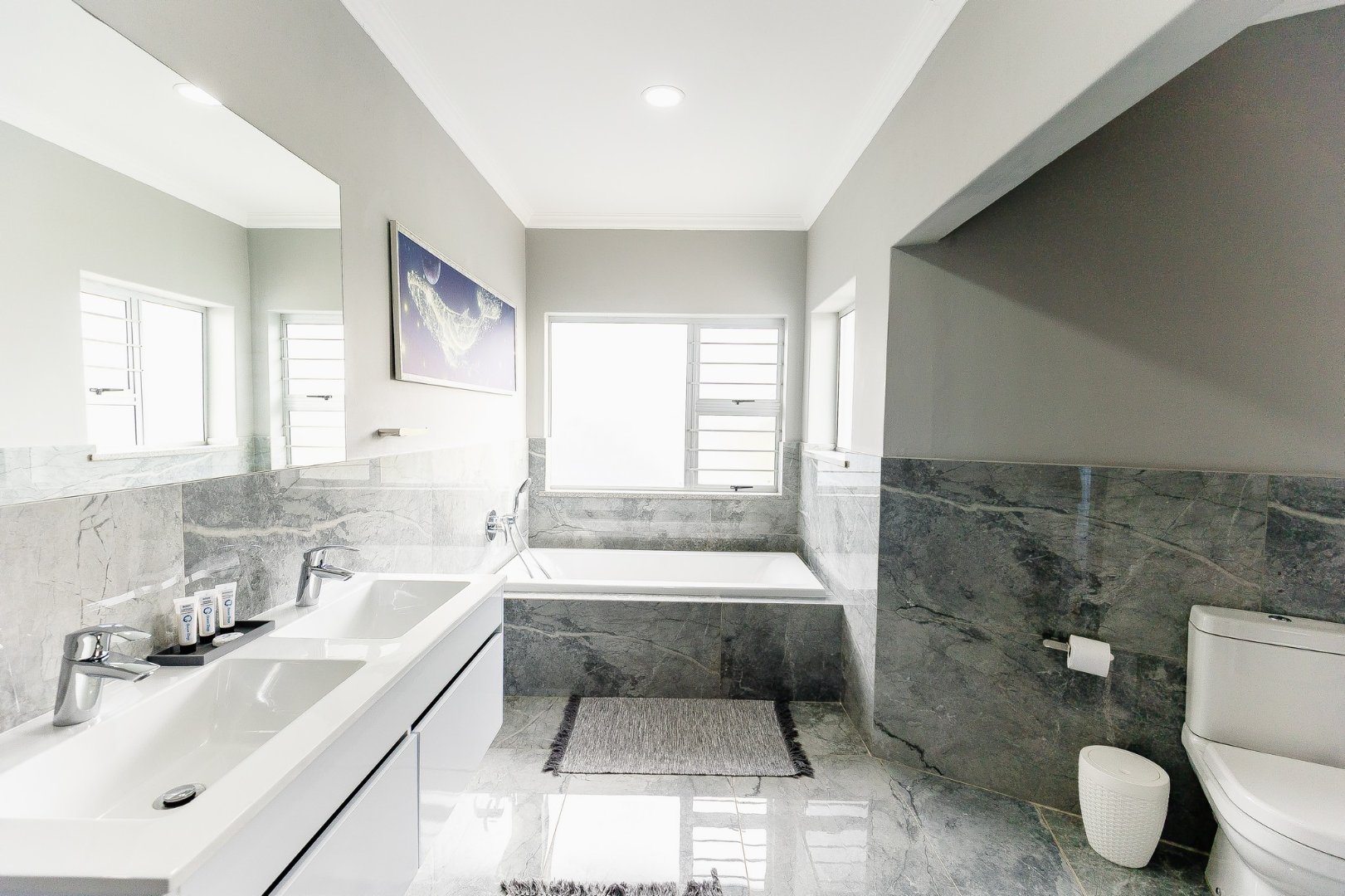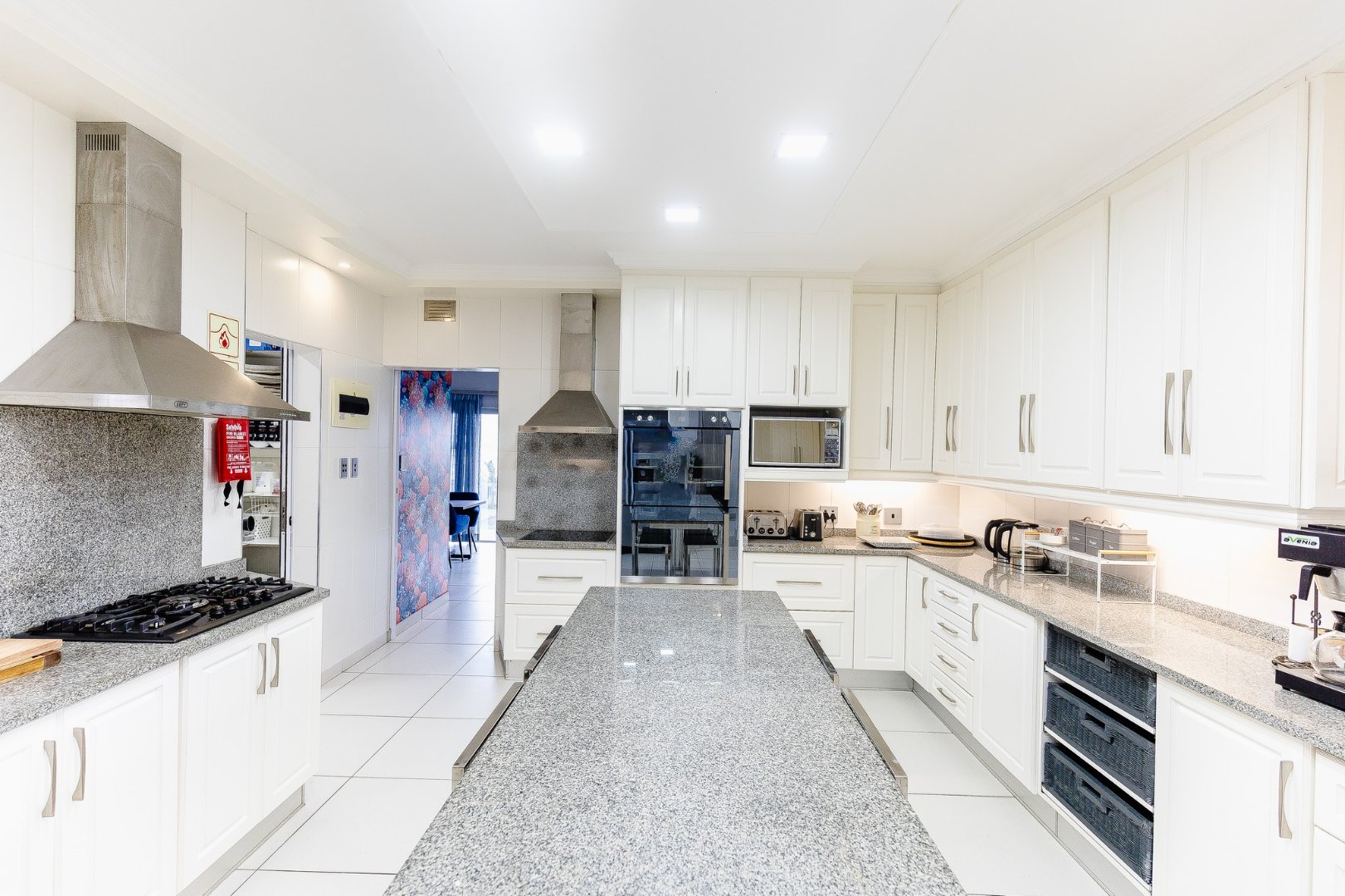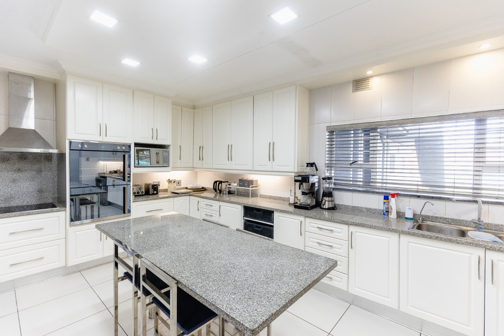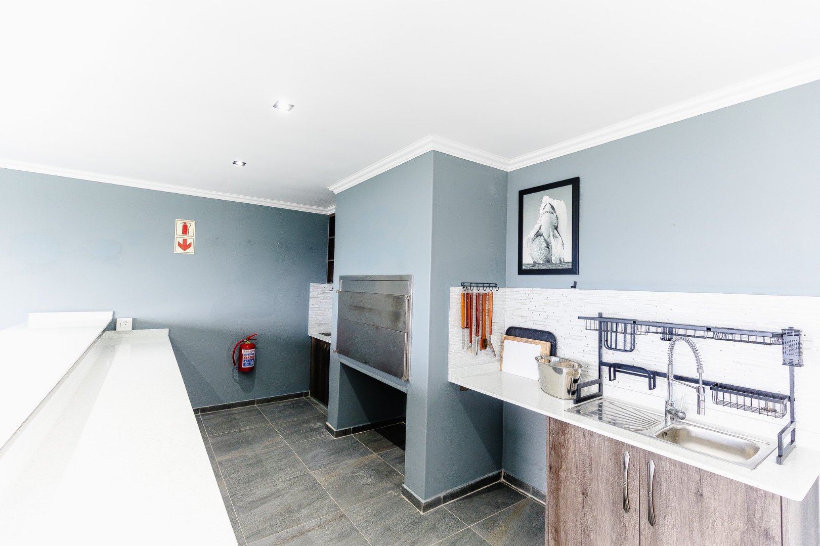 The open-plan living area leads out to a patio and beautifully designed outdoor entertainment area, featuring a built-in braai – ideal for relaxing and entertaining. Upstairs, discover another comfortable lounge alongside a stylish bar and entertainment room, while downstairs offers a second entertainment room for even more hosting options.