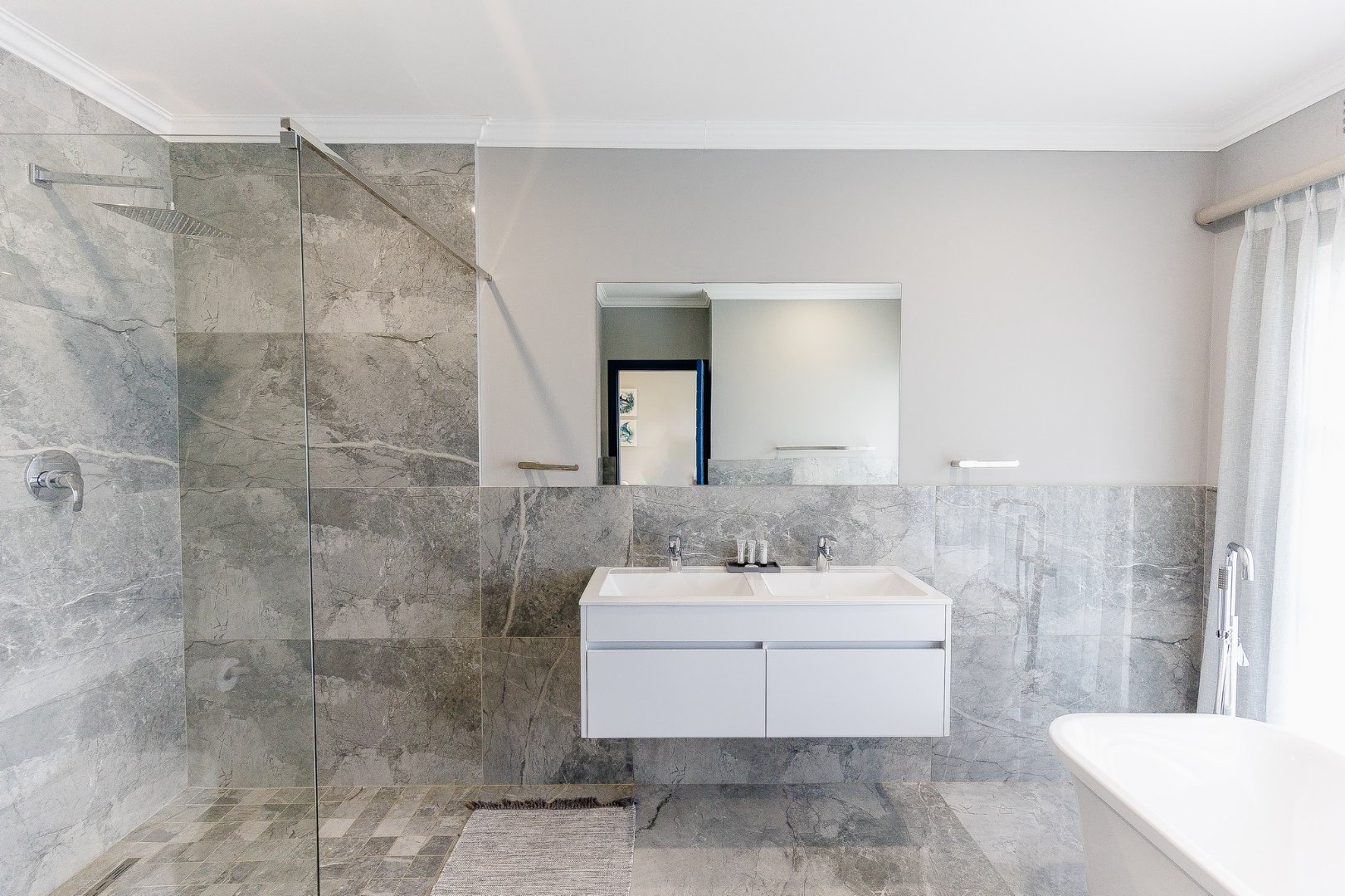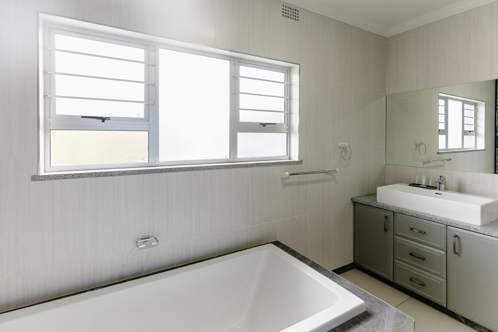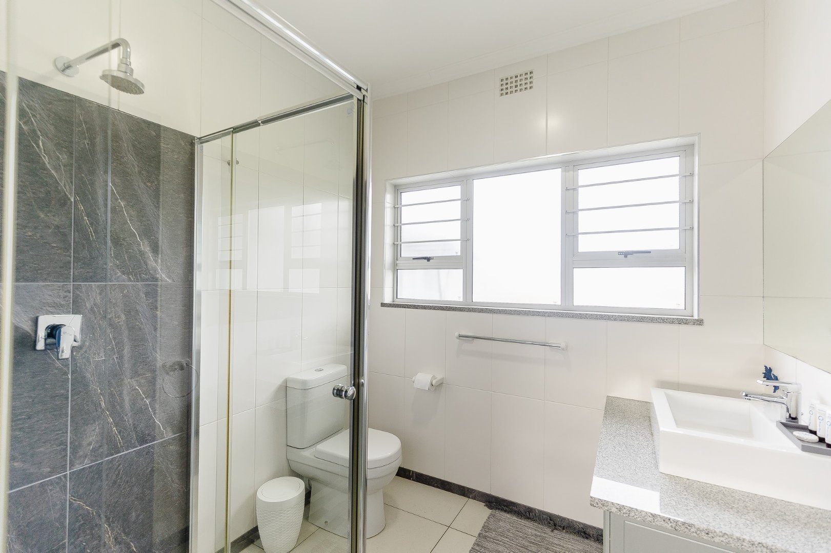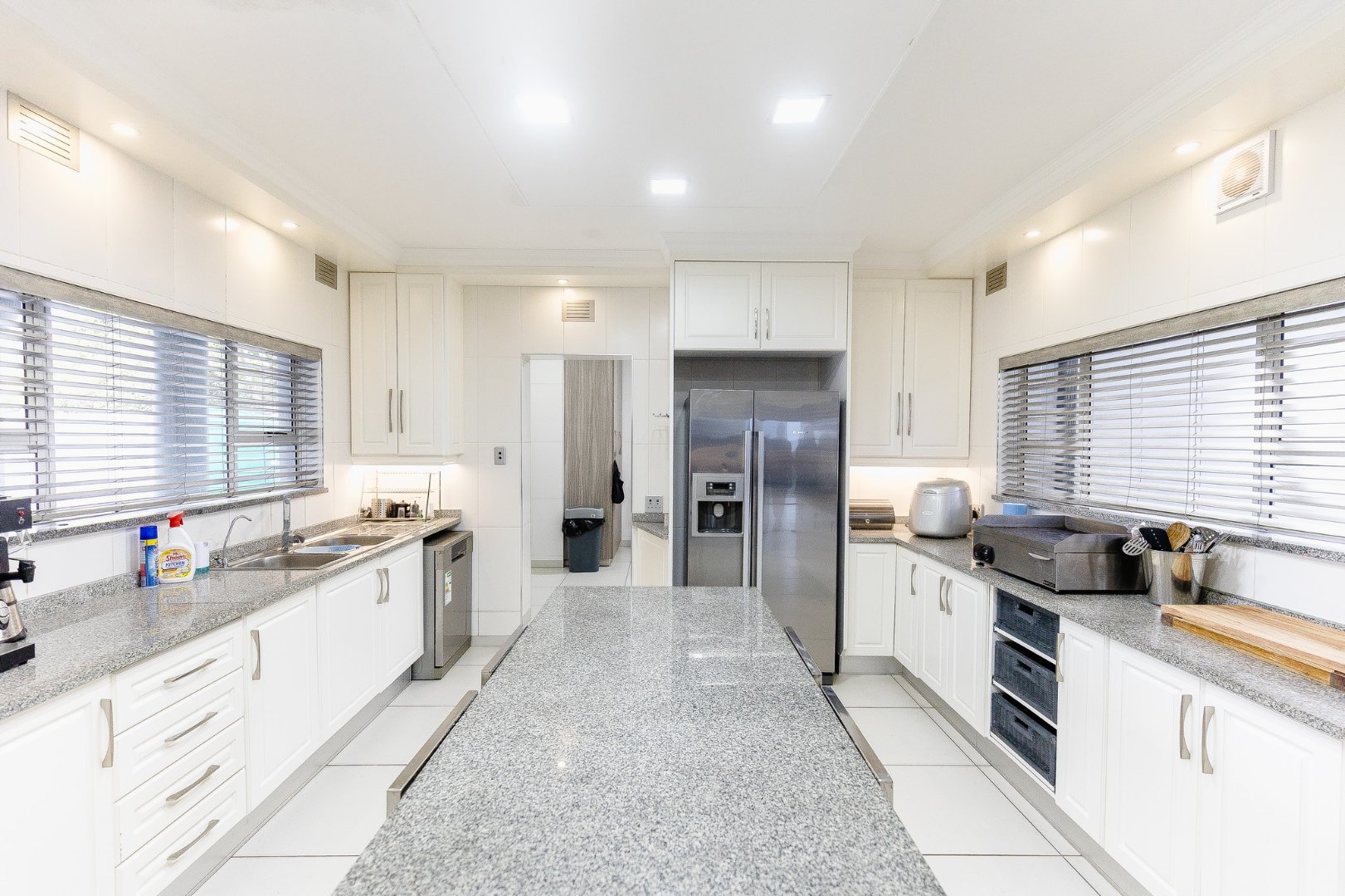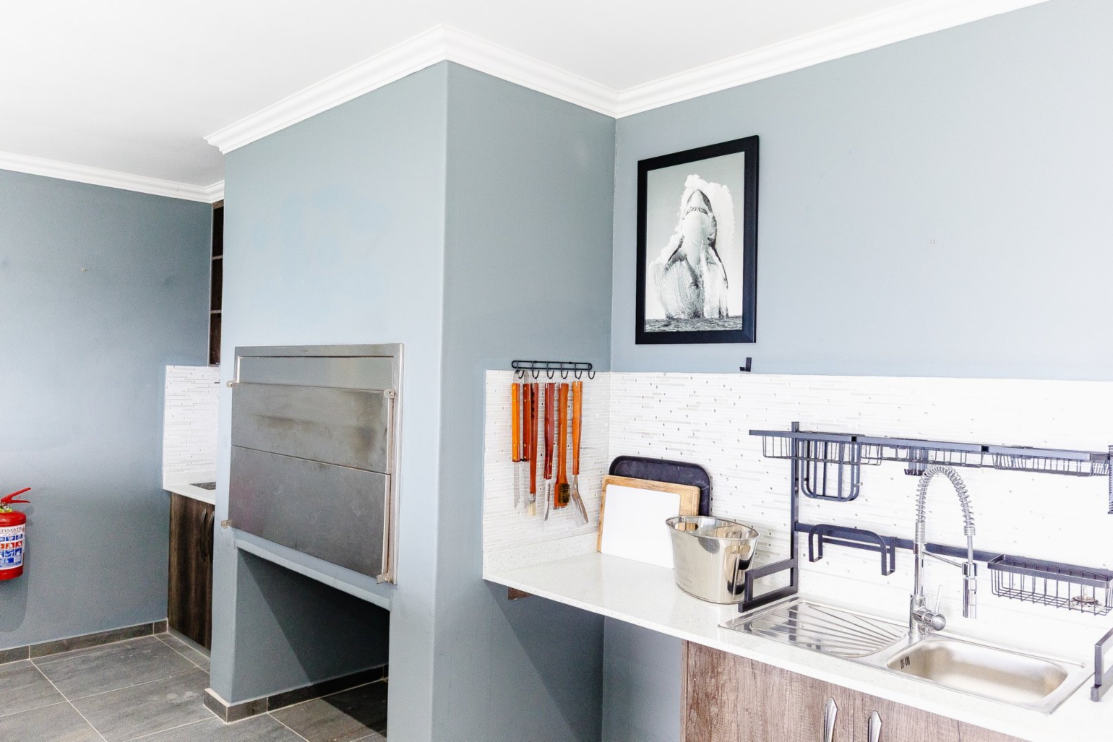 The open-plan living area leads out to a patio and beautifully designed outdoor entertainment area, featuring a built-in braai – ideal for relaxing and entertaining. Upstairs, discover another comfortable lounge alongside a stylish bar and entertainment room, while downstairs offers a second entertainment room for even more hosting options.