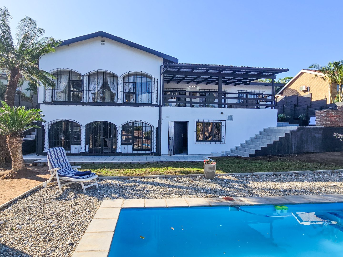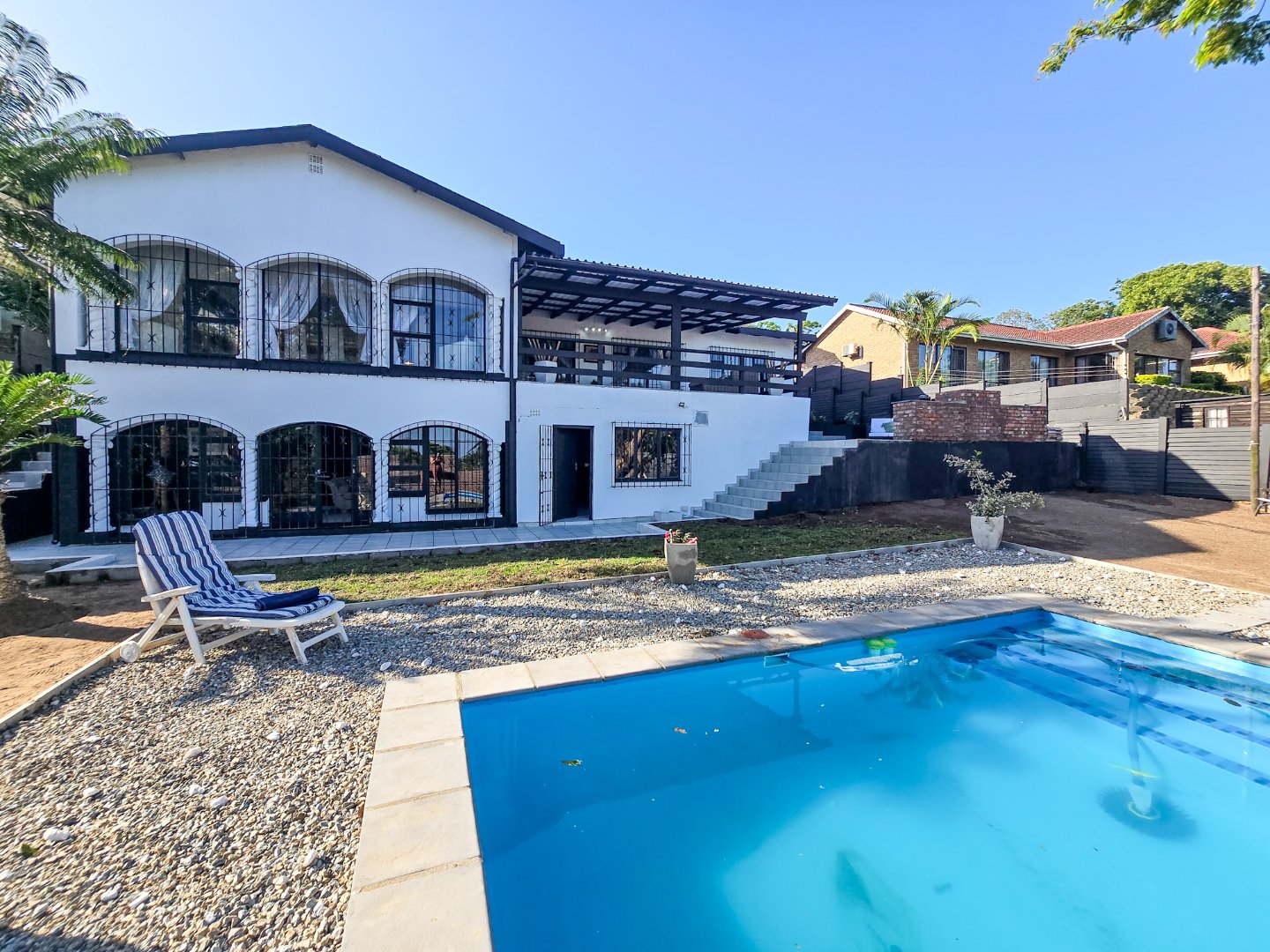 Step outside to a appealing pool area adjacent to the entertainment space, perfect for sun-drenched afternoons and relaxed gatherings. An enclosed patio off the living area extends your living space for all-season enjoyment, and another large entertainment level features a built-in braai for memorable get-togethers with family and friends. The property also includes three garages for secure parking and storage, plus staff quarters and additional storage to suit a busy household.