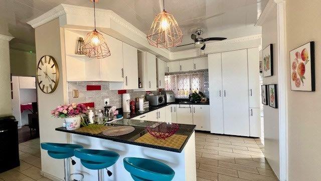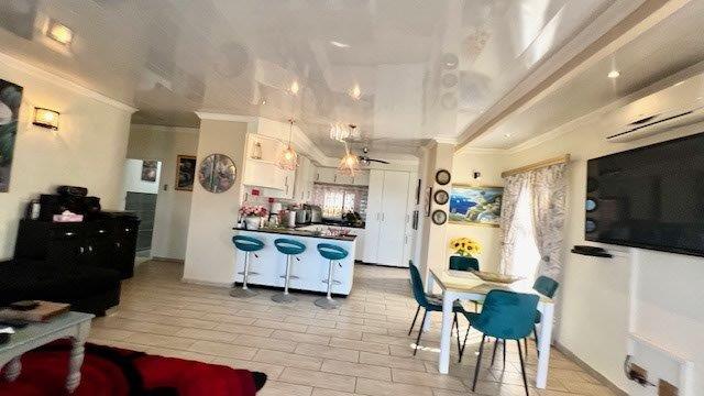 The living area leads to the kitchen with only the best finishing touches with granite tops, breakfast counter, large working space, there is a scullery and laundry area, the kitchen also has an air-conditioner fitted.