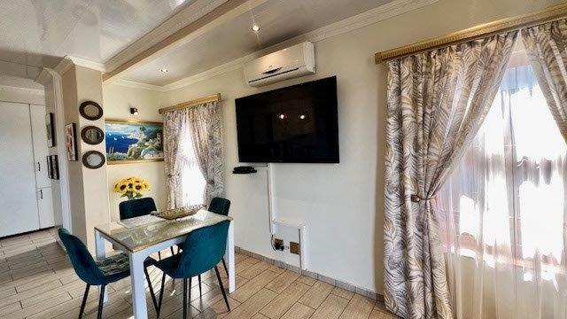 This home boasts a spacious open plan living area that has sliding doors that open onto a very large, covered balcony where there is a built-in braai area and bar area, this overlooks the pool area and from this area you have such amazing sea-views, the lounge has an air-conditioner.