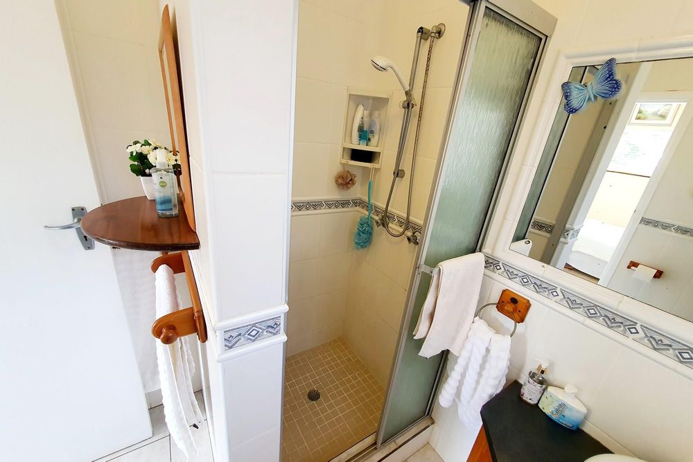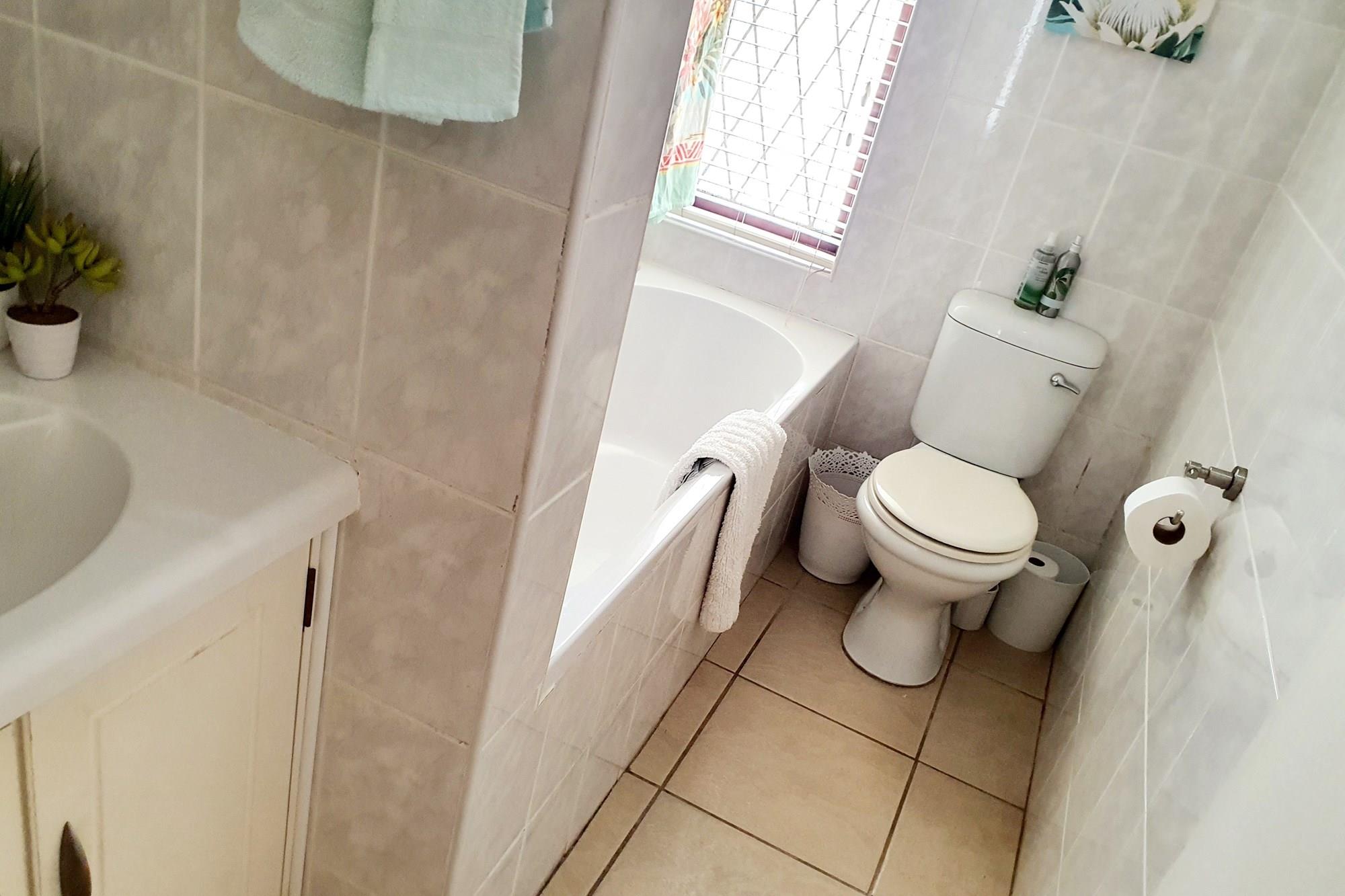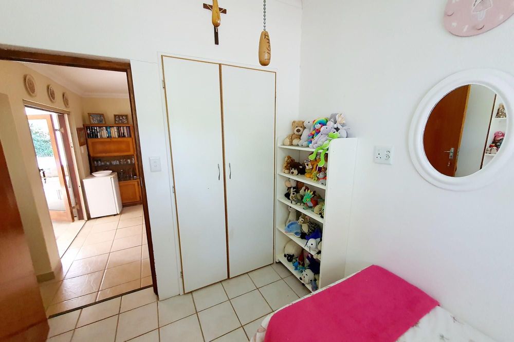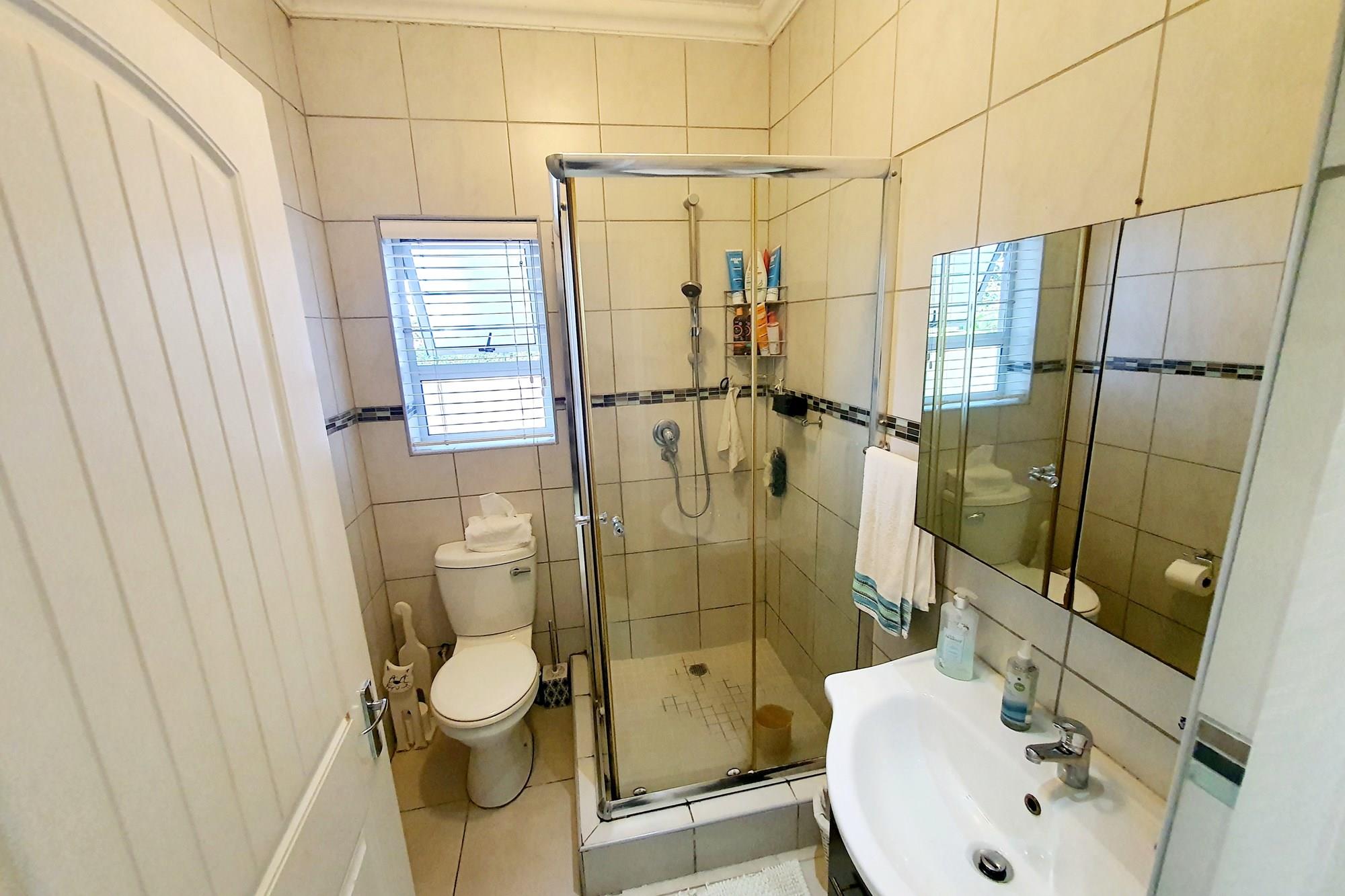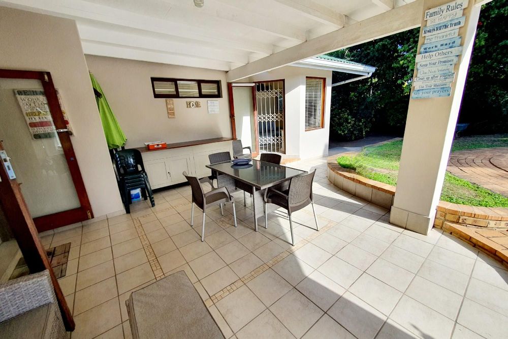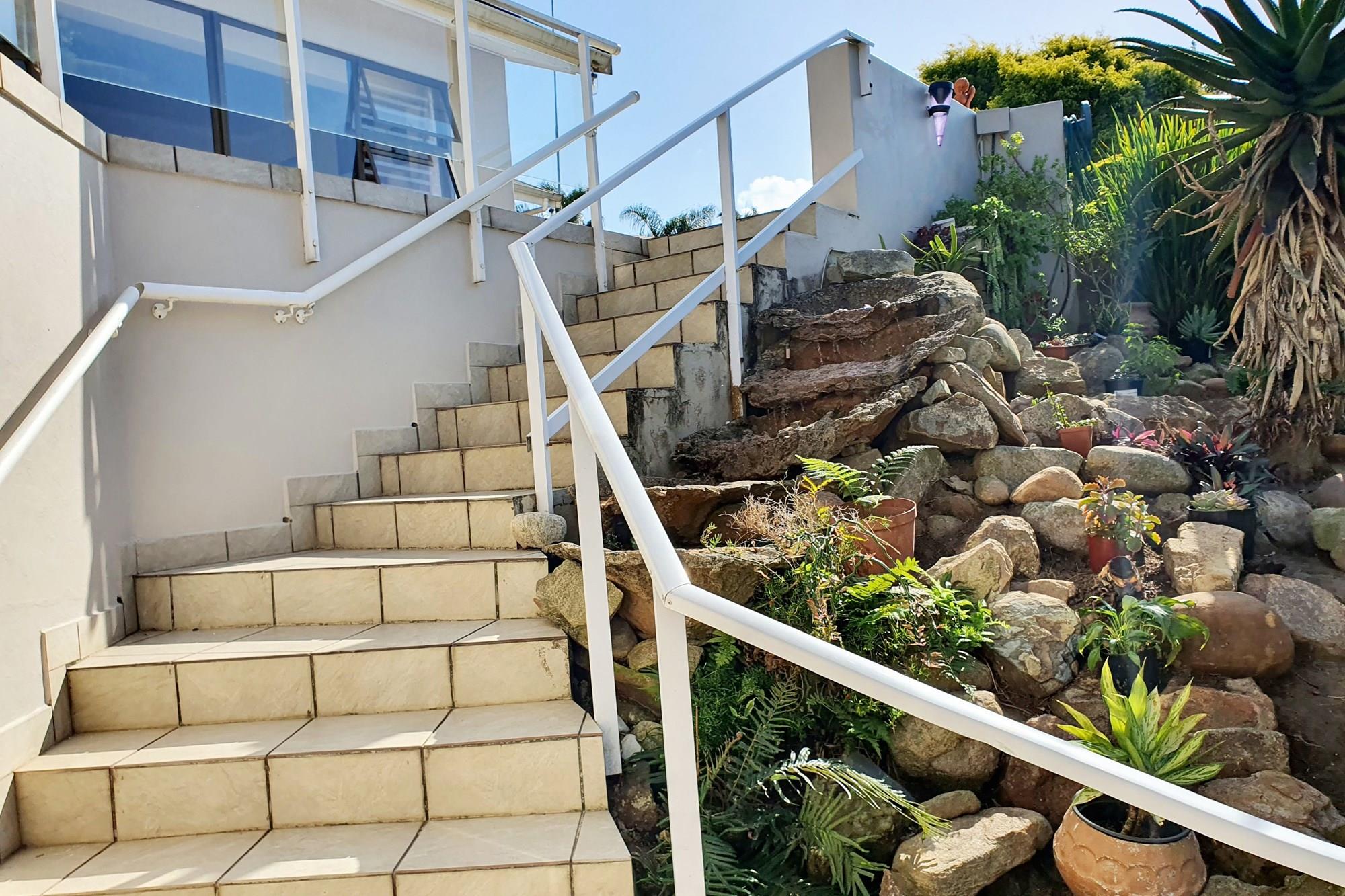 Outside, a large front patio overlooks the beautifully landscaped garden and the captivating sea vista, providing a perfect spot for relaxation. At the rear, a covered patio area adjoins a sparkling pool and braai area, offering a refreshing retreat on sunny days.