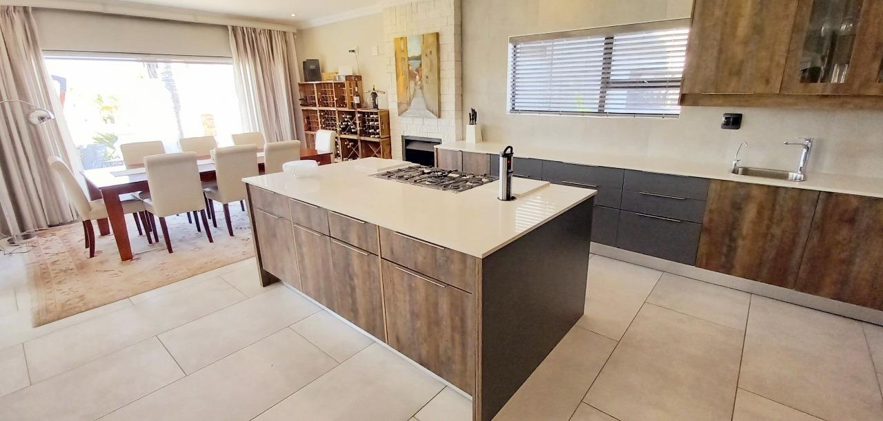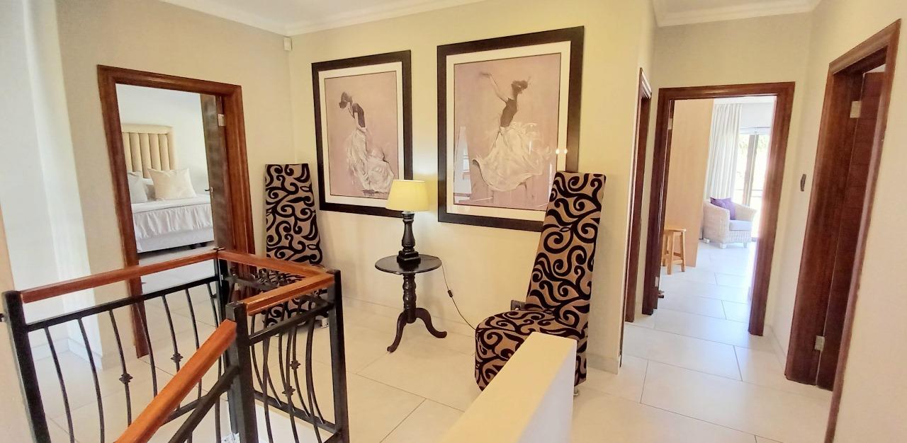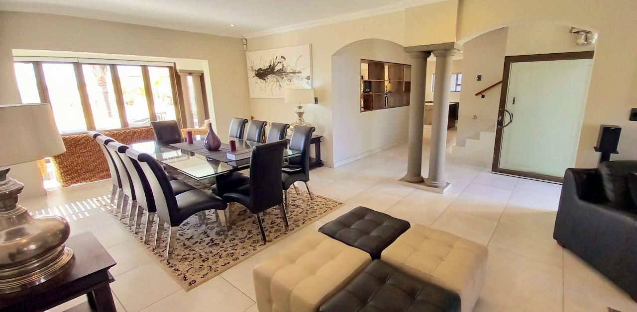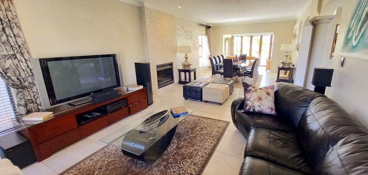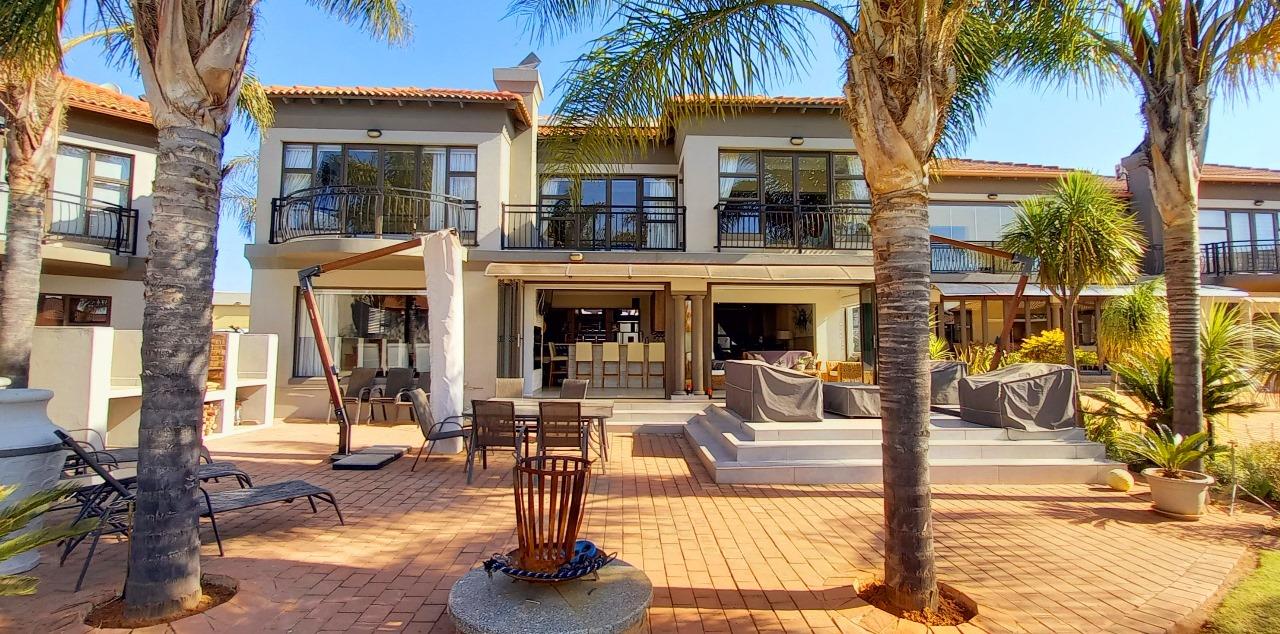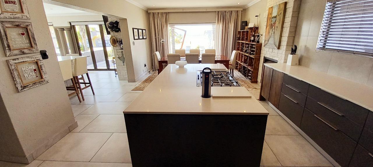 Three of the spacious bedrooms offer breathtaking waterfront views, while the main bedroom features a private pajama lounge. The open-plan living area includes a lounge, dining room, modern kitchen with a center island, and a second lounge with a bar and built-in gas braai. With 4 bathrooms (3 en-suite) and cozy fireplaces in each lounge, comfort abounds.