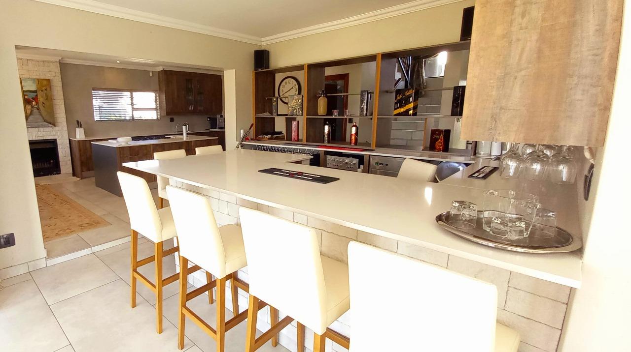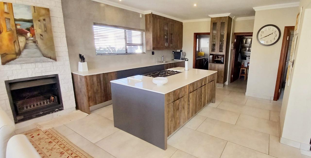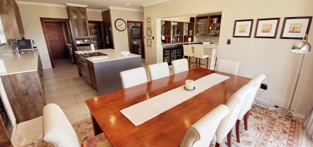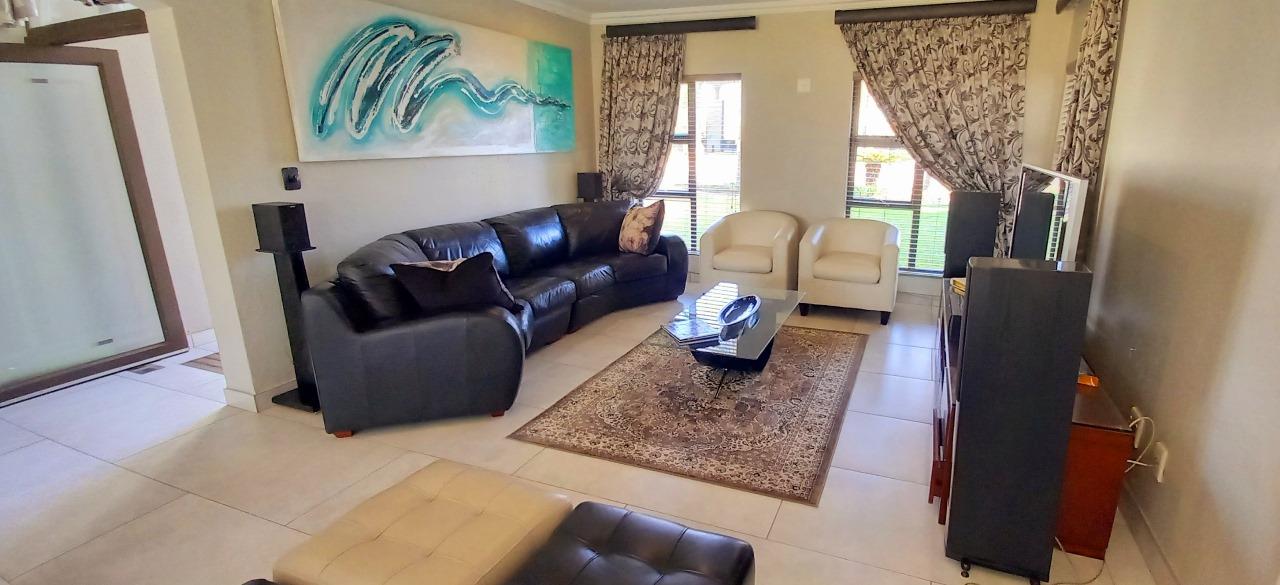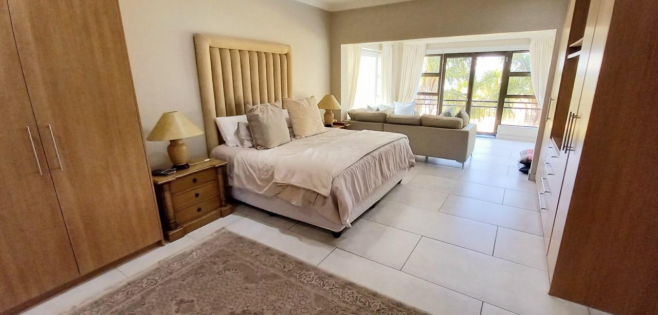 Three of the spacious bedrooms offer breathtaking waterfront views, while the main bedroom features a private pajama lounge. The open-plan living area includes a lounge, dining room, modern kitchen with a center island, and a second lounge with a bar and built-in gas braai. With 4 bathrooms (3 en-suite) and cozy fireplaces in each lounge, comfort abounds.