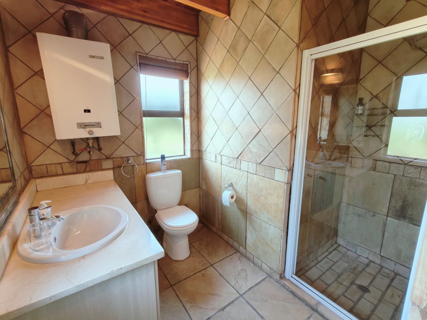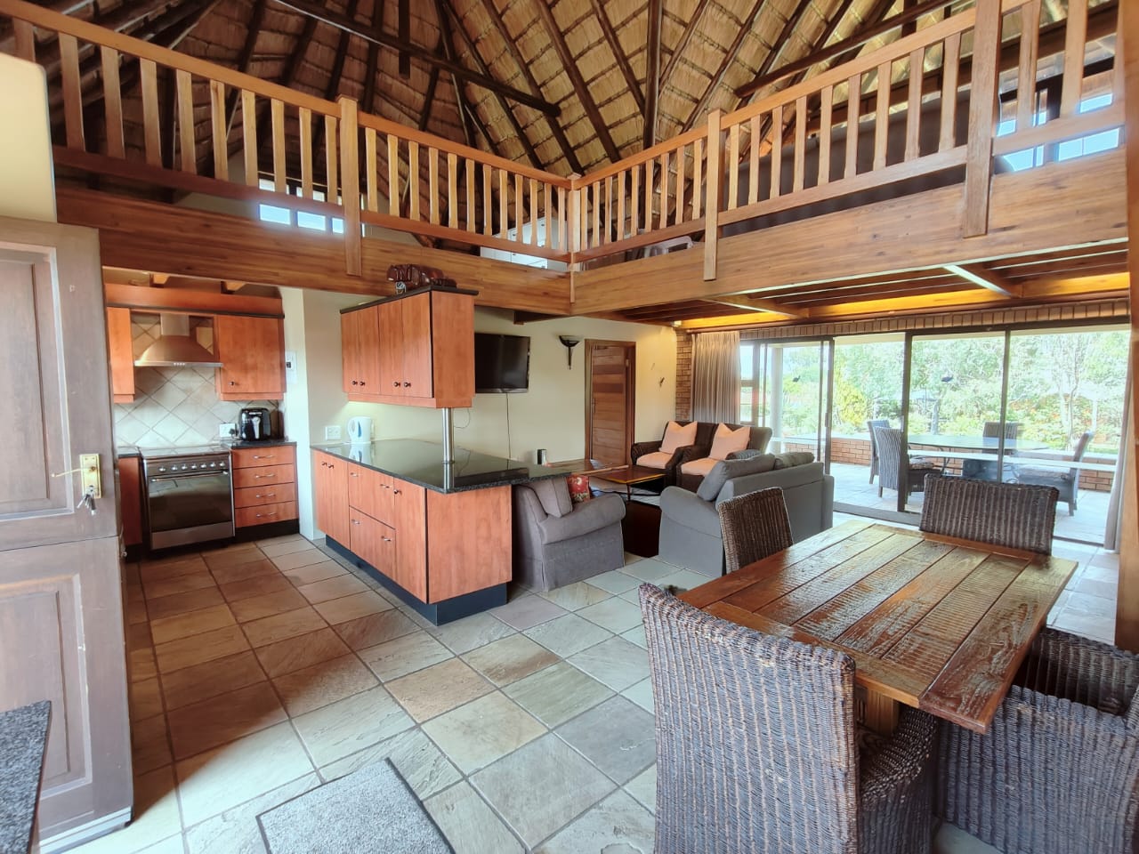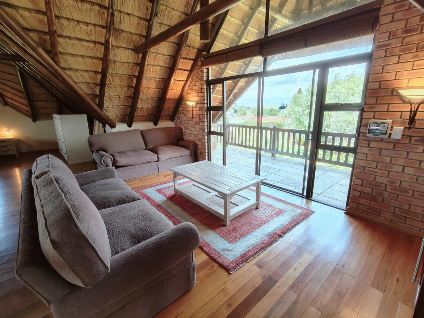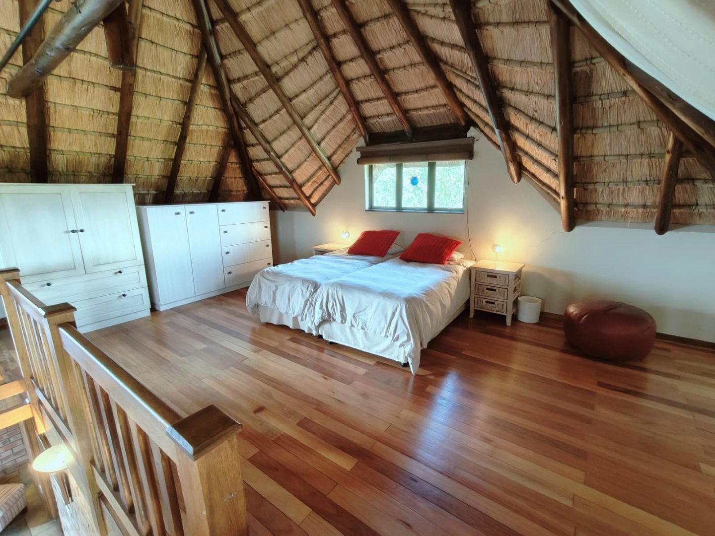 This rustic style thatched house consists of, 4 bedrooms, 2 bathrooms, both bedrooms are en-suite and a guest toilet. The ground floor has 2 bedrooms leading off the living area and out onto a undercover patio.
