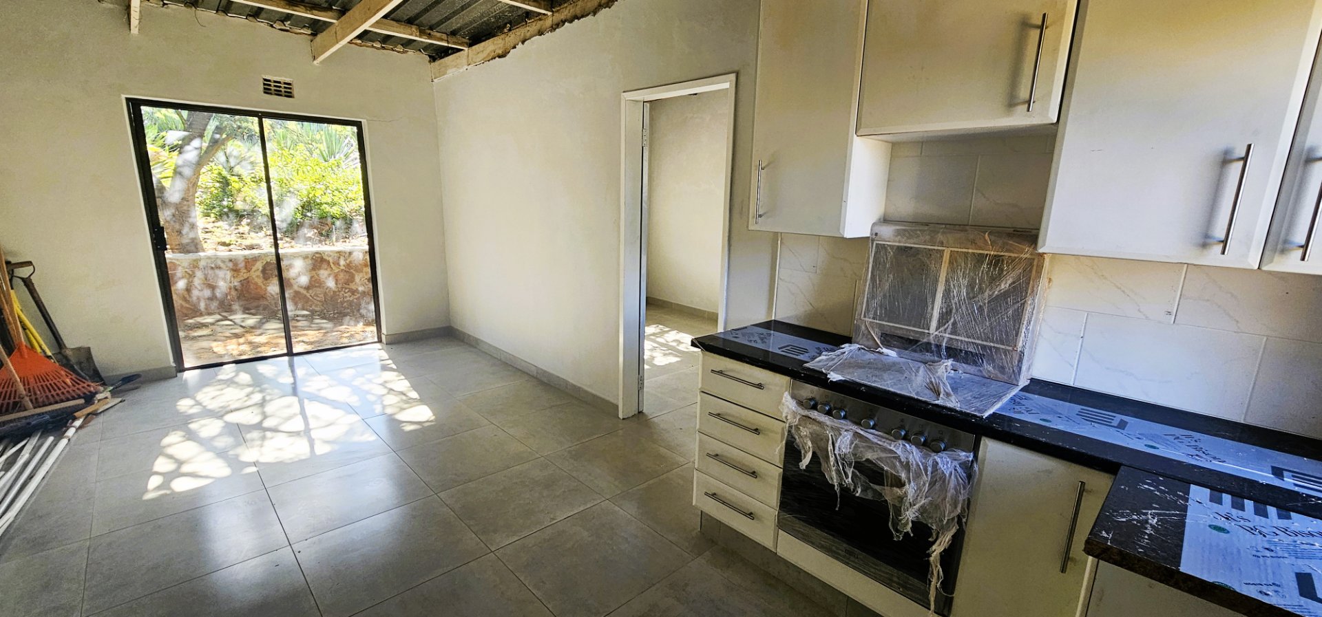 A contemporary open-plan kitchen boasting granite countertops and a brand-new loose-standing 5-plate gas stove with hob – still in its plastic wrapping!