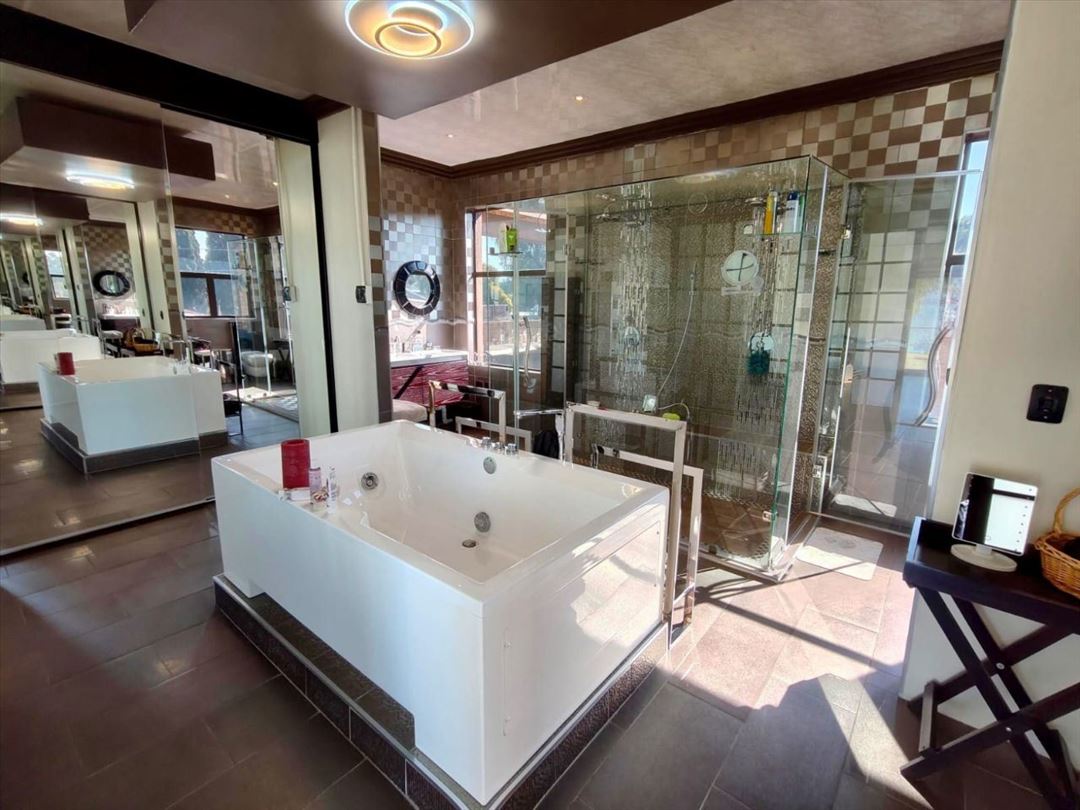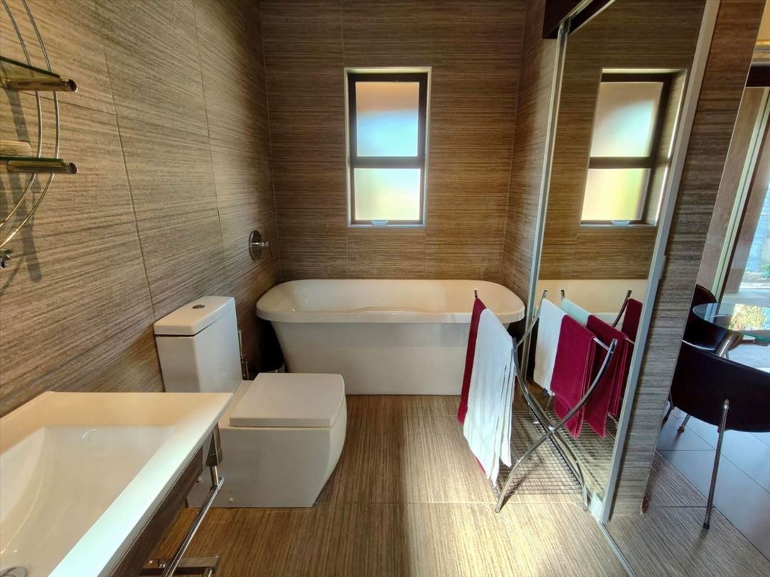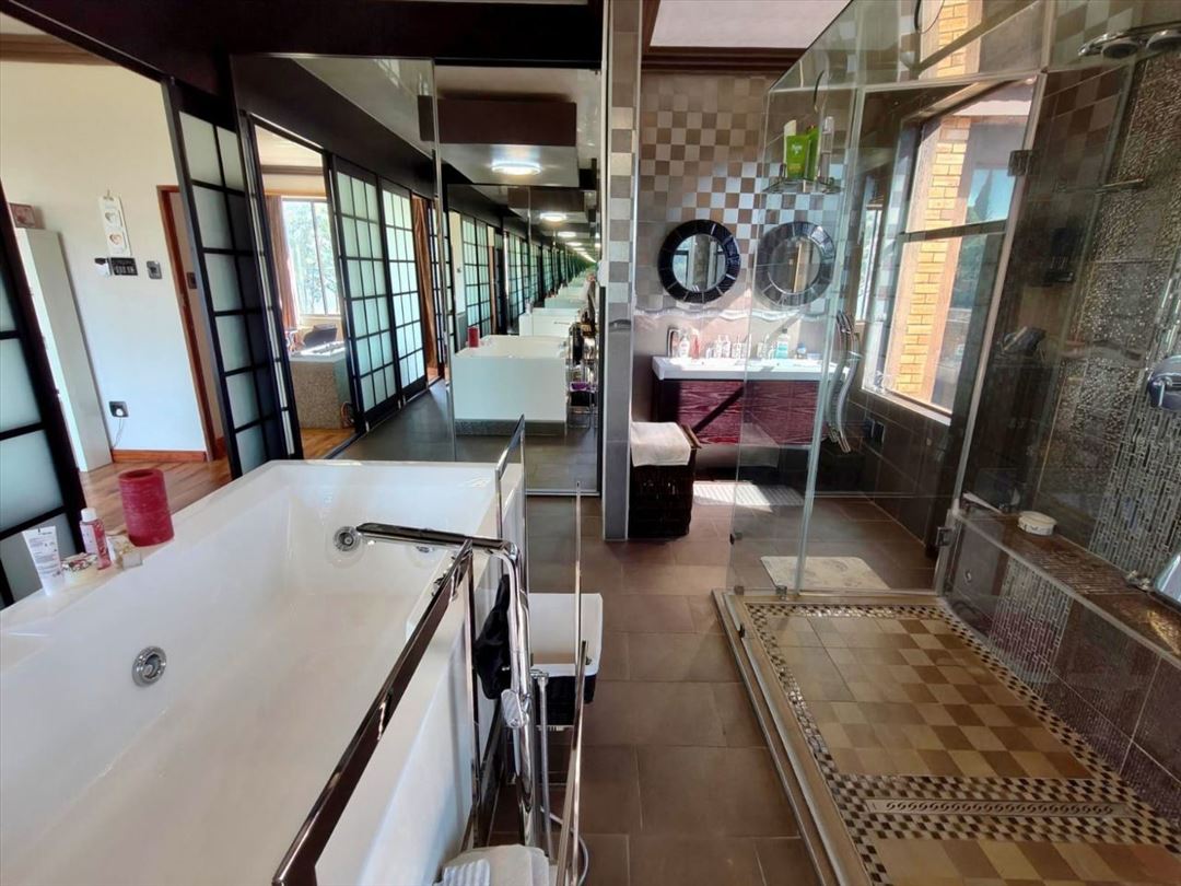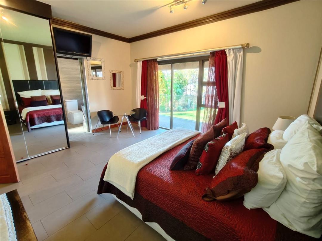 A fully-equipped entertainment zone with built-in bar, leading to an outdoor braai, swimming pool, and Jacuzzi — with a convenient outdoor bathroom