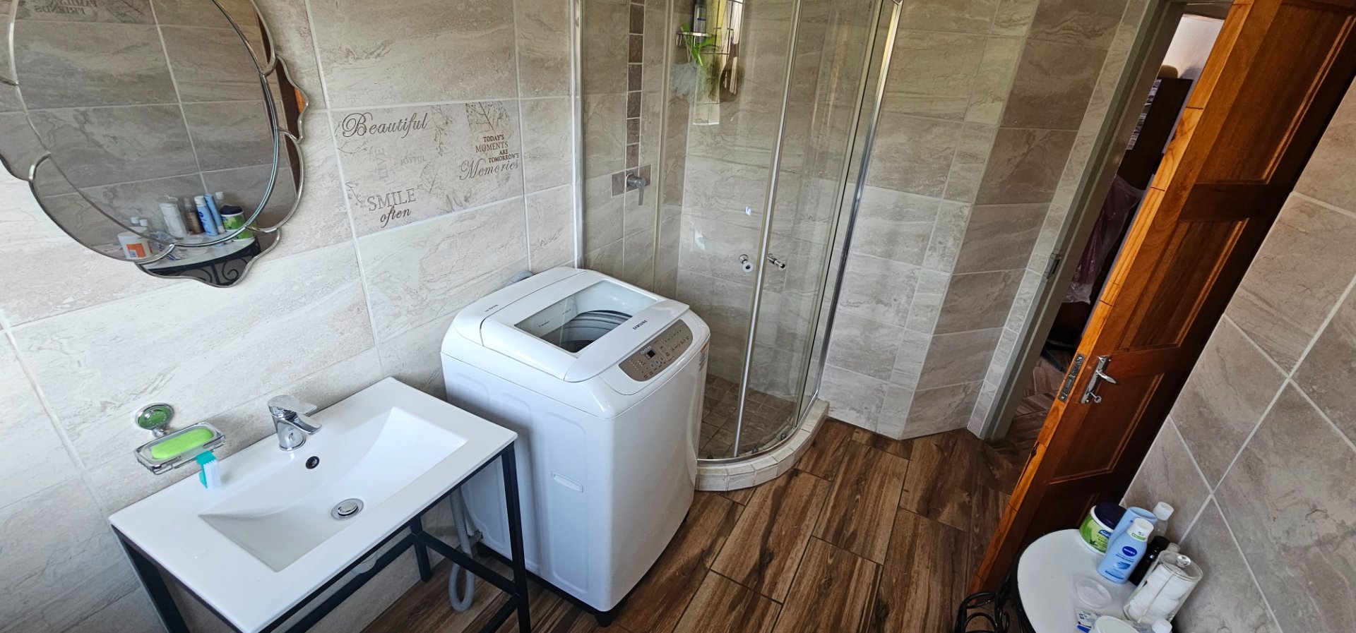 The open-plan living and kitchen area is perfect for relaxed living and entertaining, featuring modern granite countertops and ample cupboard space. While a few finishing touches are still needed — such as tiling in the kitchen and fitting the shower — all necessary materials are already on-site, giving you the chance to complete it to your taste.