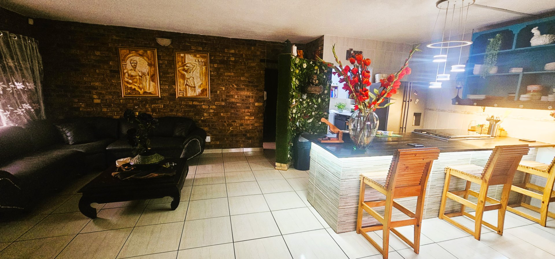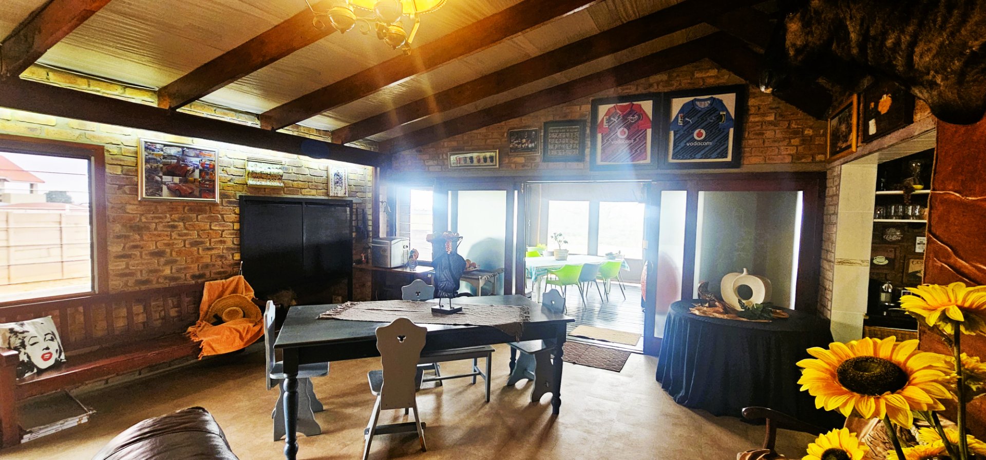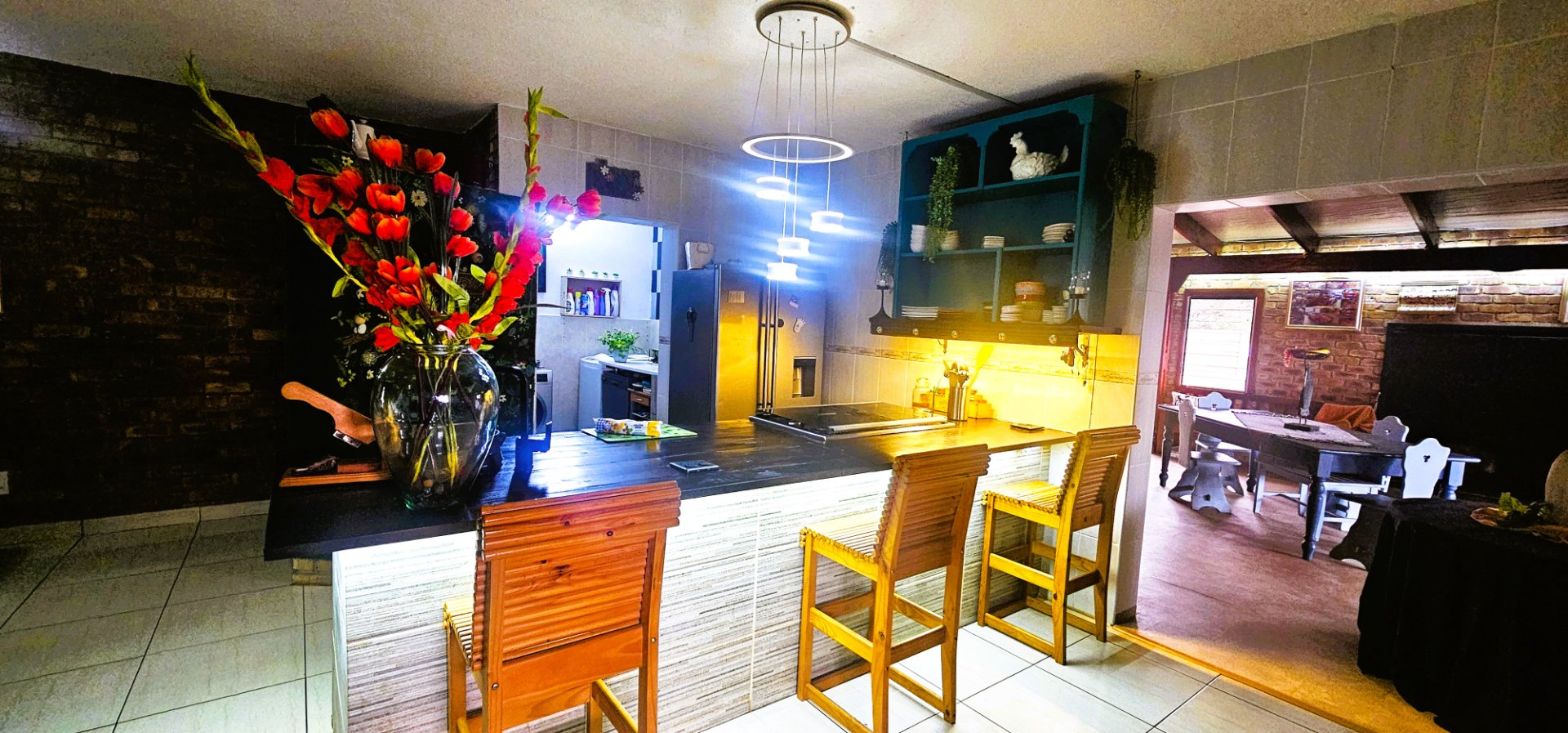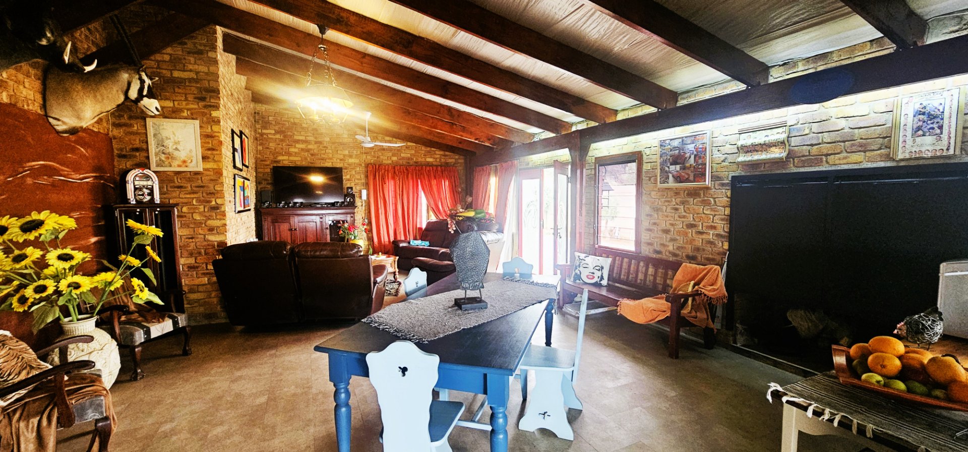 The heart of the home is the open-plan living and dining area, complete with a unique 2-in-1 built-in braai – one side gas and the other wood-burning, doubling as a cozy fireplace for winter evenings.