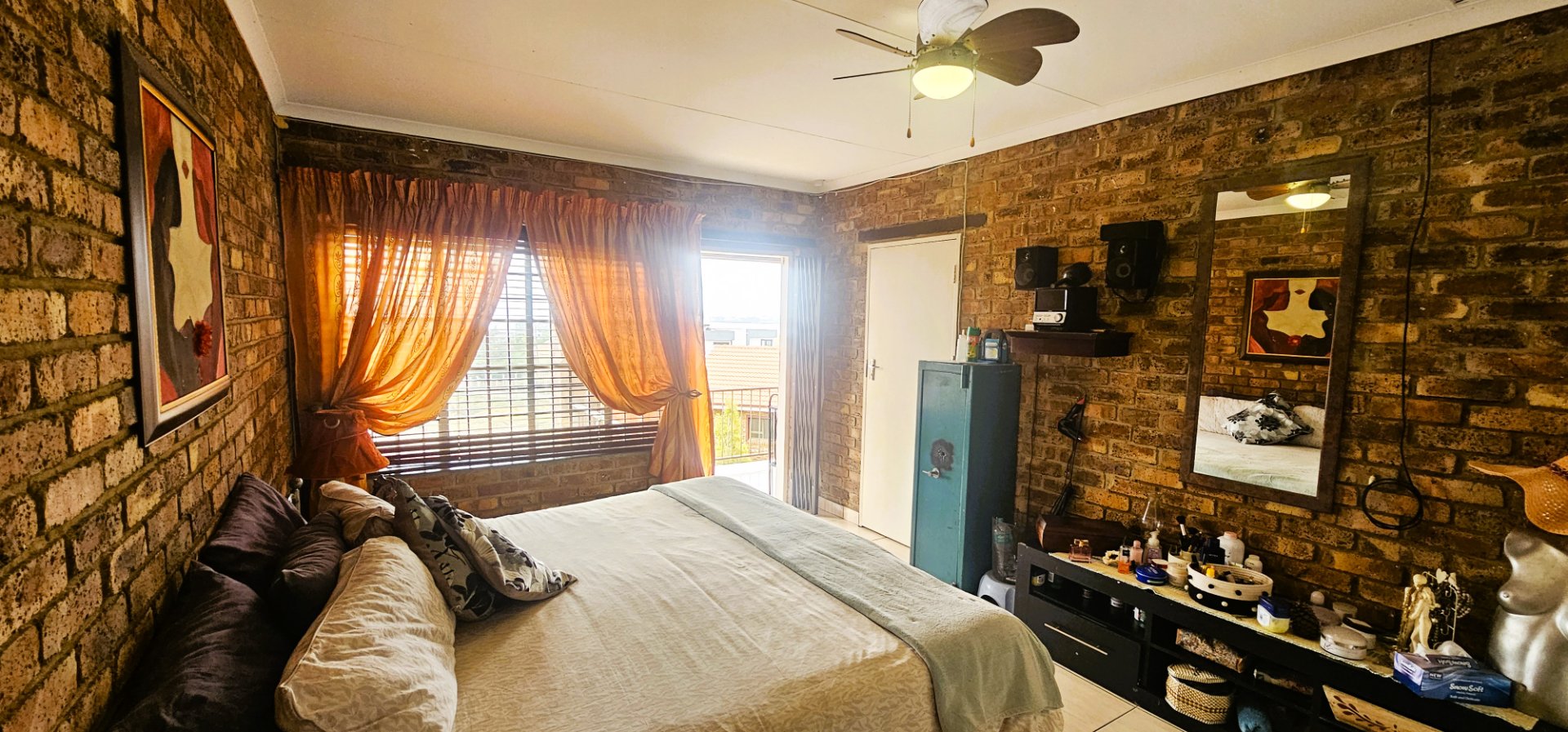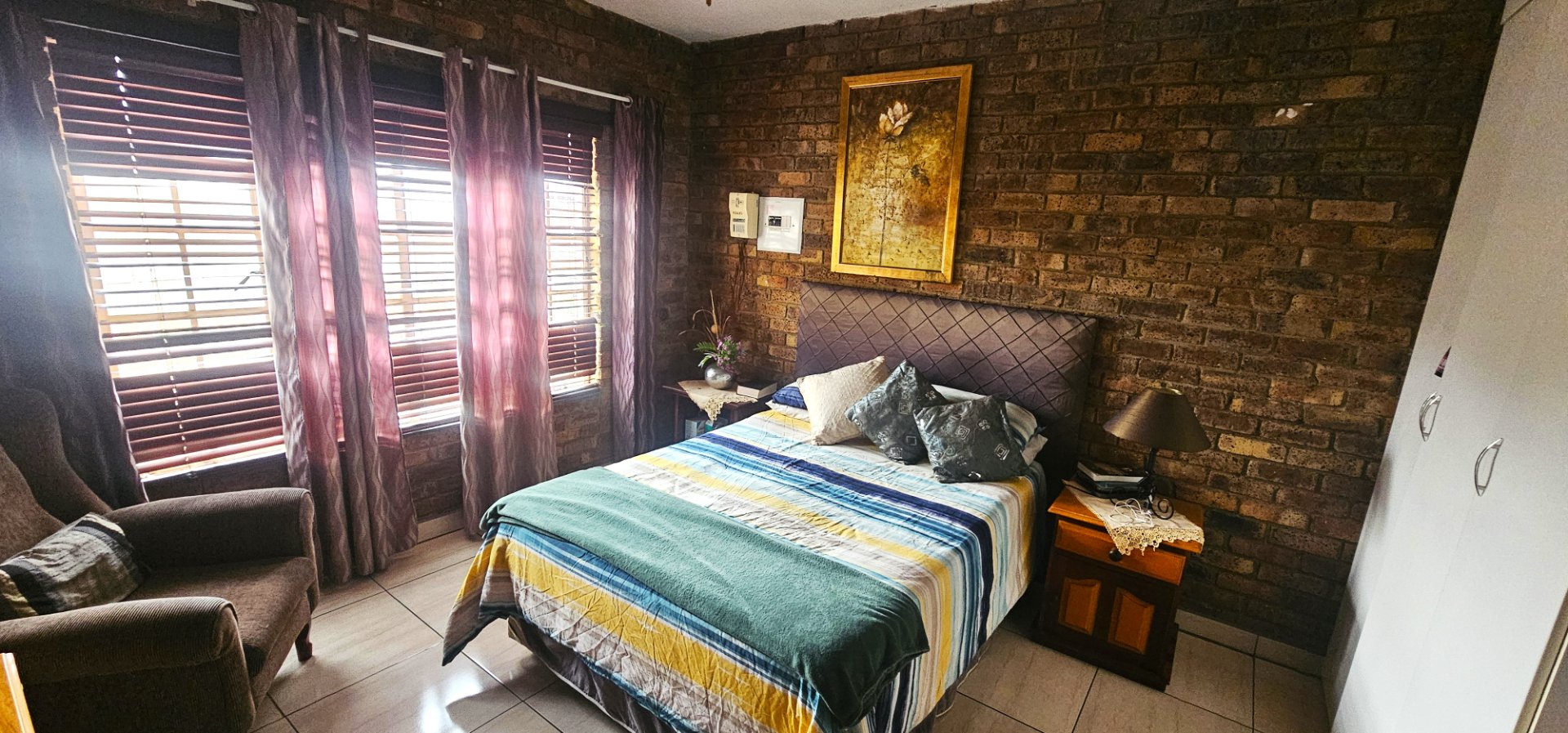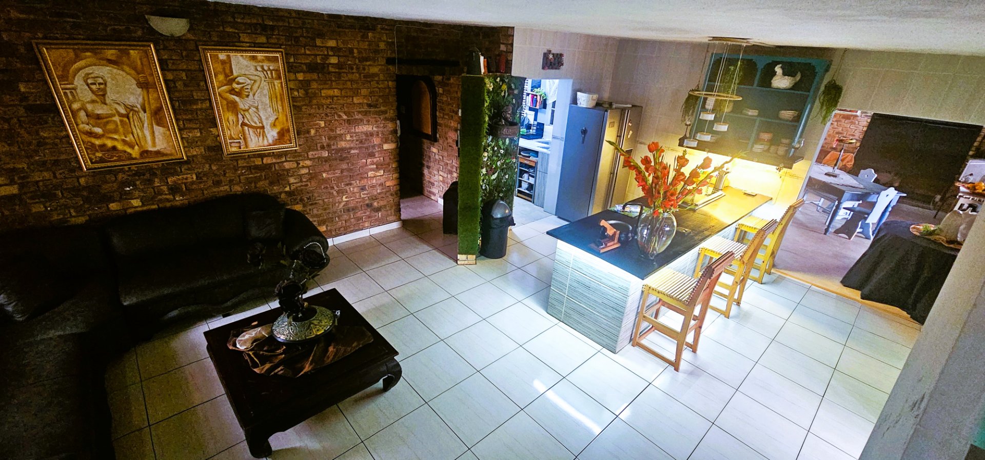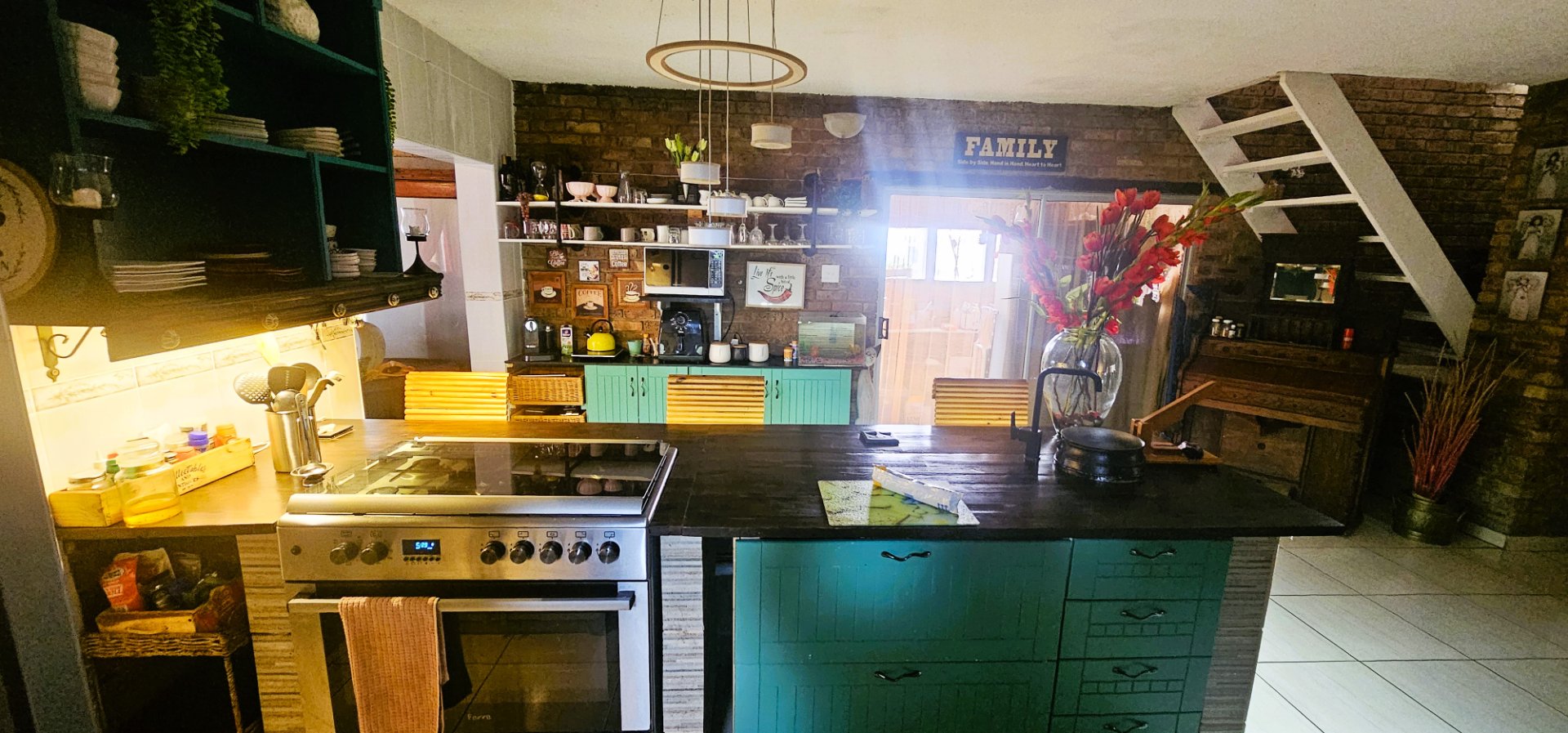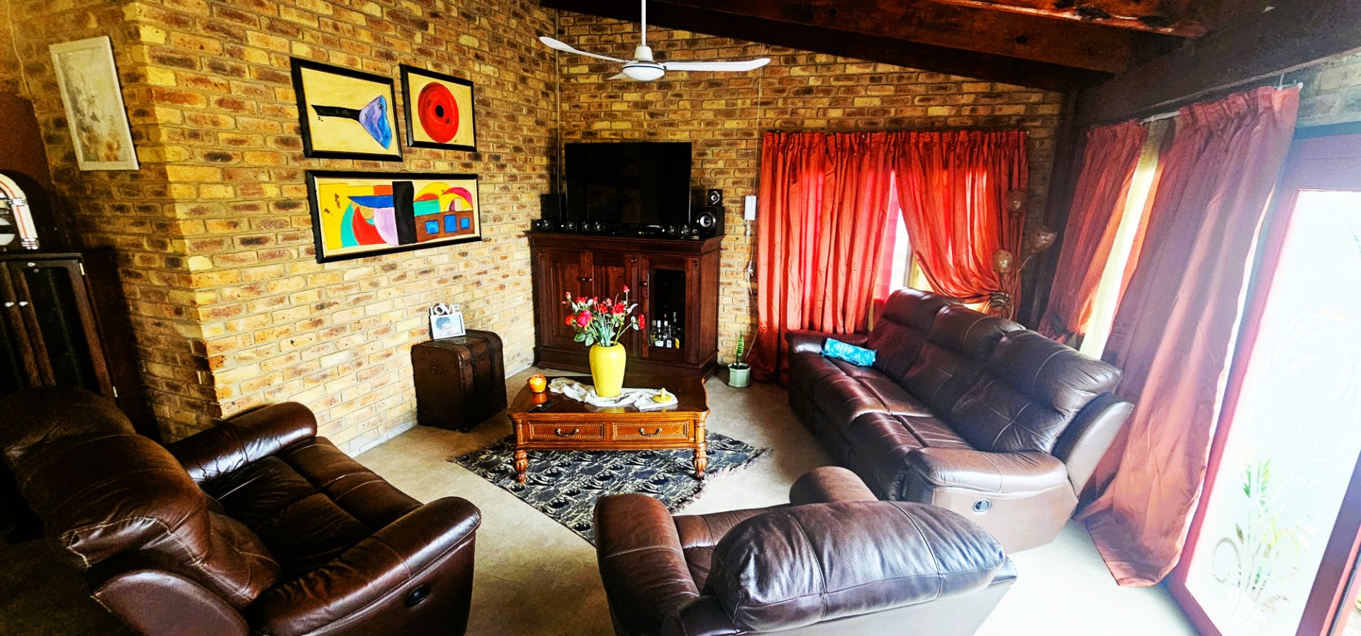 The heart of the home is the open-plan living and dining area, complete with a unique 2-in-1 built-in braai – one side gas and the other wood-burning, doubling as a cozy fireplace for winter evenings.
