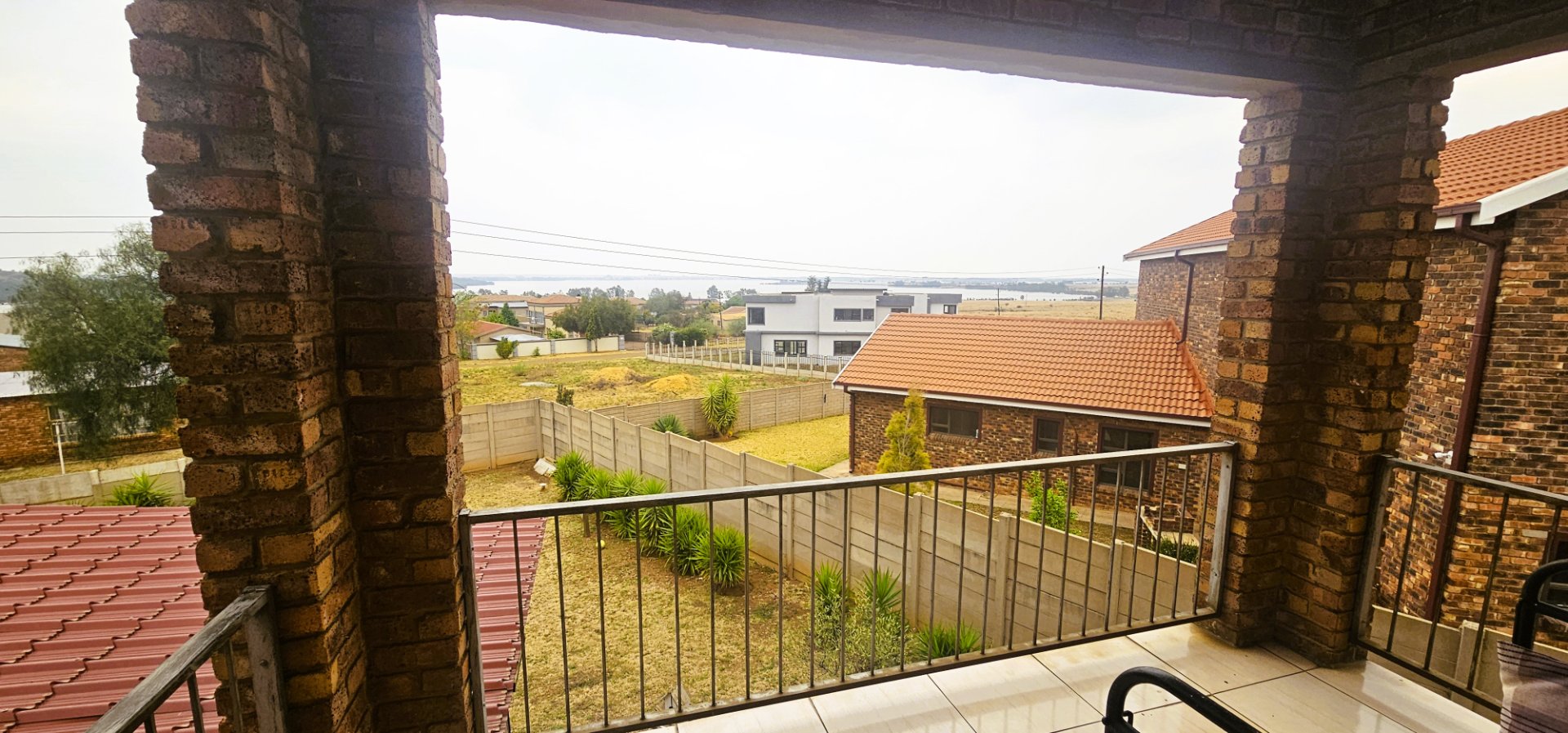 Upstairs: 3 bedrooms, including the main bedroom with a full en-suite bathroom and private balcony overlooking the dam. A third bathroom with bath, shower, toilet, and basin serves the other bedrooms.