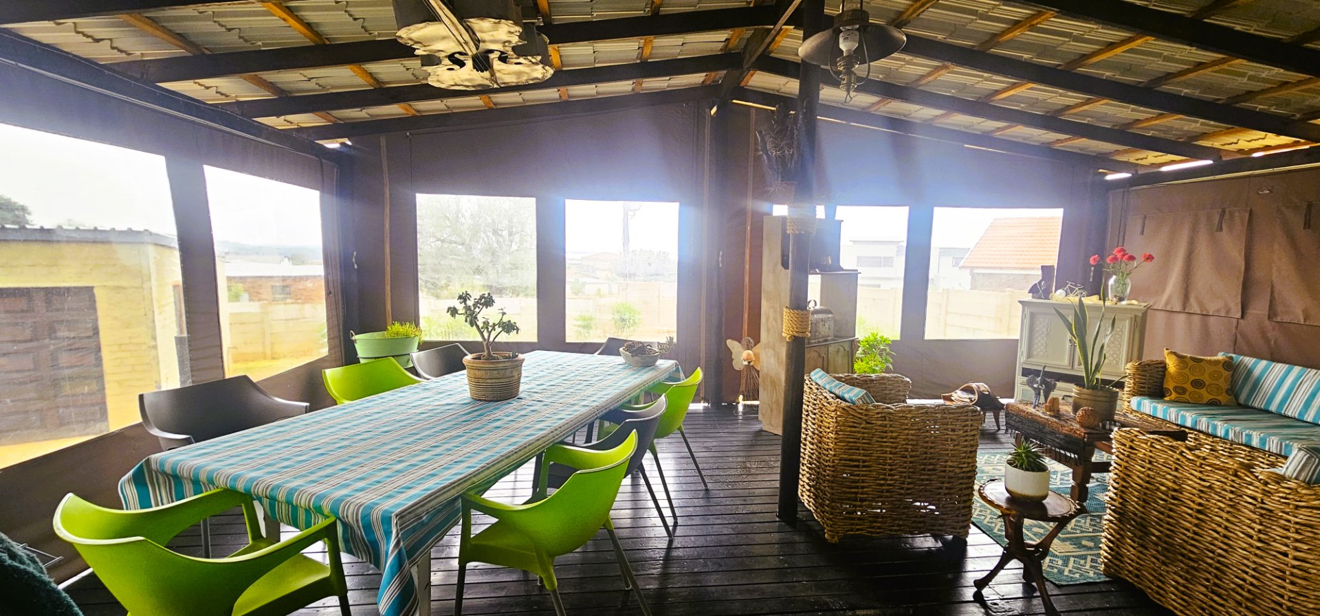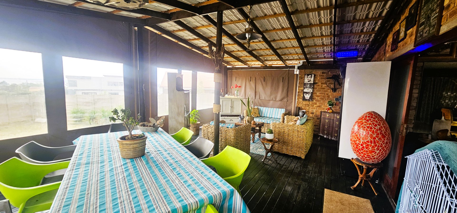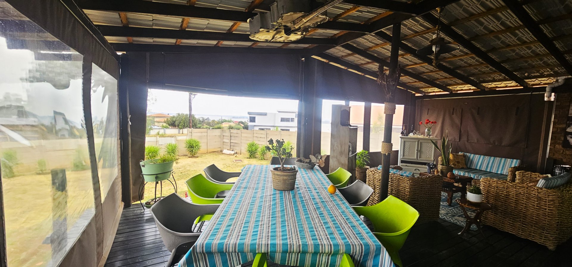 From here, the living area flows seamlessly onto a wooden deck and under-roof patio, enclosed with canvas covers. This versatile space offers stunning views of the dam and can easily be used as a family room, with ample space for both a dining table and lounge area.