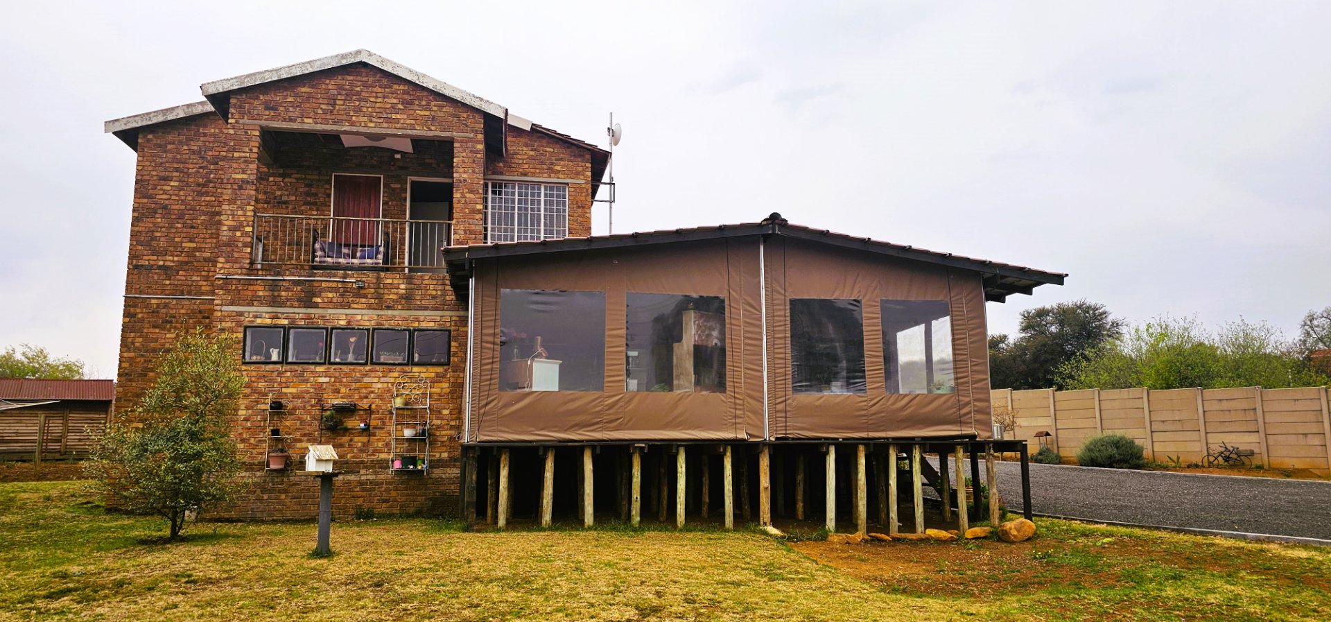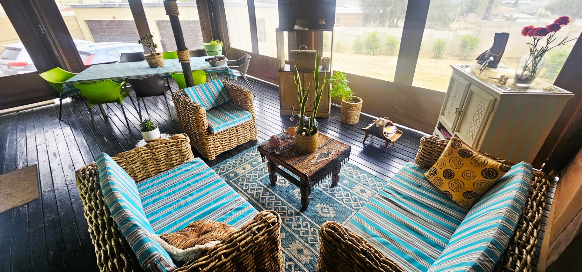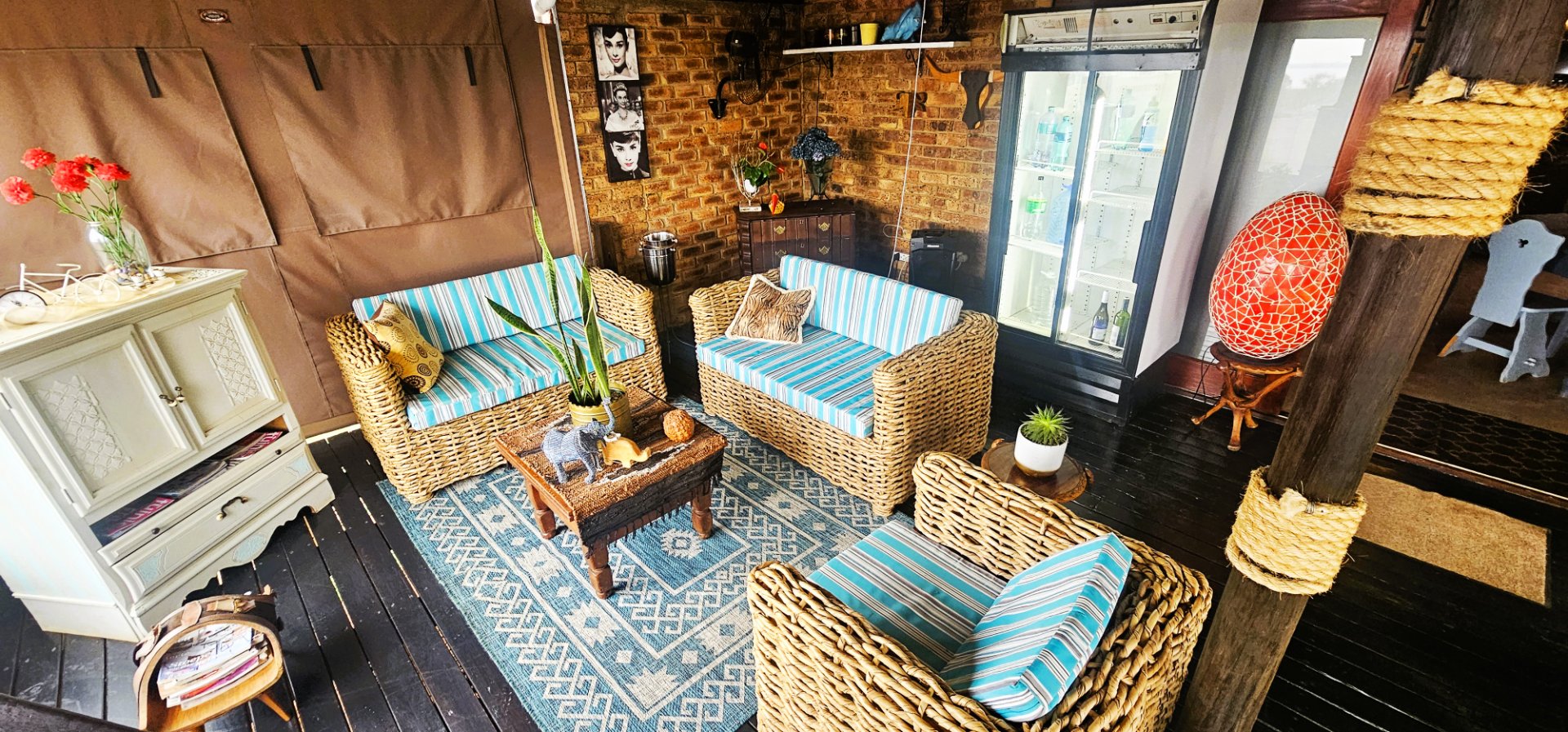 From here, the living area flows seamlessly onto a wooden deck and under-roof patio, enclosed with canvas covers. This versatile space offers stunning views of the dam and can easily be used as a family room, with ample space for both a dining table and lounge area.