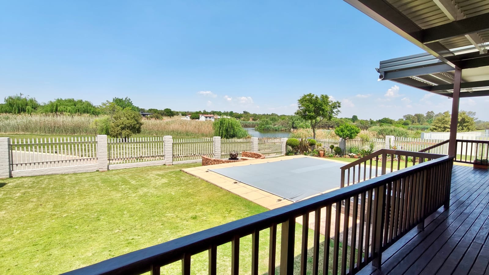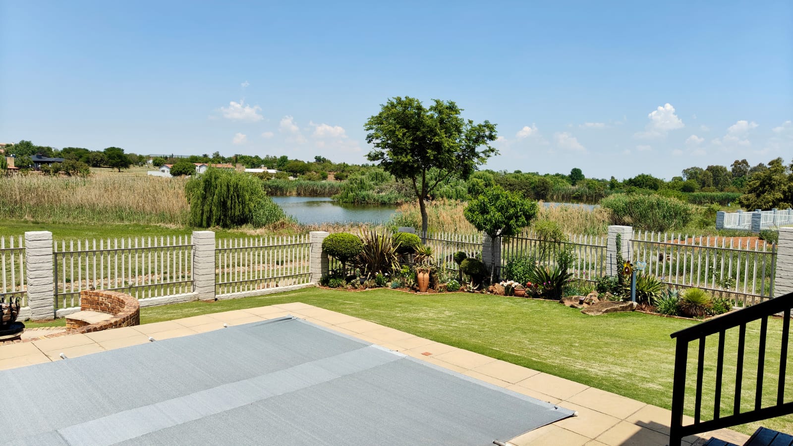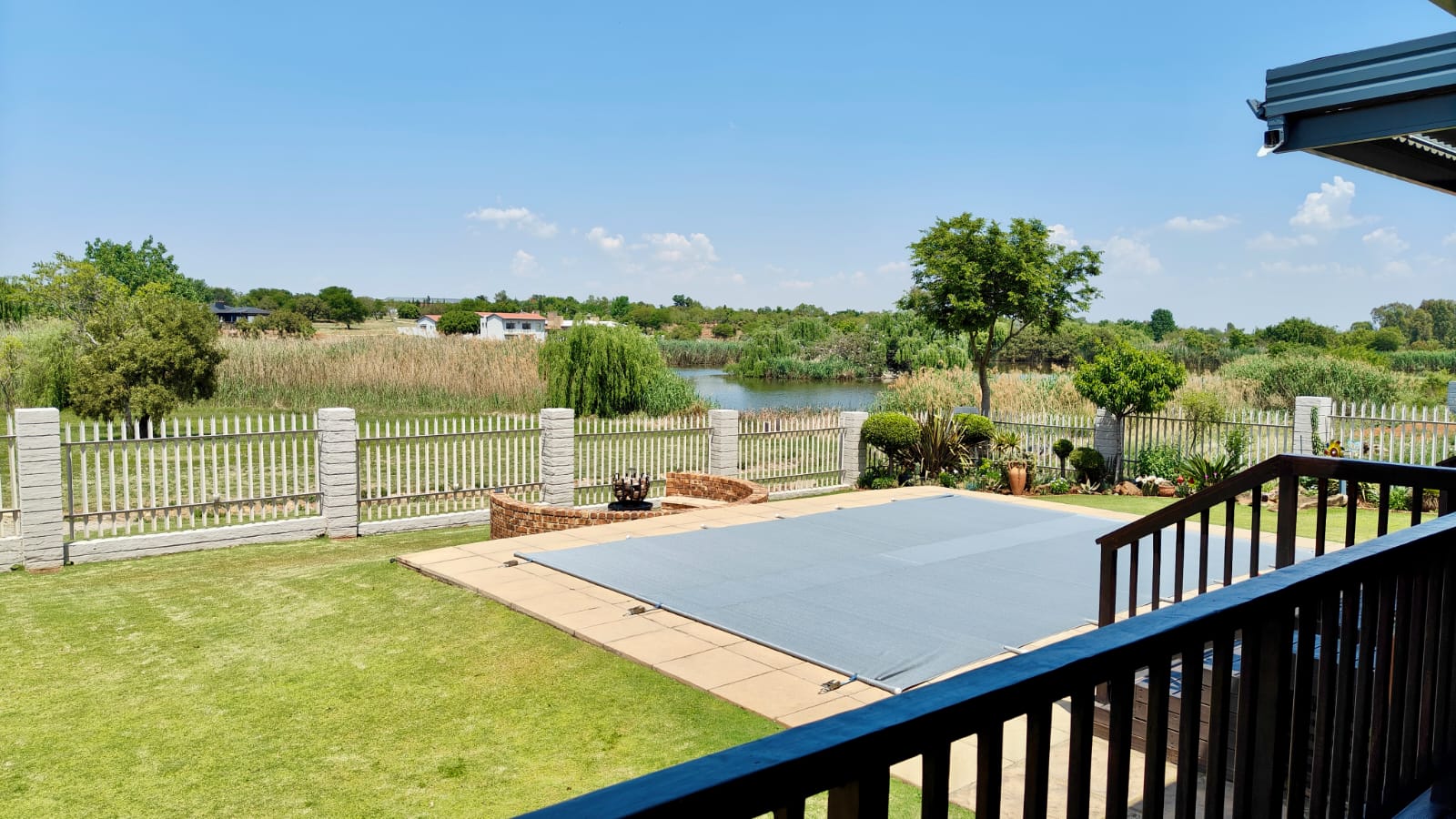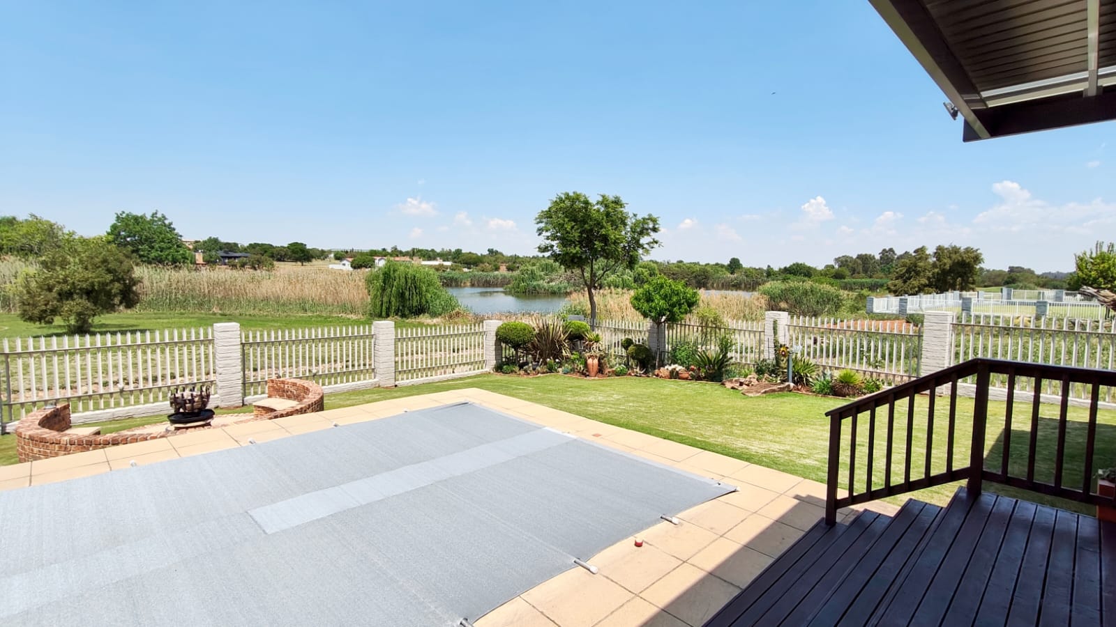 Step inside to discover a stylish open-plan layout featuring a modern kitchen with granite tops, pantry, and scullery. The spacious dining and lounge areas flow seamlessly onto an enclosed patio and bar, opening to a wooden deck, heated pool, and manicured garden — ideal for entertaining or simply enjoying tranquil sunsets over the duck pond.
