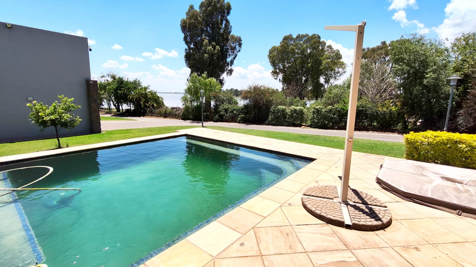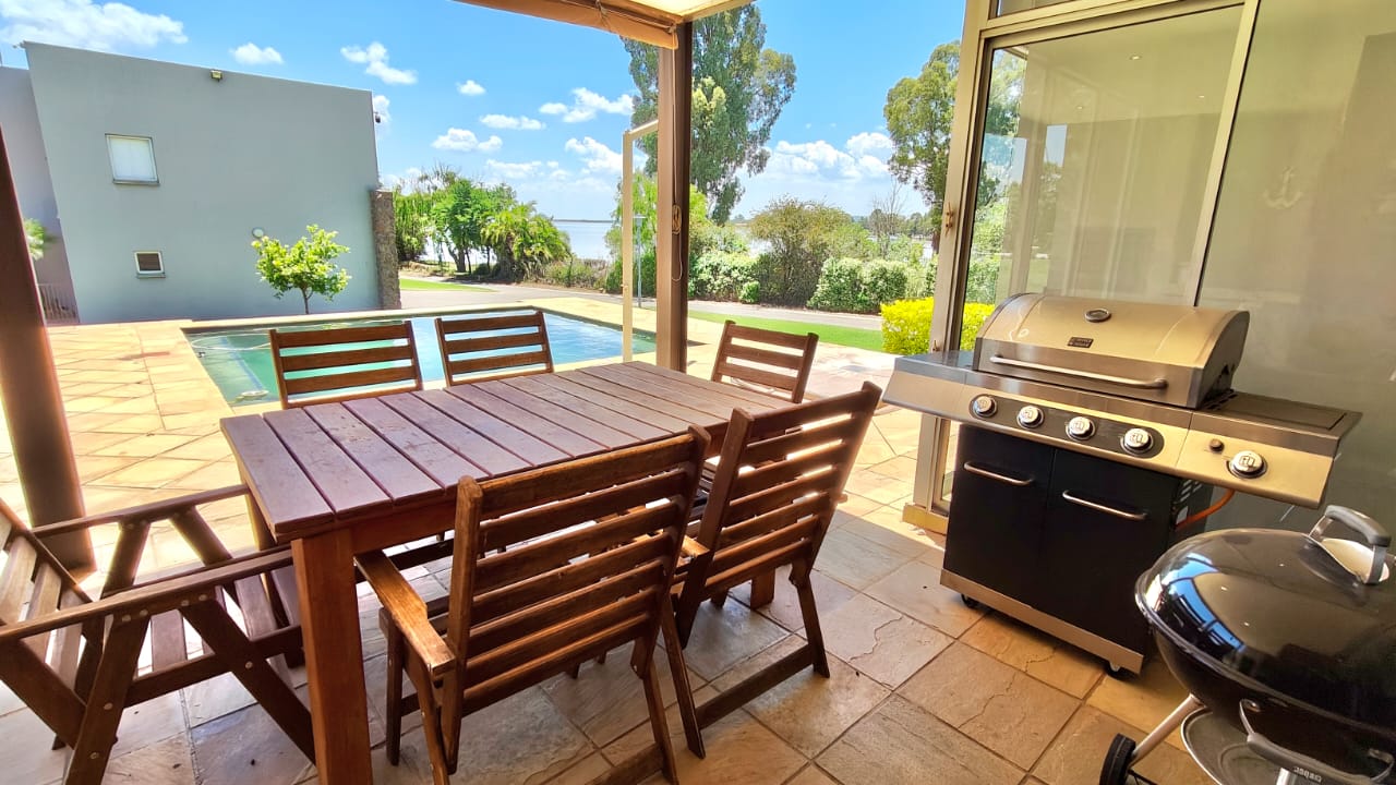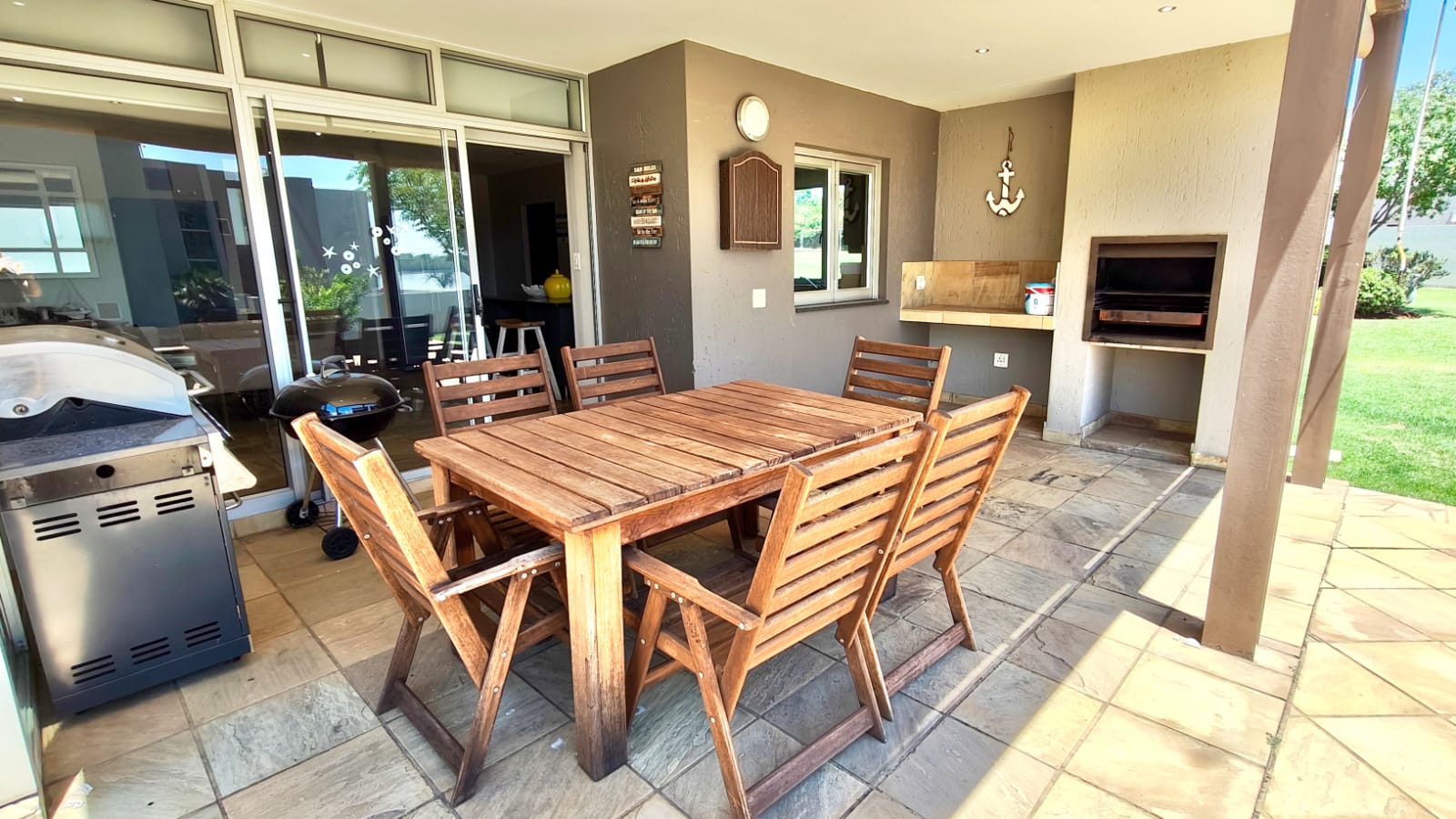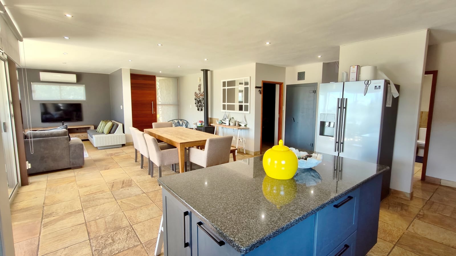 The home offers open-plan living with elegant finishes and plenty of space for both relaxation and entertaining. The lounge with a cozy fireplace flows seamlessly into the dining area and a modern, fully fitted kitchen — a true chef’s delight. Sliding doors lead out to a covered patio with a built-in braai, overlooking the dam and offering the perfect setting for tranquil mornings or sunset gatherings.