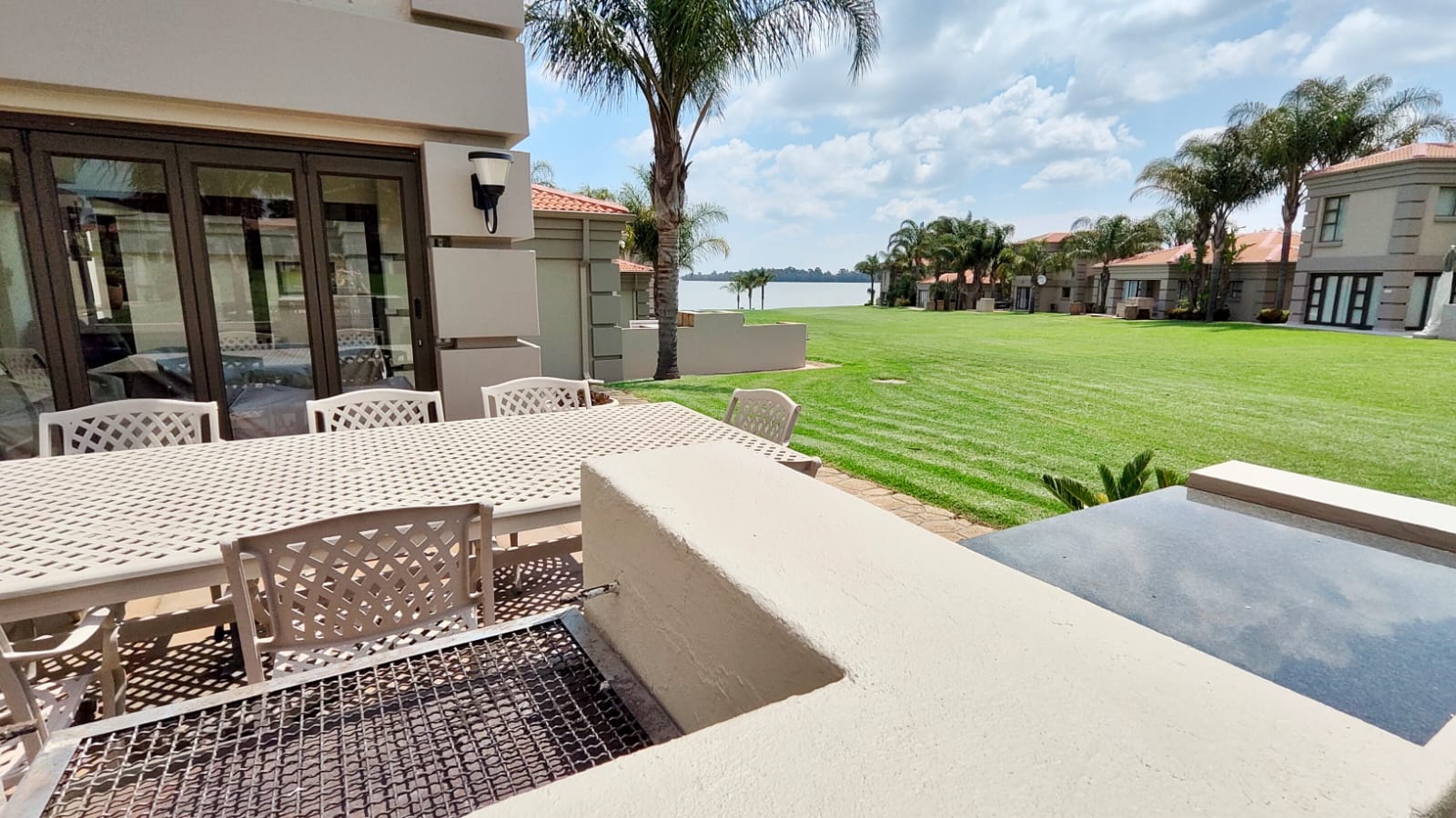 The home features a spacious, elegantly finished kitchen that flows seamlessly into an open-plan lounge and stylish bar area—ideal for both everyday living and entertaining. The living space extends into an enclosed patio, which opens onto a beautifully manicured garden and outdoor patio complete with a built-in braai, all perfectly positioned to take in the spectacular dam views.