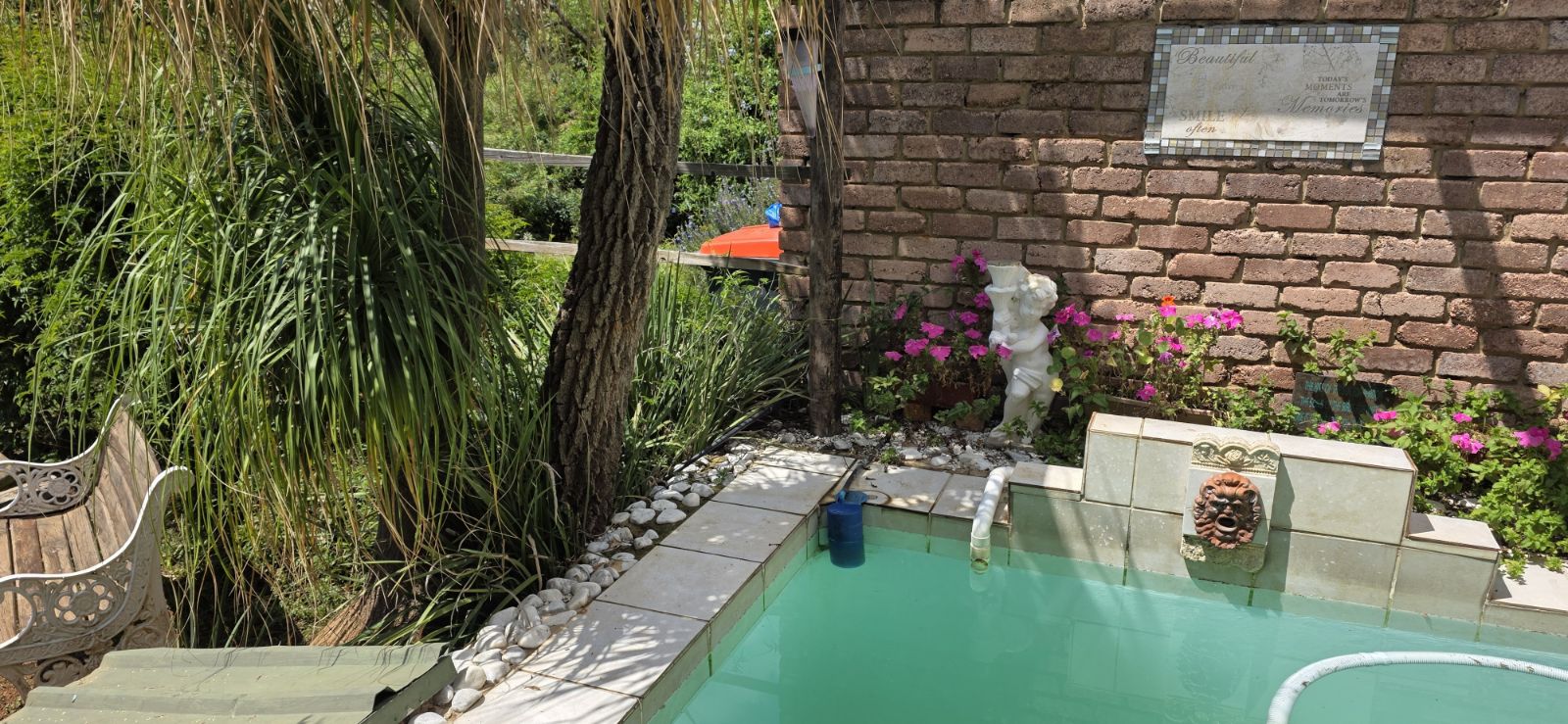 Inviting entertainment area overlooking the splash pool and landscaped garden