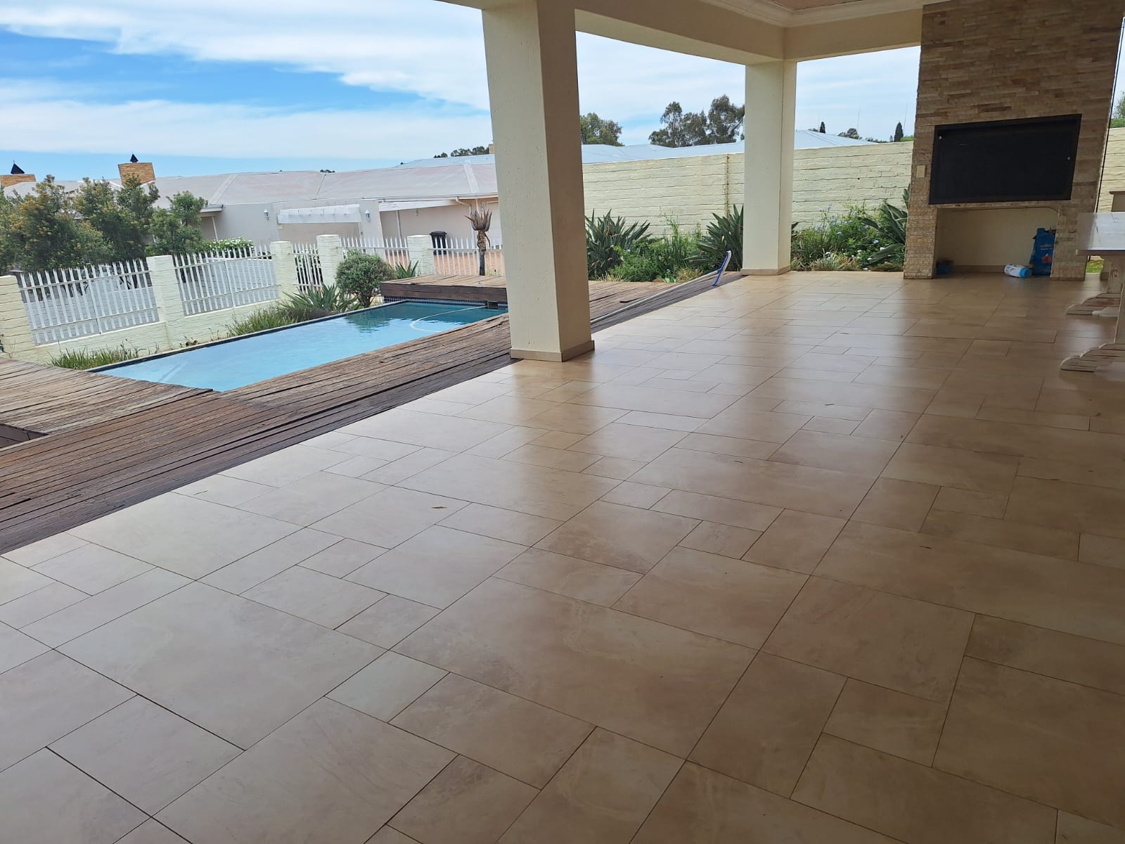 A 4 bedrooms and two bathrooms includes a master en-suite and a convenient guest toilet. A central fireplace separates the lounge and dining areas, offering warmth and charm. The open-plan layout features sliding doors that lead to a large covered patio with a built-in braai, perfect for entertaining. Solar-heated pool, underfloor heating throughout most of the house, and serene garden views.