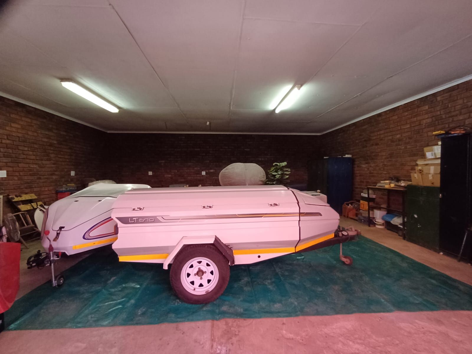 Parking is a standout feature, offering four garages, additional caravan parking, and an extra covered parking area with shade netting — ideal for multiple vehicles or storage needs.