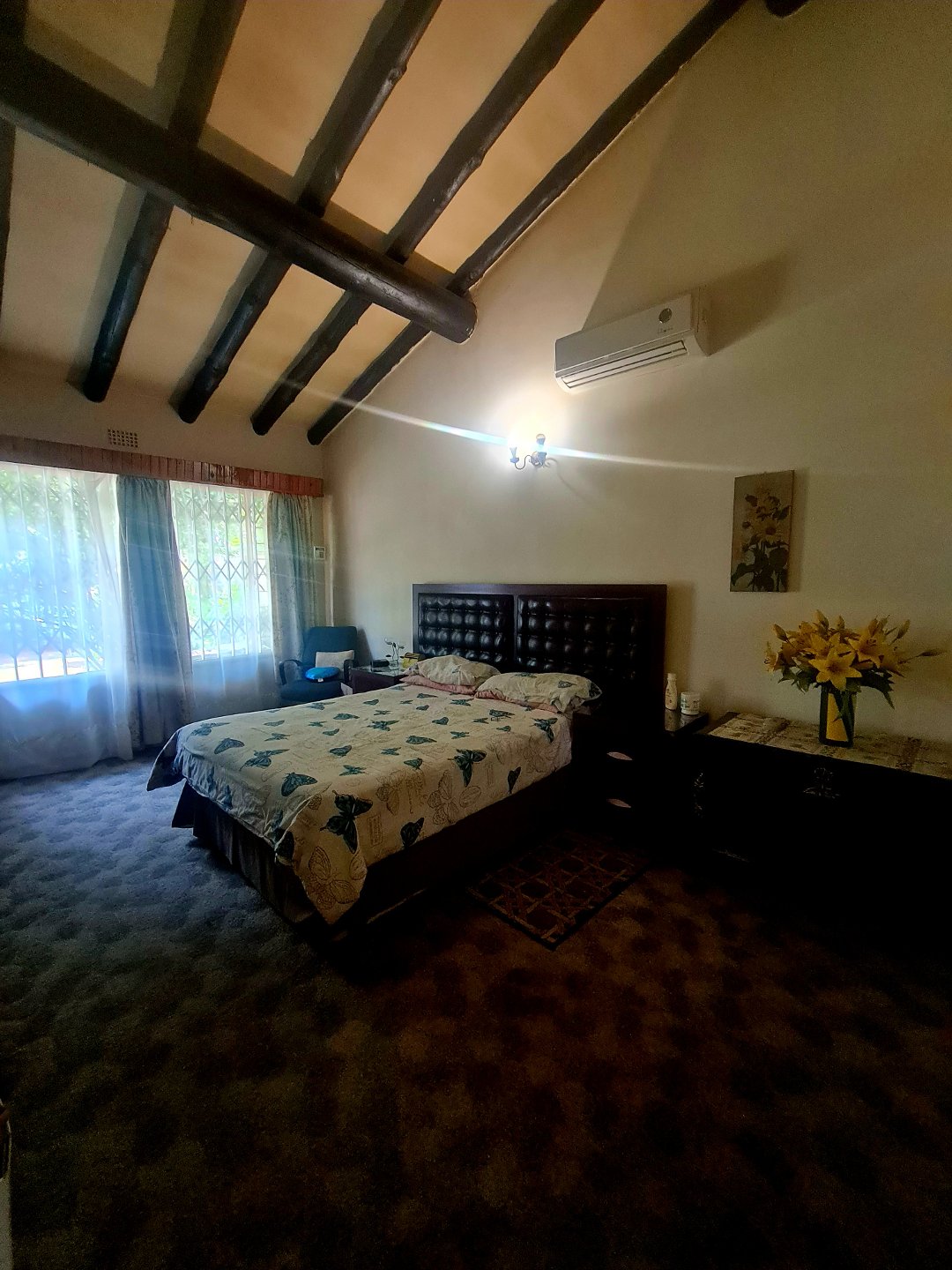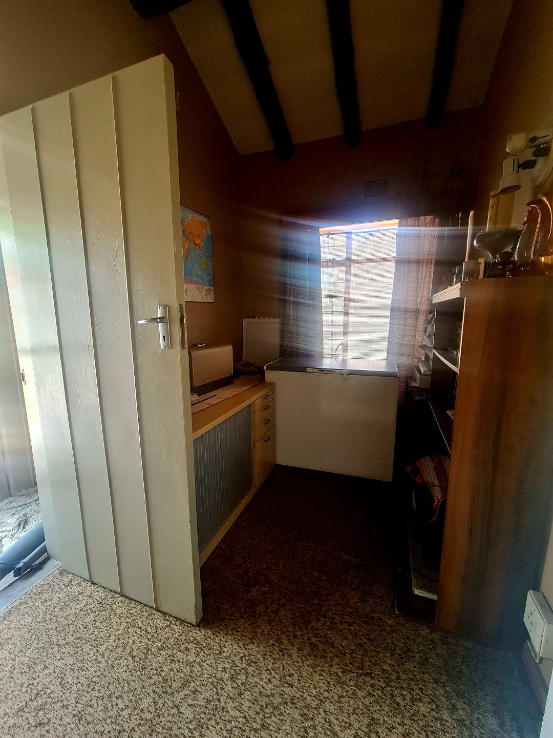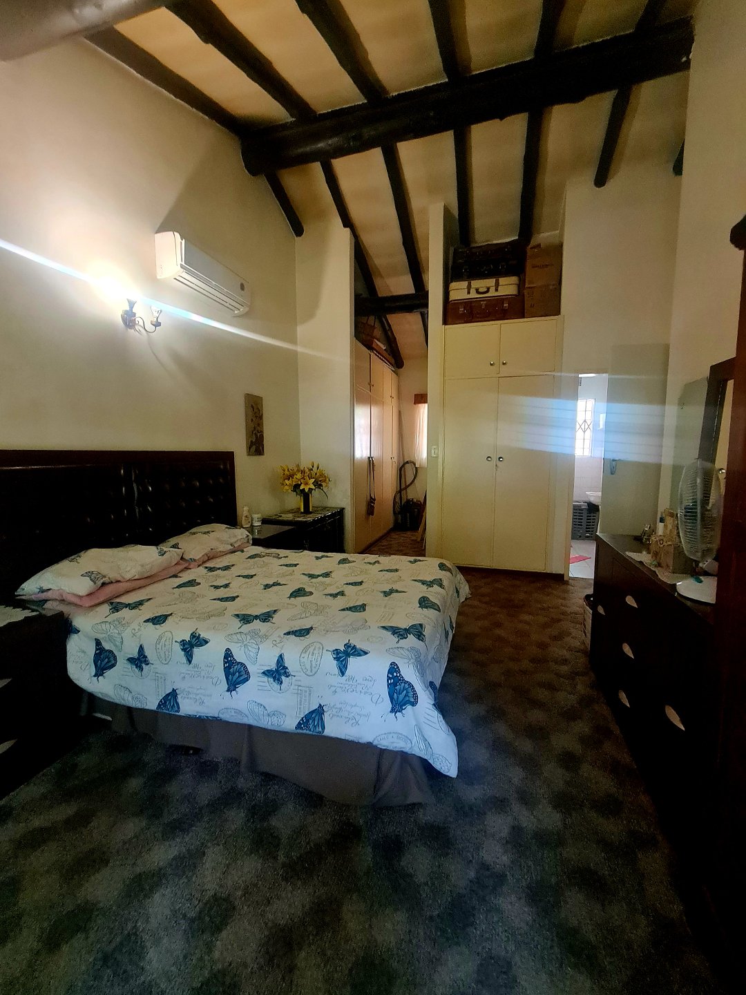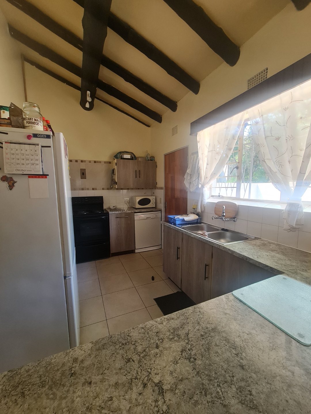 Spacious flat with 2 bedrooms & bathroom with open plan lounge & kitchen with gas oven, gas geyser, ceiling fans & build in cupboards, can count as a second house on the stand!