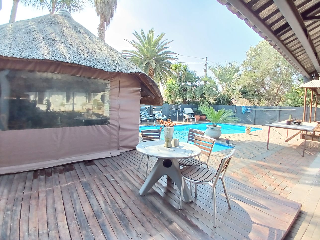 Sparkling swimming pool. Big lapa. The wendy house is ideal for extra workspace, with an air conditioner and already installed electricity. 3 Garages and 3 carports.