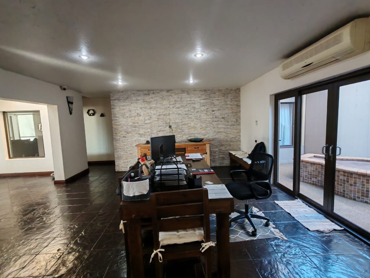 . Entertainment area with stackable doors leading to patio and pool.