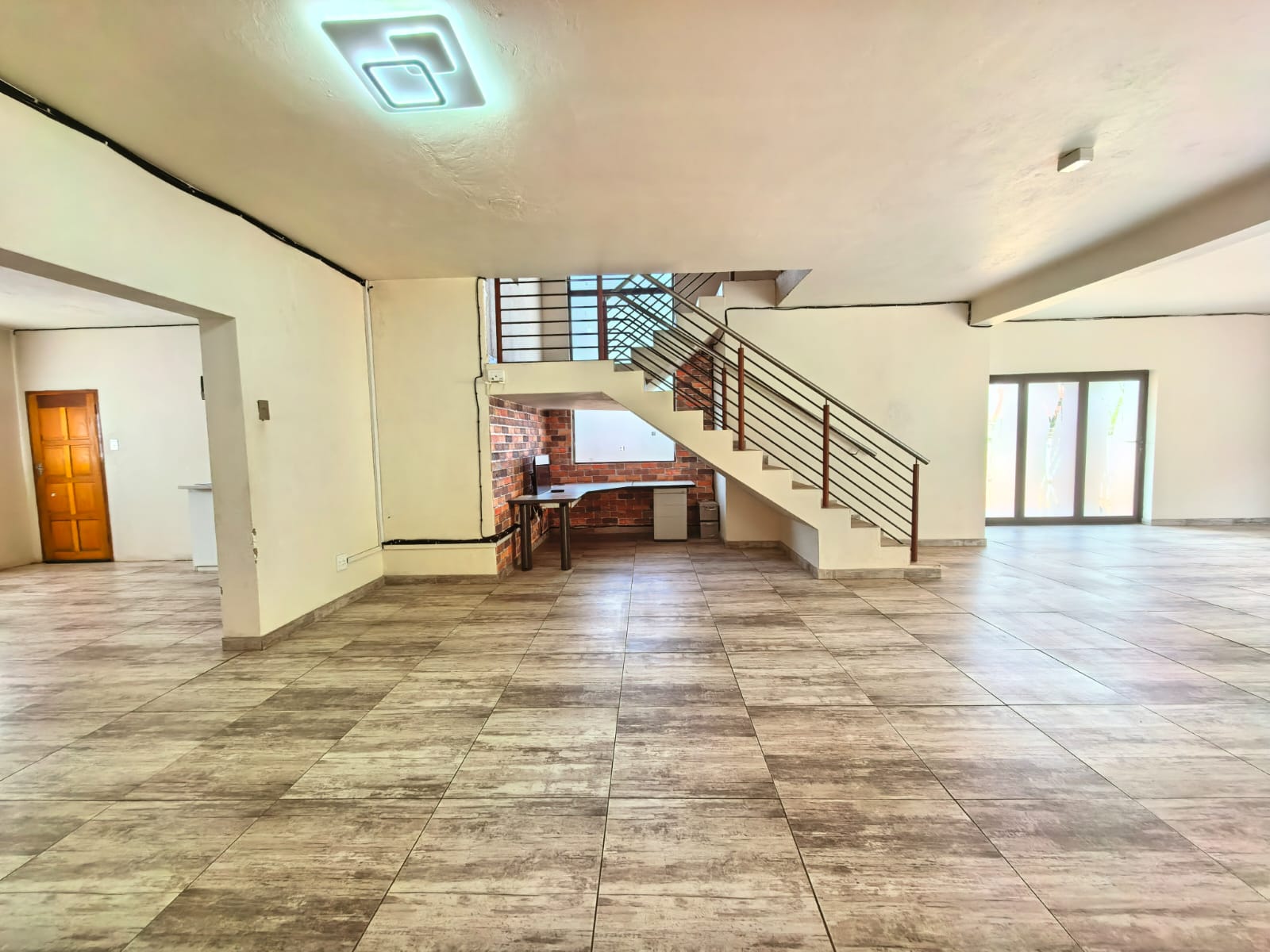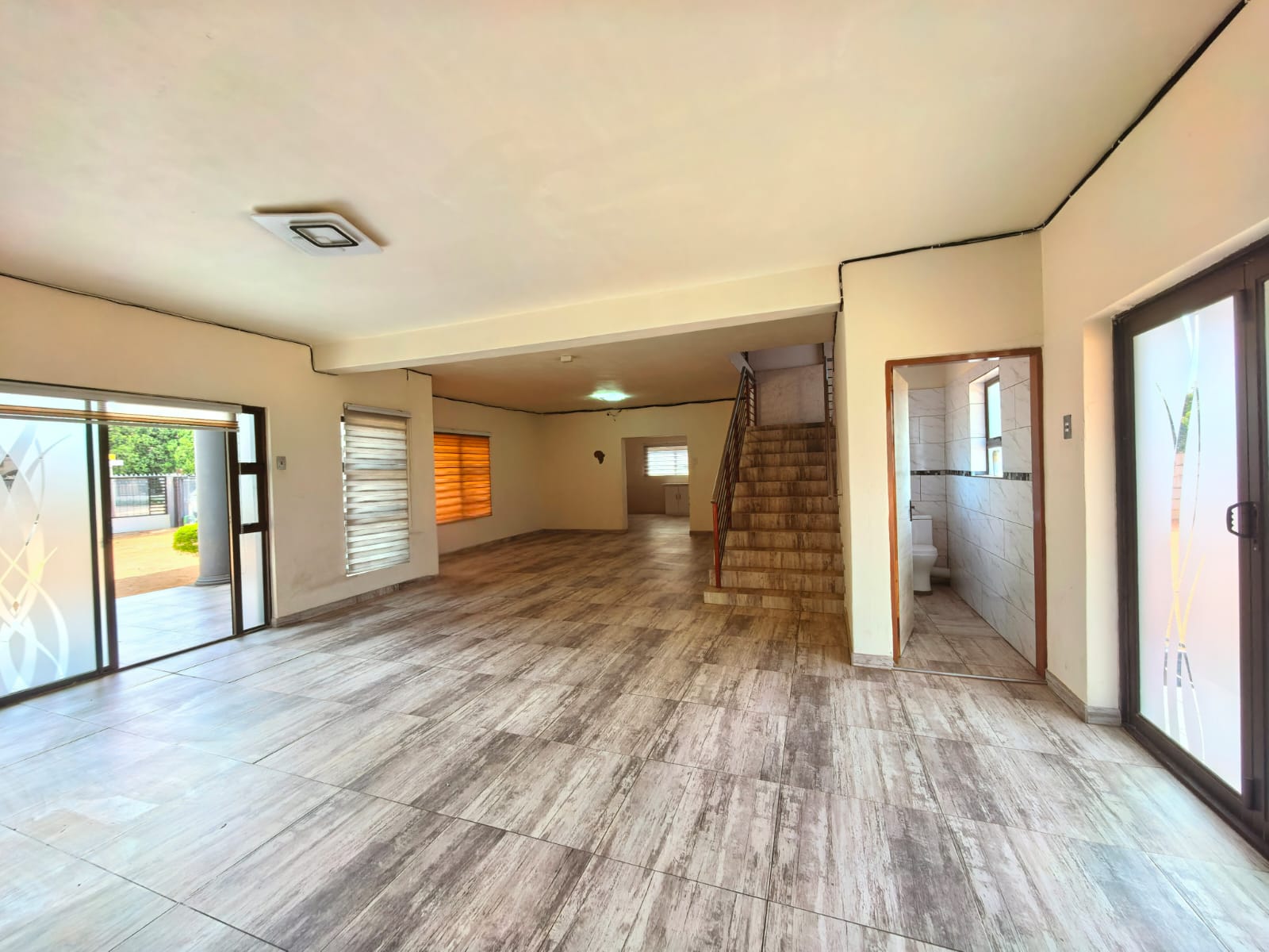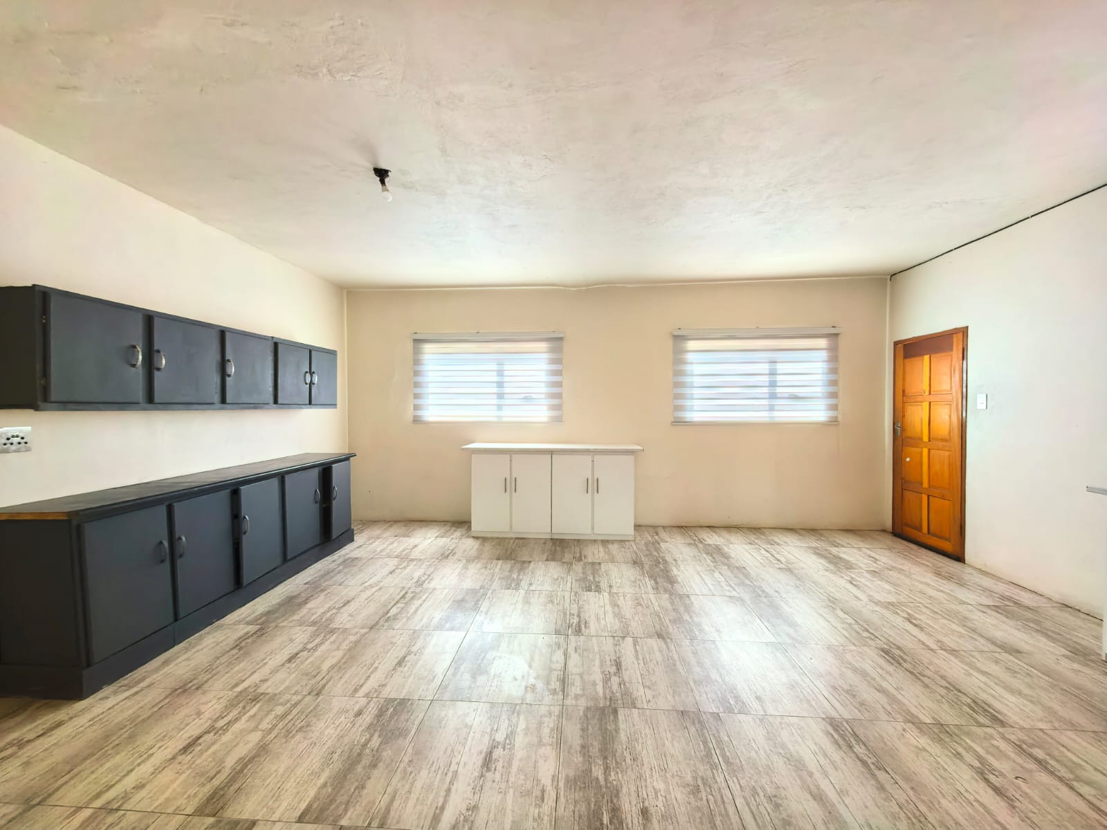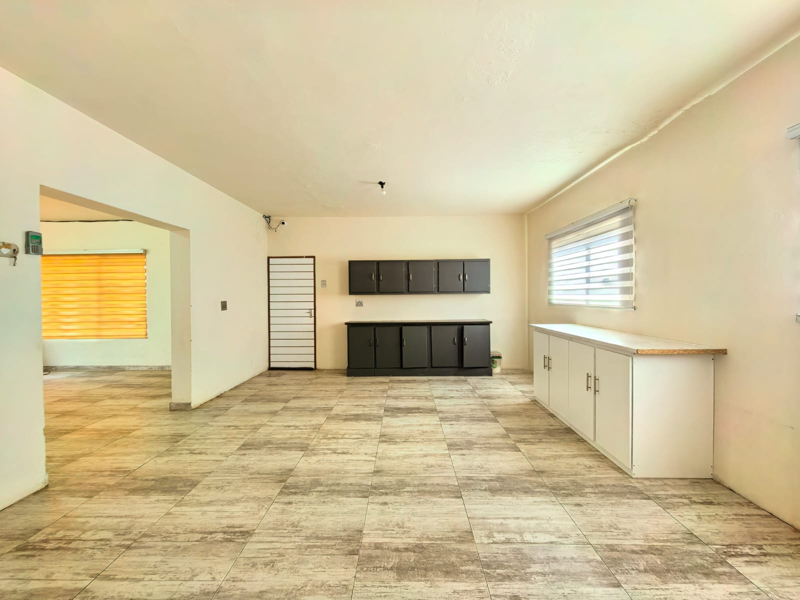Spacious open plan living area, leading into the kitchen and outdoor area with a trampoline and swingset.