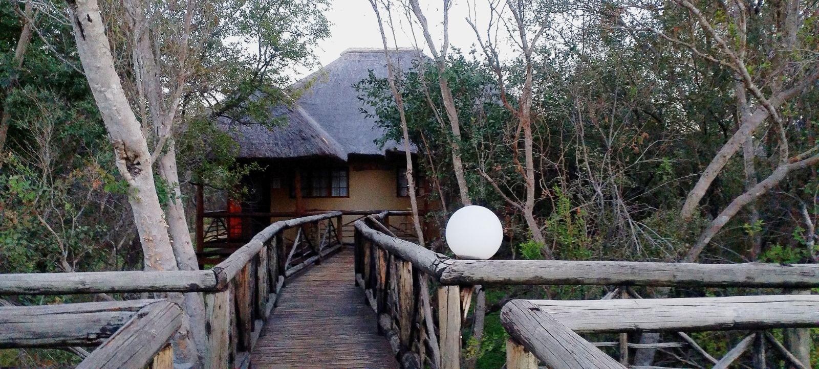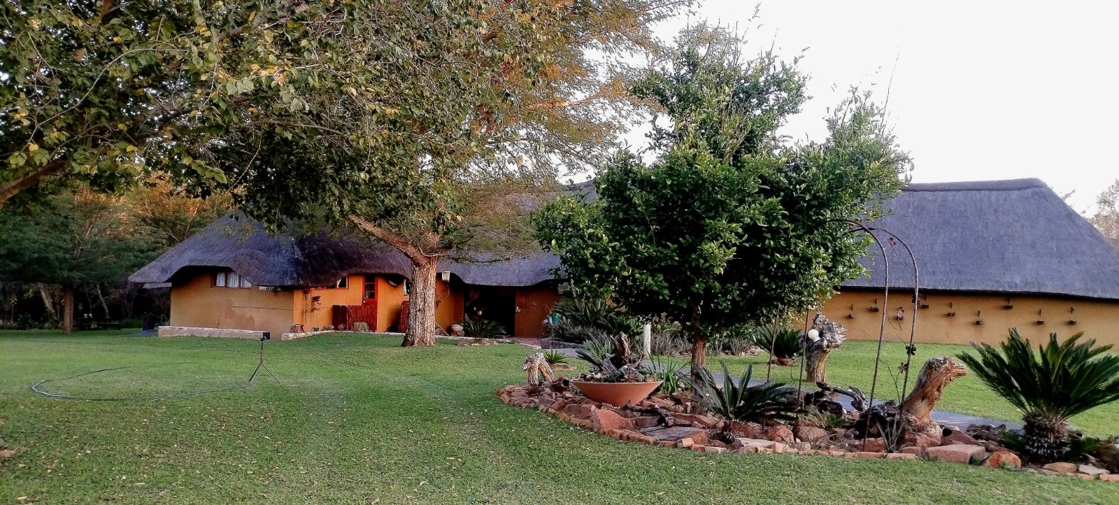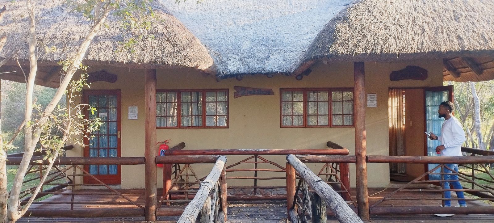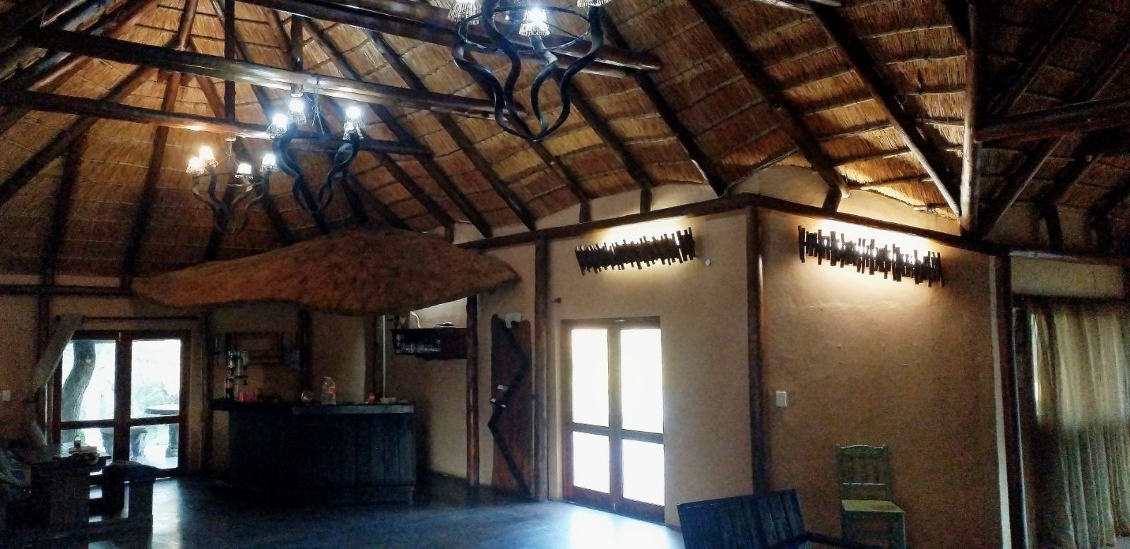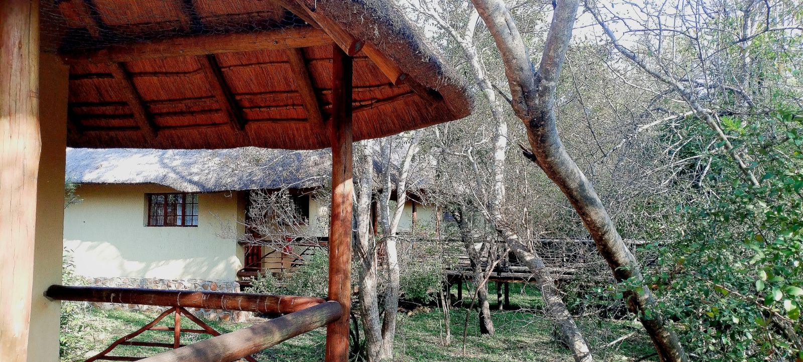 Rustic Finishes: Thatched roofs, wooden doors, cement crete floors & 23cm concrete walls — authentic bush lodge character