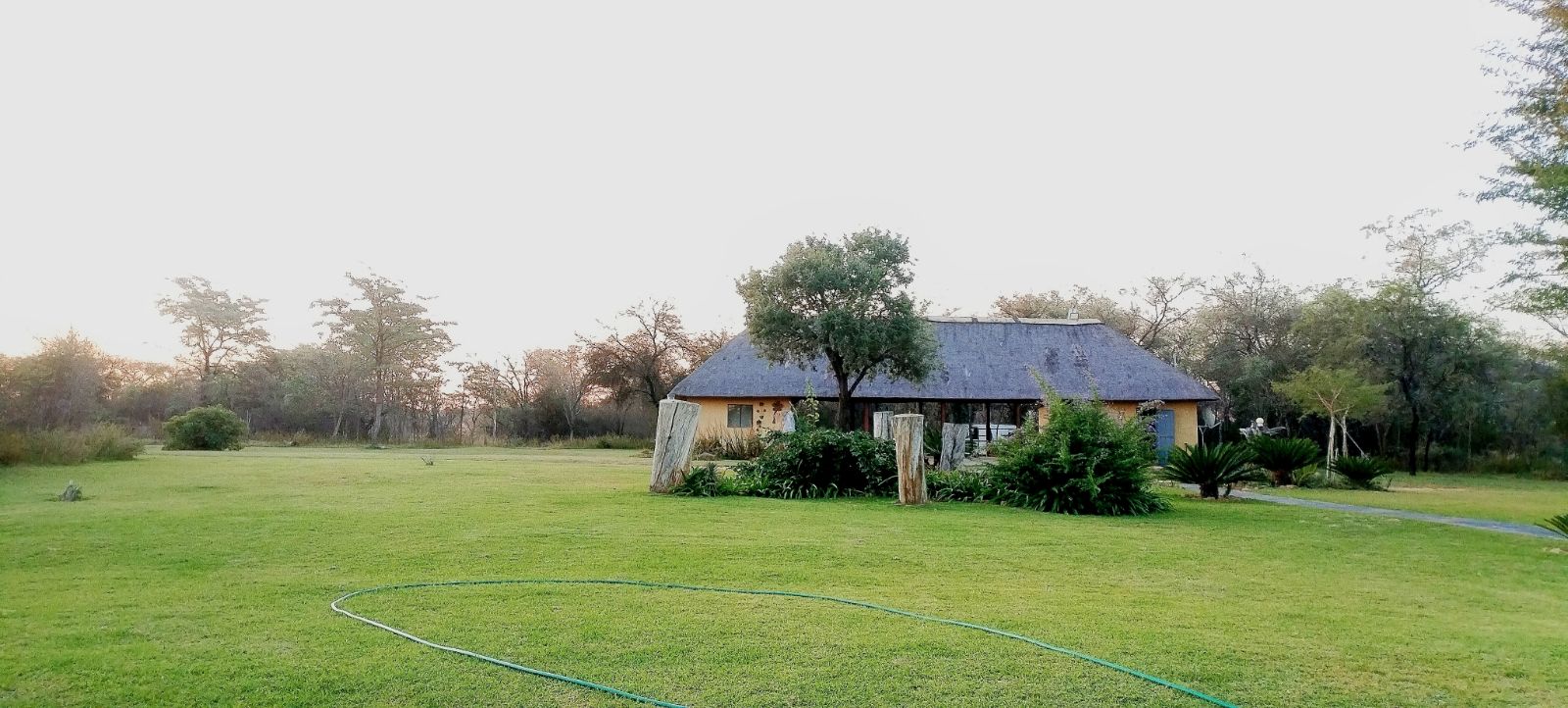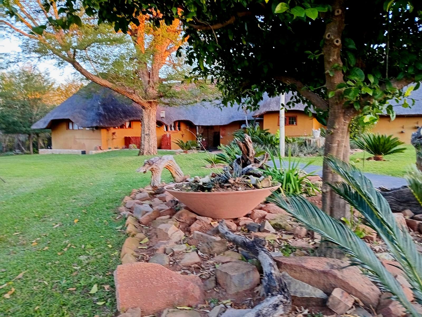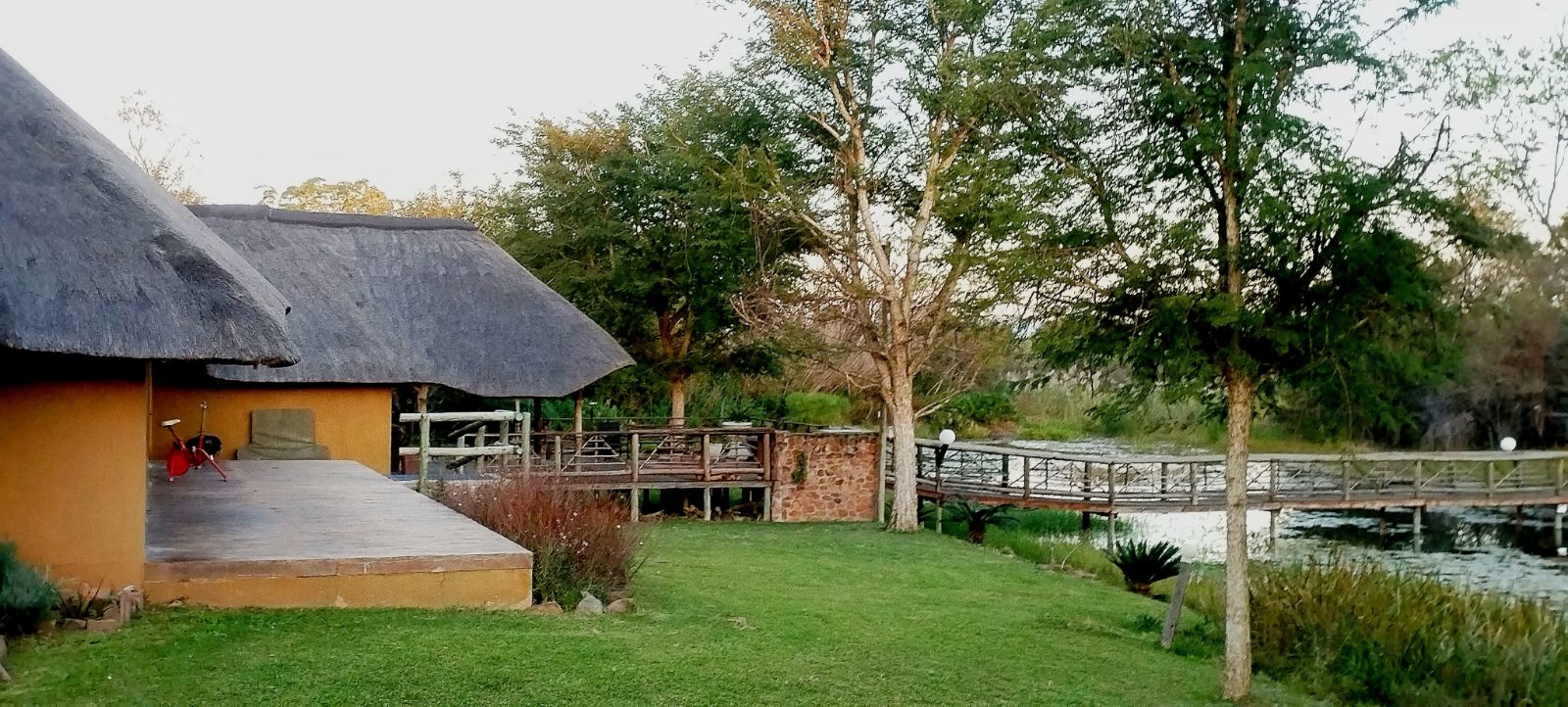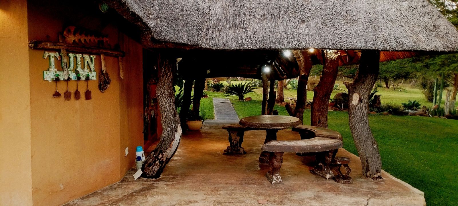 Rustic Finishes: Thatched roofs, wooden doors, cement crete floors & 23cm concrete walls — authentic bush lodge character