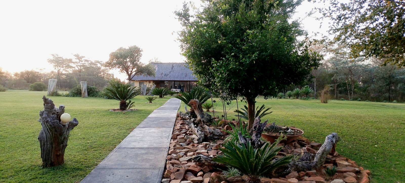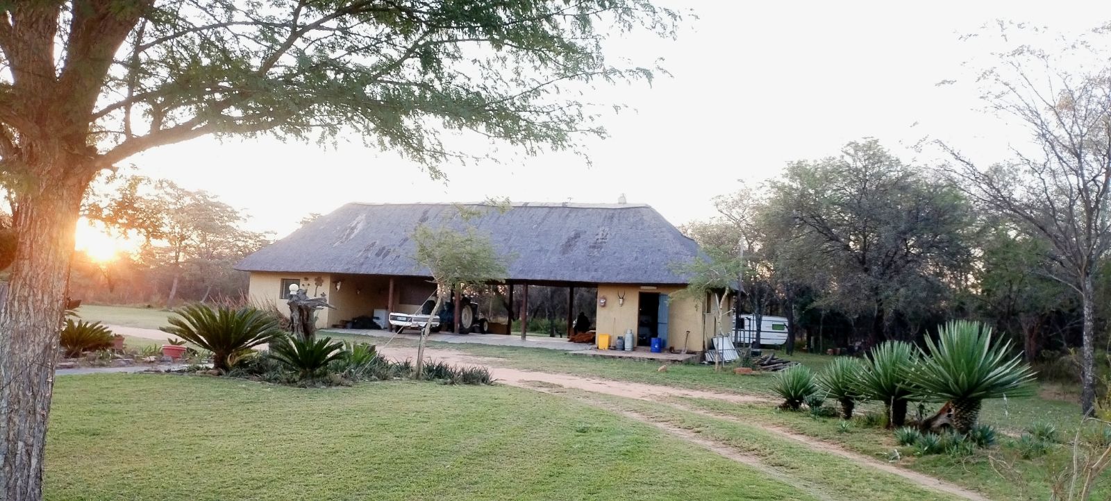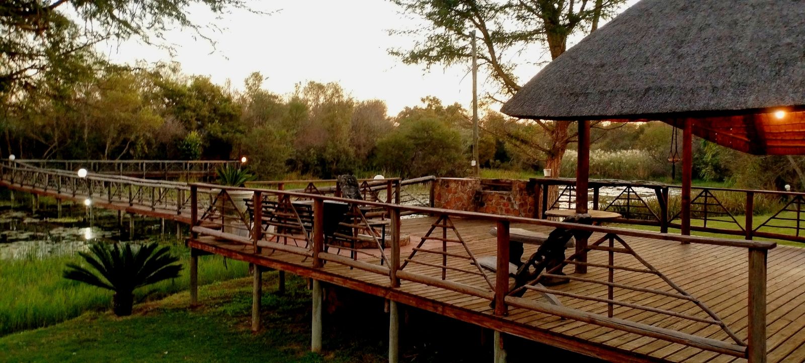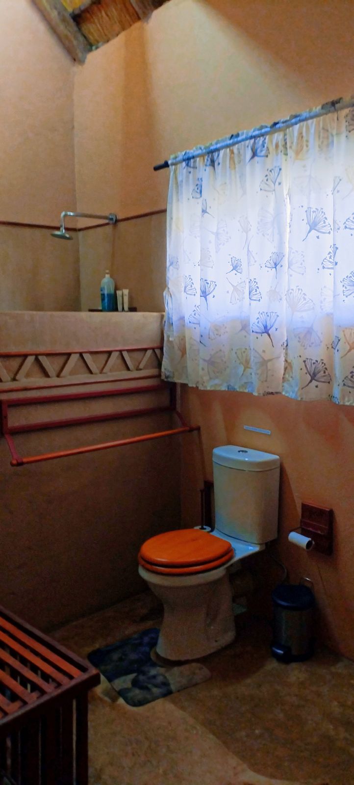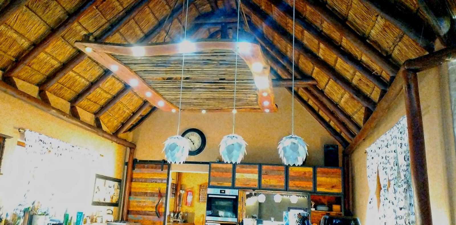 Rustic Finishes: Thatched roofs, wooden doors, cement crete floors & 23cm concrete walls — authentic bush lodge character