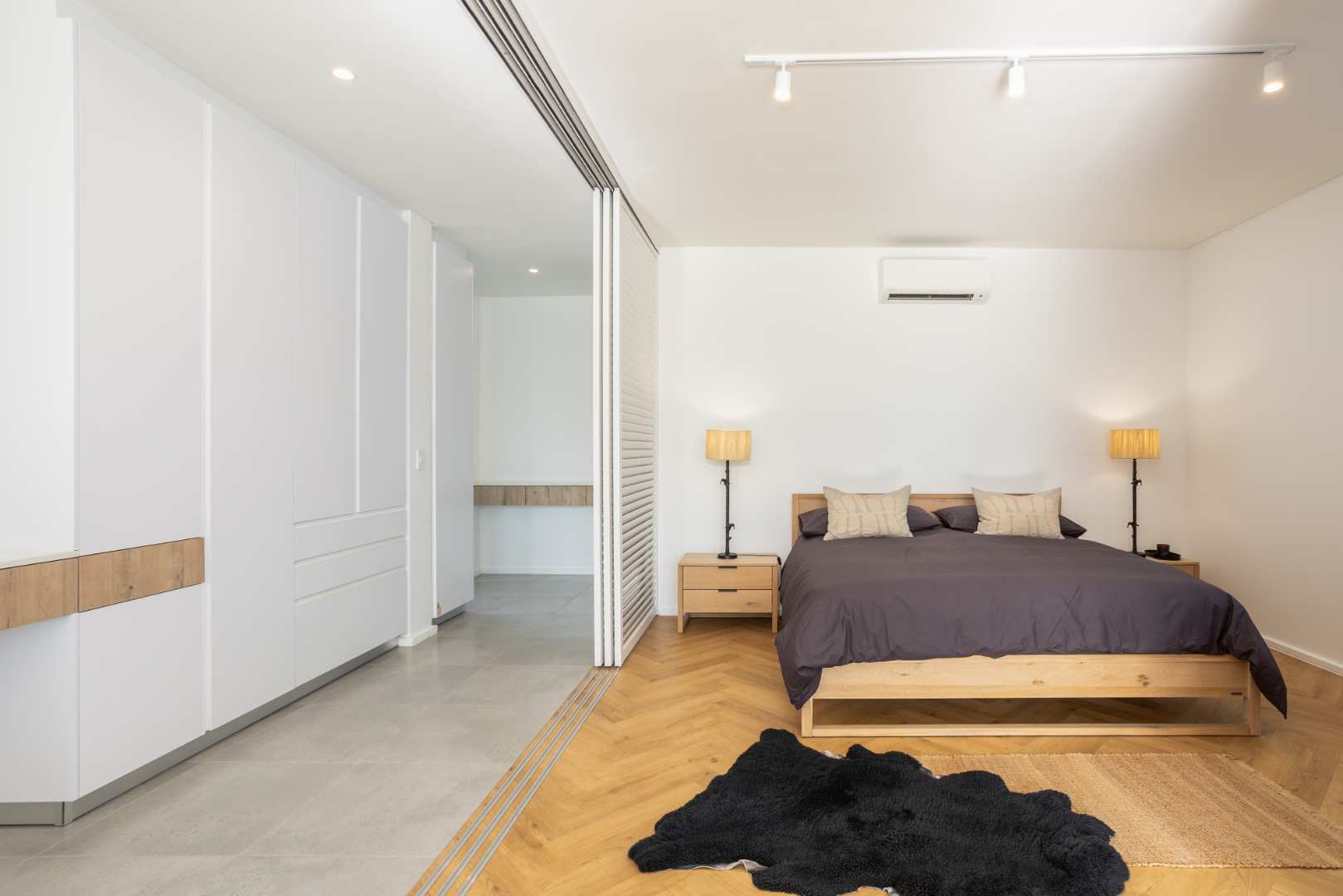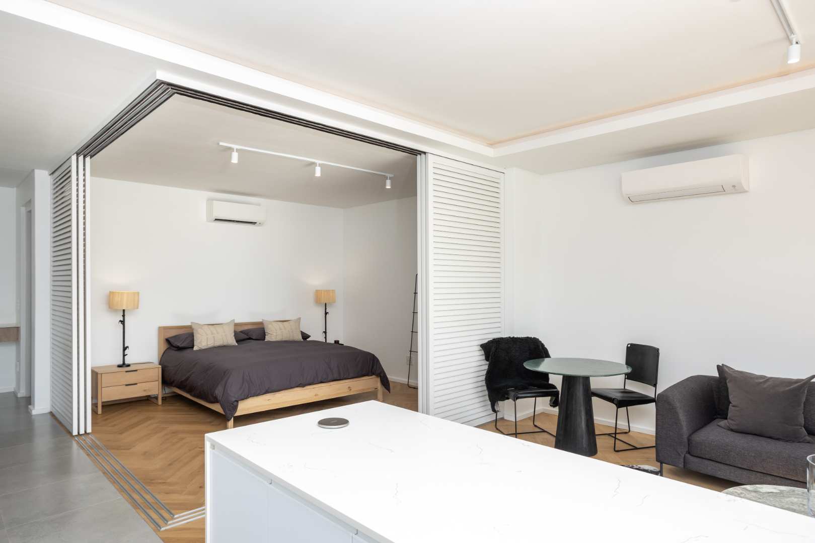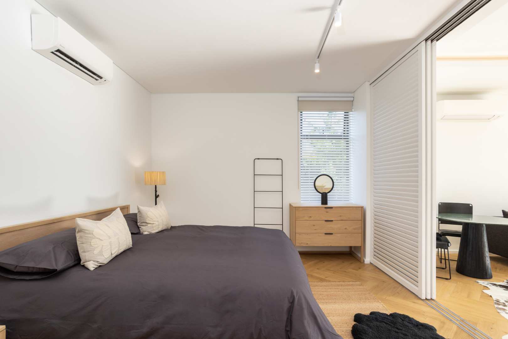 Shutter doors provide a sense of seclusion and privacy in the bedroom, complementing the warm, inviting ambience of the space. A built-in hybrid/AC inverter provides seamless, efficient power management.