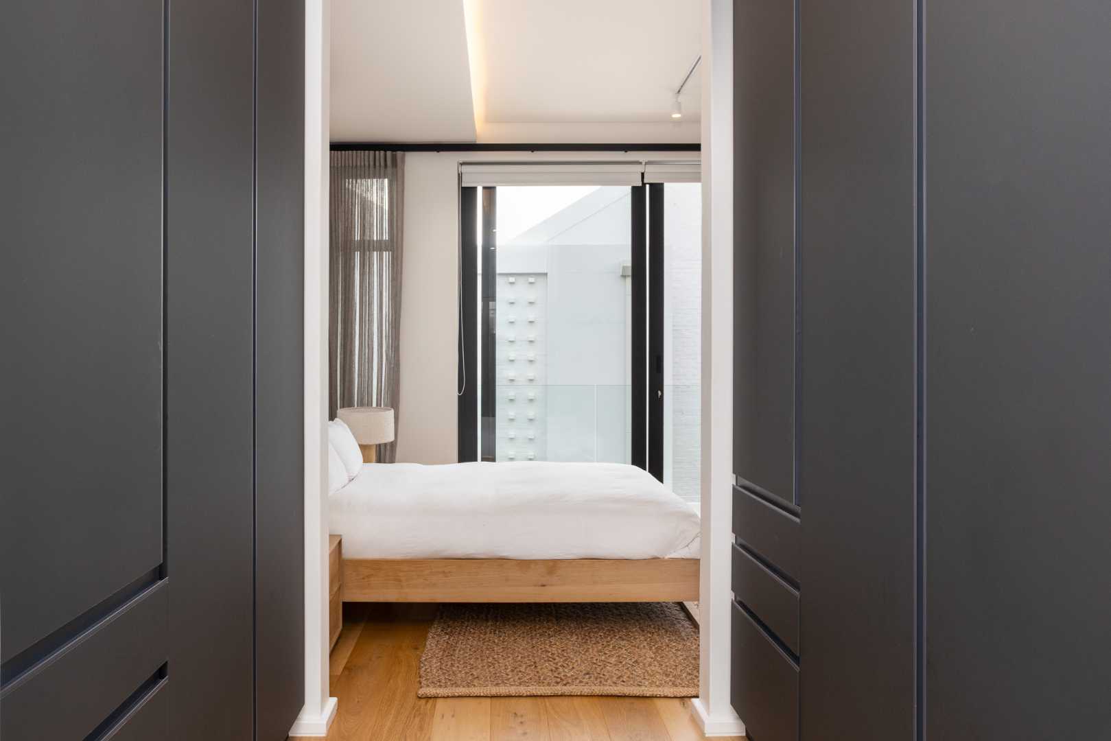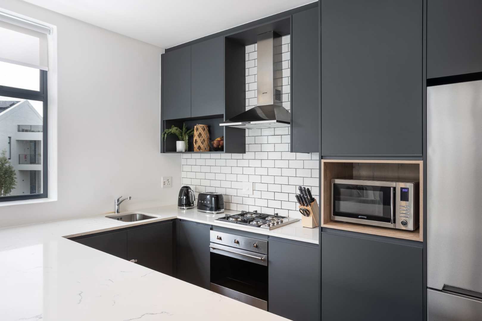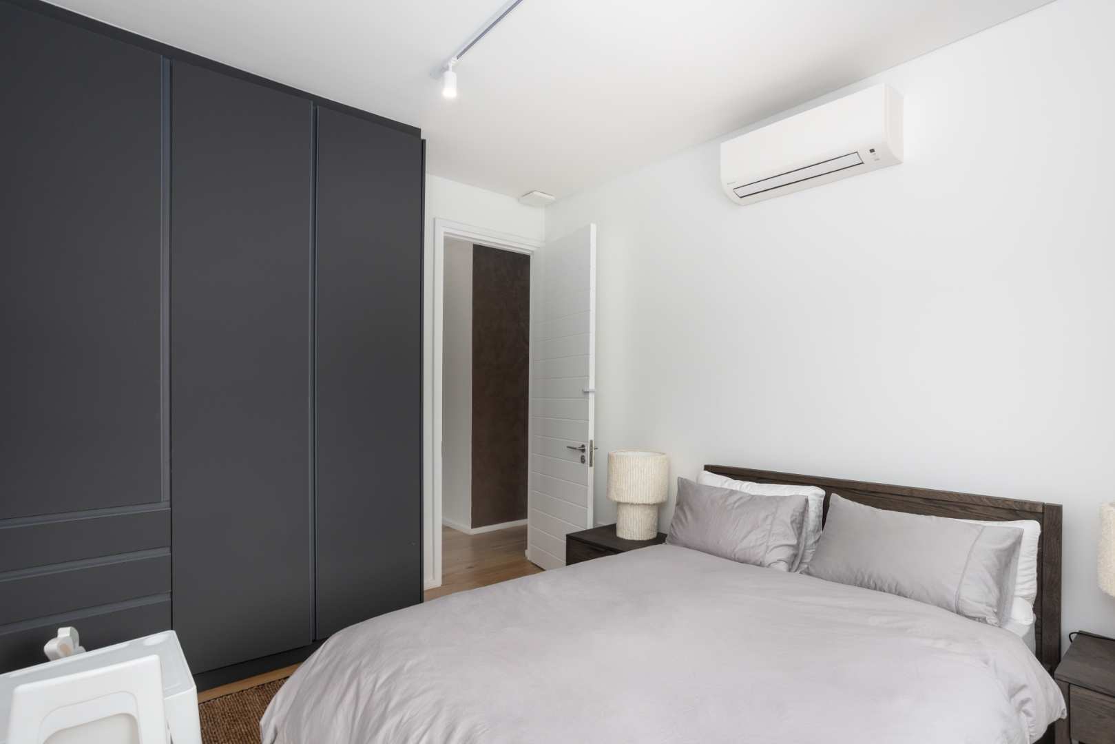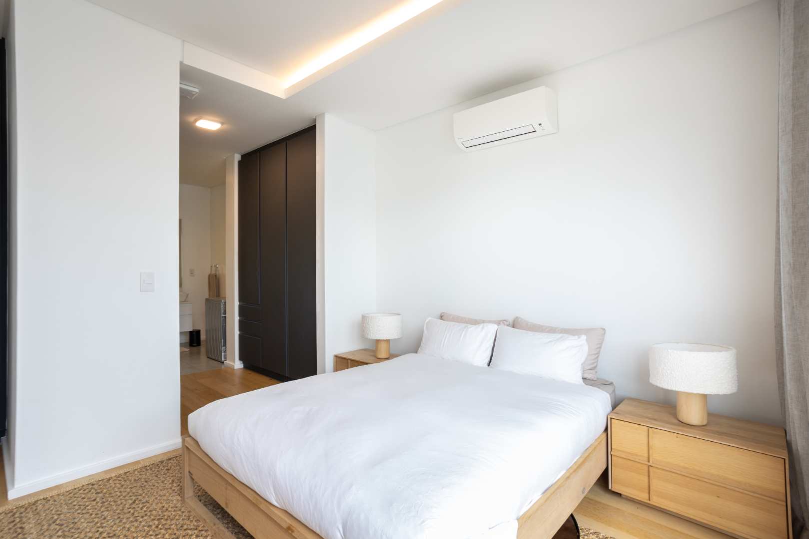 The apartment includes two generously proportioned bedrooms and two modern bathrooms. The main suite features an en-suite bathroom, a private balcony, air conditioning and ample built-in cupboards. Curtains and roller blinds in the living area and main bedroom ensure privacy without compromising on natural light.