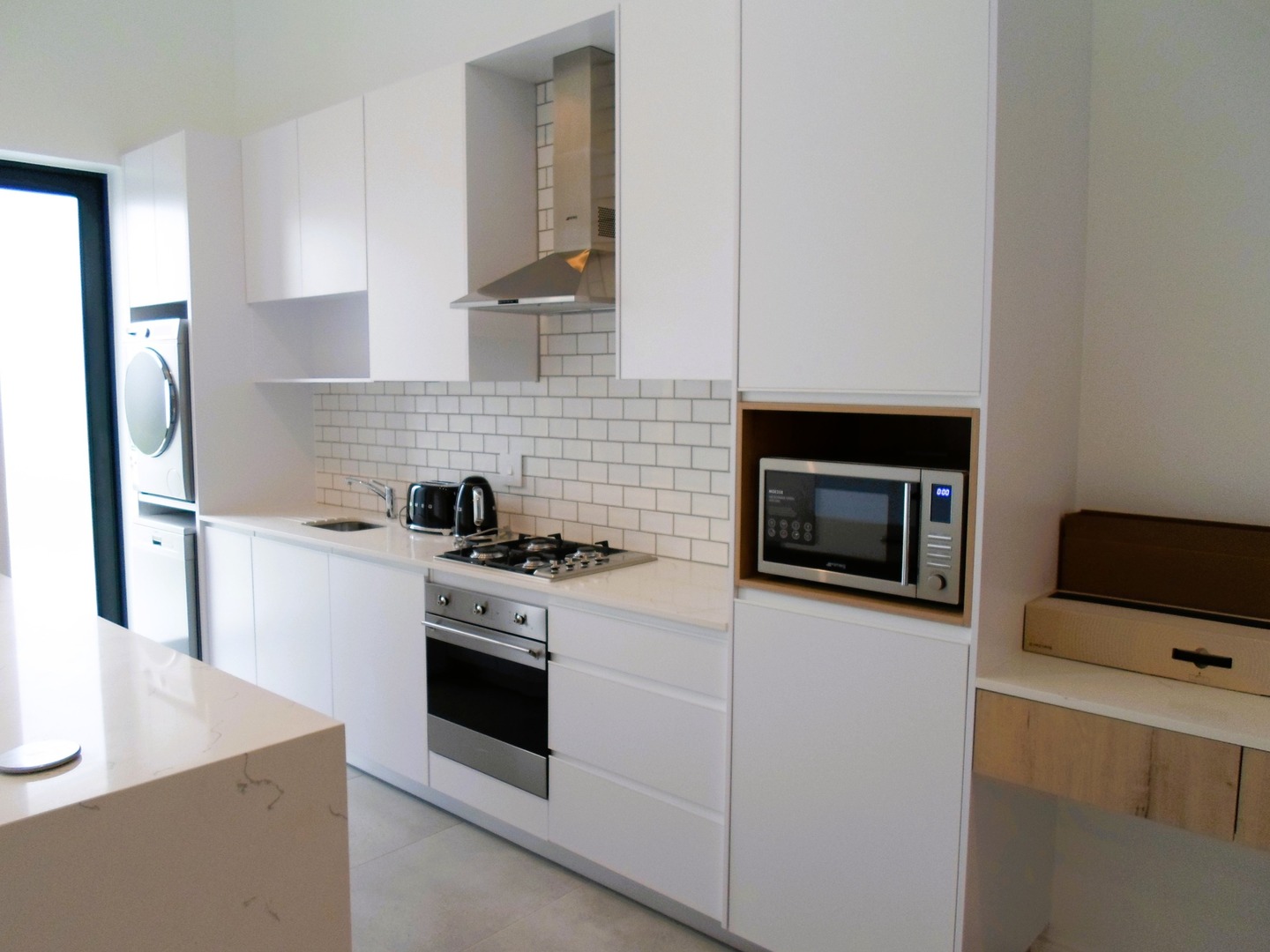 Immerse yourself in modern luxury at this stunning first-floor bachelor apartment. Unwind in the open-plan lounge and kitchen, bathed in natural light. The sleek kitchen boasts top-of-the-line SMEG appliances, featuring a gas stove with oven, dishwasher, and a fridge to keep your groceries fresh.