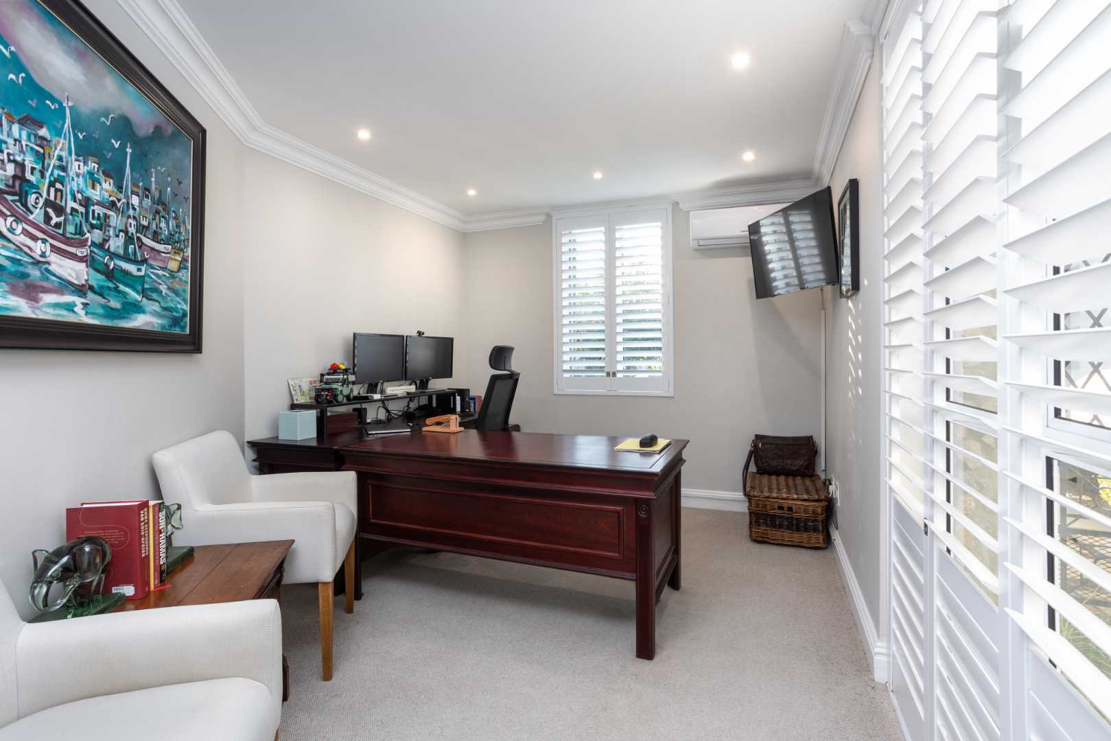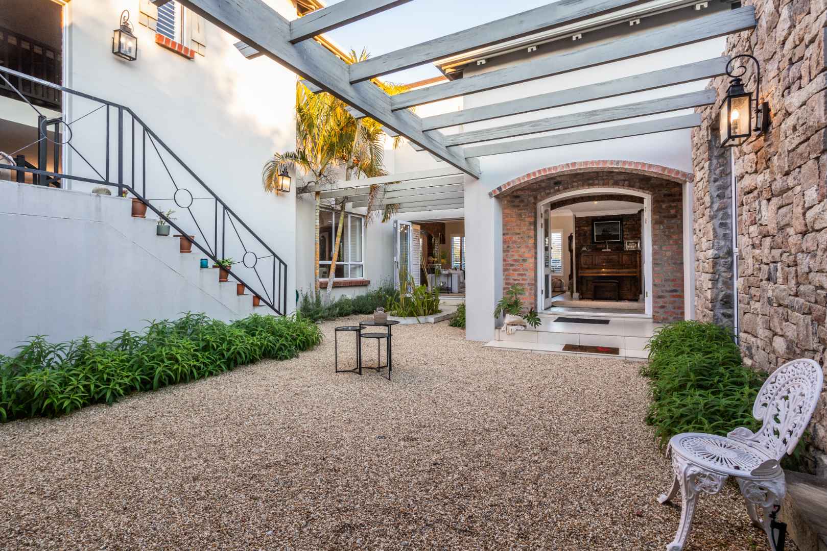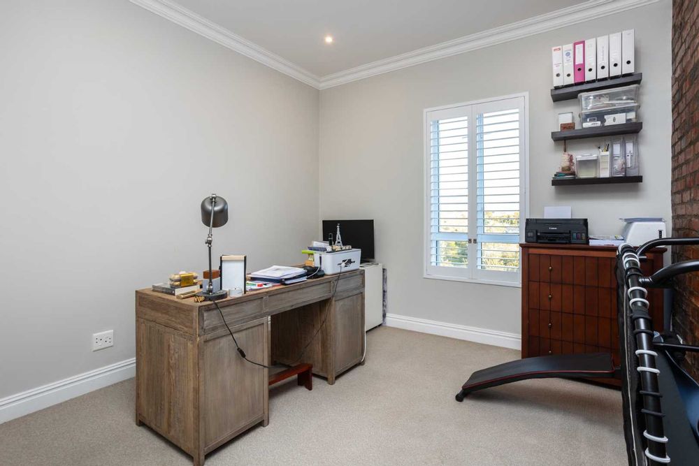 On the ground floor, a generously sized, luxurious en-suite primary bedroom is situated. A fitted study with access to the courtyard provides a peaceful workspace. Upstairs, there are three spacious bedrooms, one en-suite with a large pyjama lounge providing breathtaking mountain views.