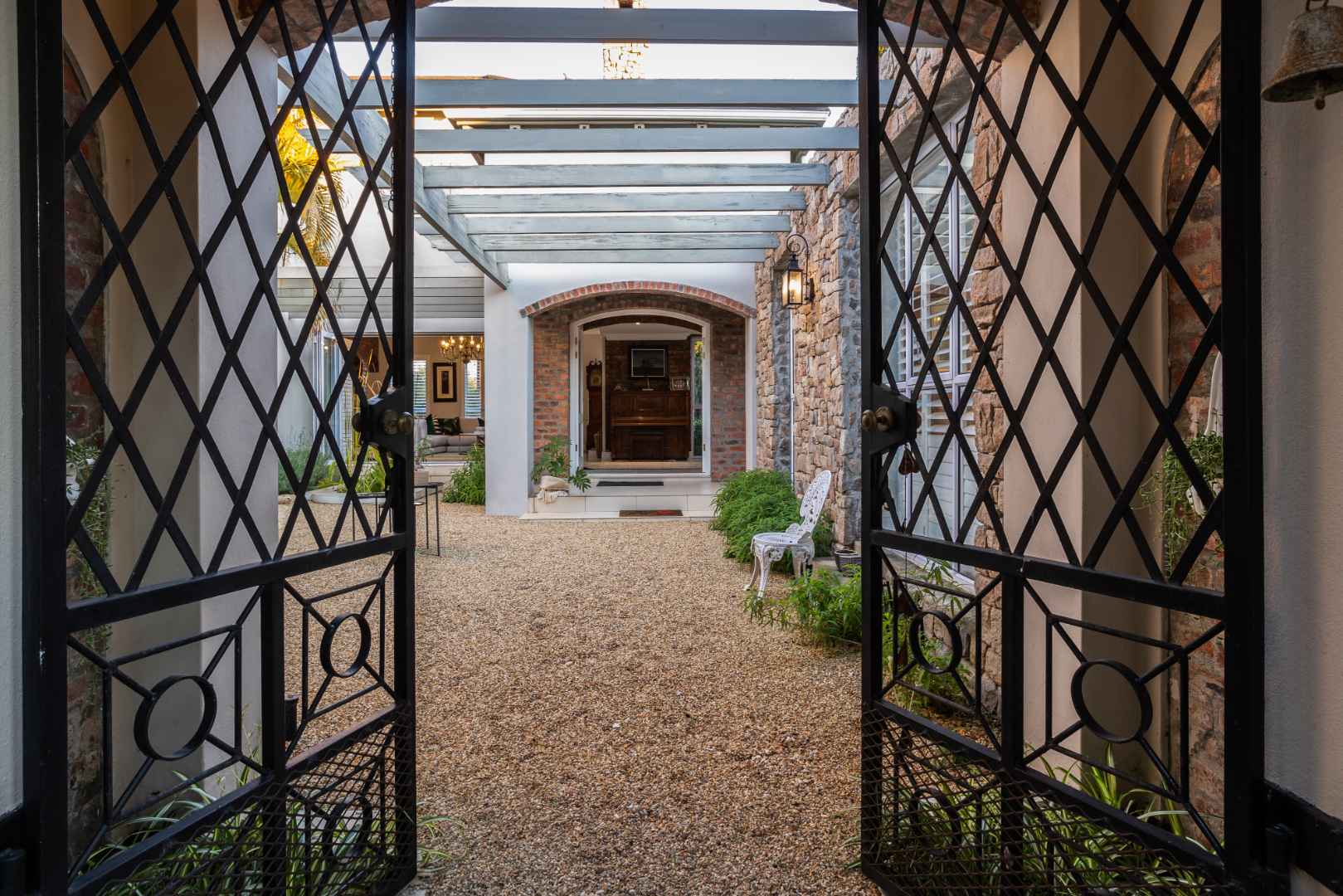 This house blends rustic charm with earthy and elegant tones. The exterior, amongst the olive grove and inviting mountain views, boasts a palette of warm ochres and soft, weathered stone. Well-tended gardens and a charming courtyard will welcome you as you walk in, accessible through double doors and multiple patios that blend the indoors and outdoors.