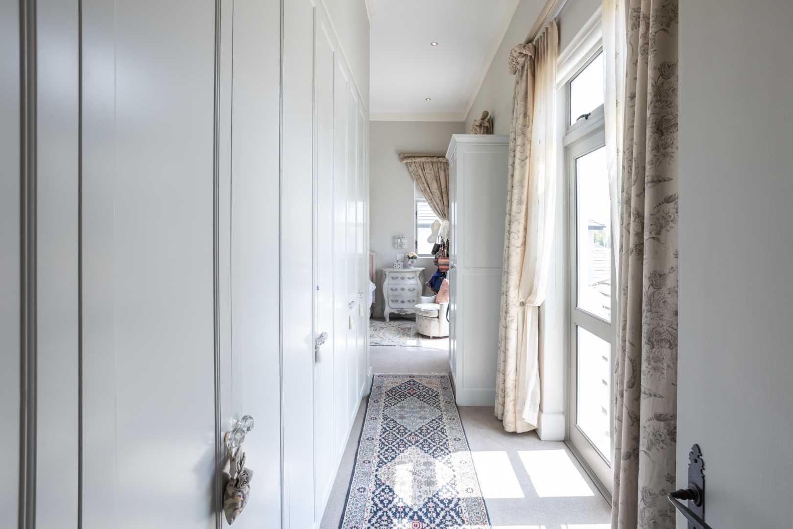 A generous landing on the first floor leads to a versatile lounge or study, bathed in natural light, ideal as a private workspace or reading room. The bedrooms include a luxurious ground-floor guest suite with a full en-suite bathroom, as well as a second en-suite bedroom upstairs. The main suite is a peaceful space, offering abundant cupboard space and a beautifully appointed en-suite bathroom.