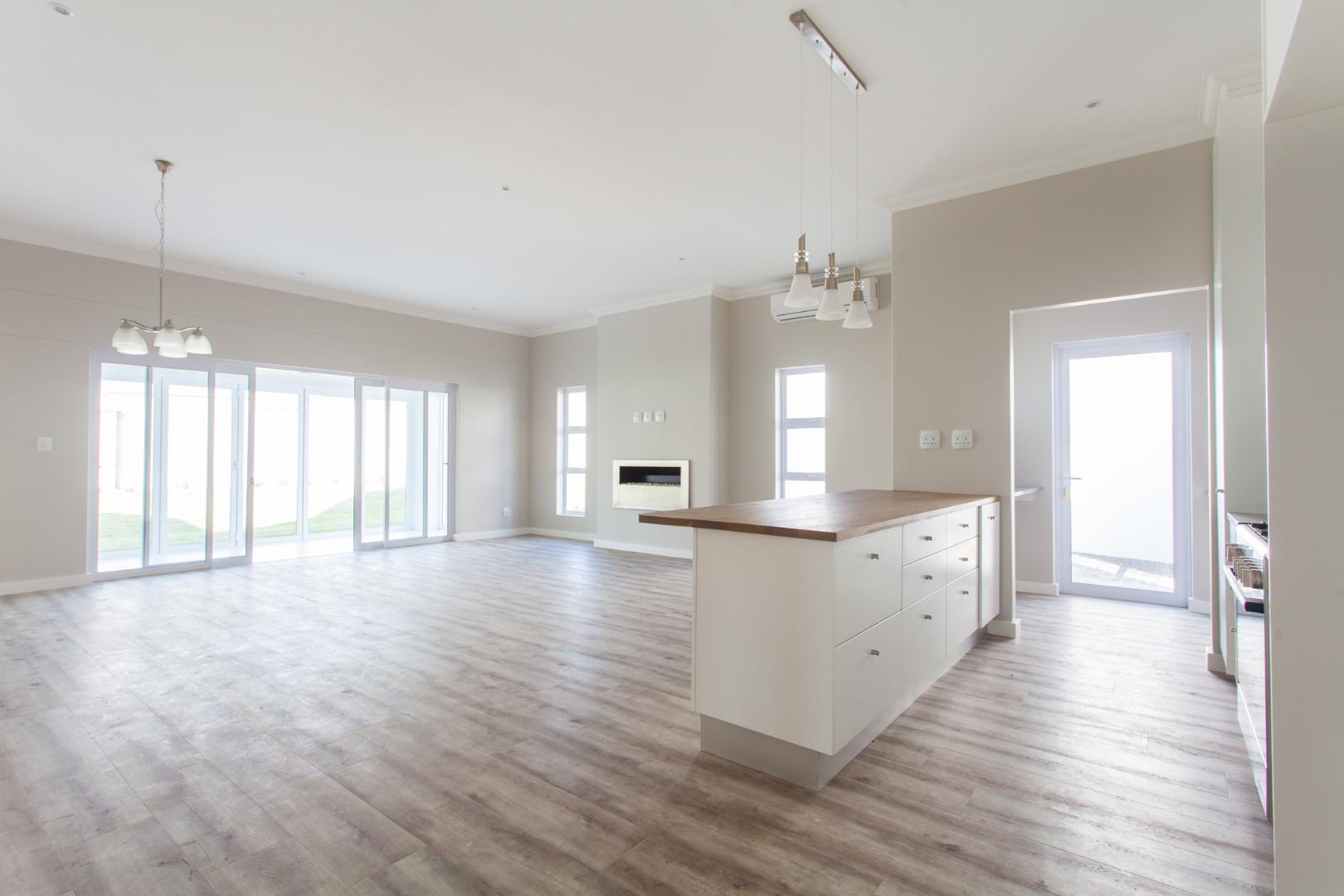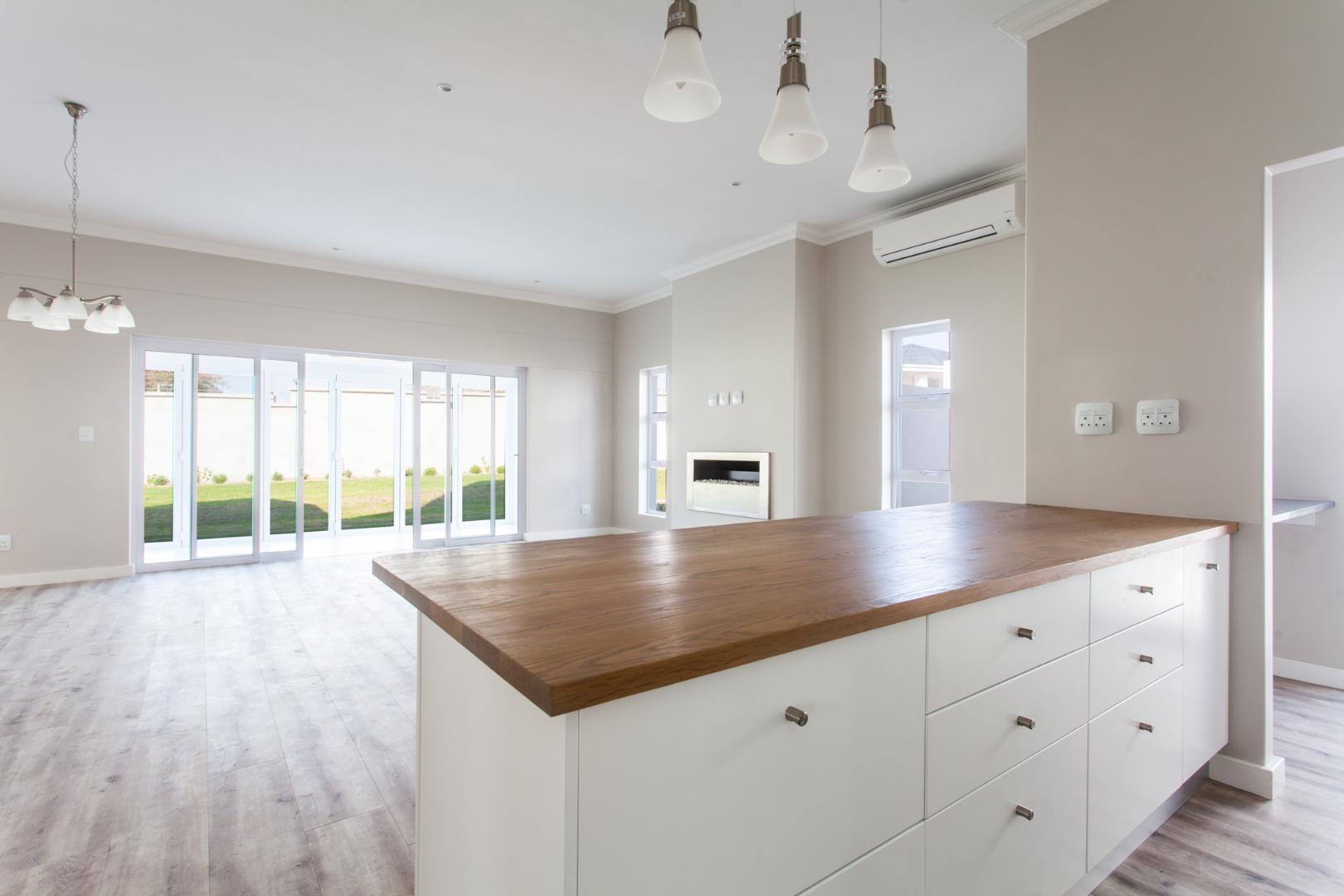 The home features a spacious open-plan kitchen, dining and living area, complemented by a separate scullery for added convenience. Stackable doors open onto a covered patio with a built-in braai—perfect for effortless indoor-outdoor living and entertaining.