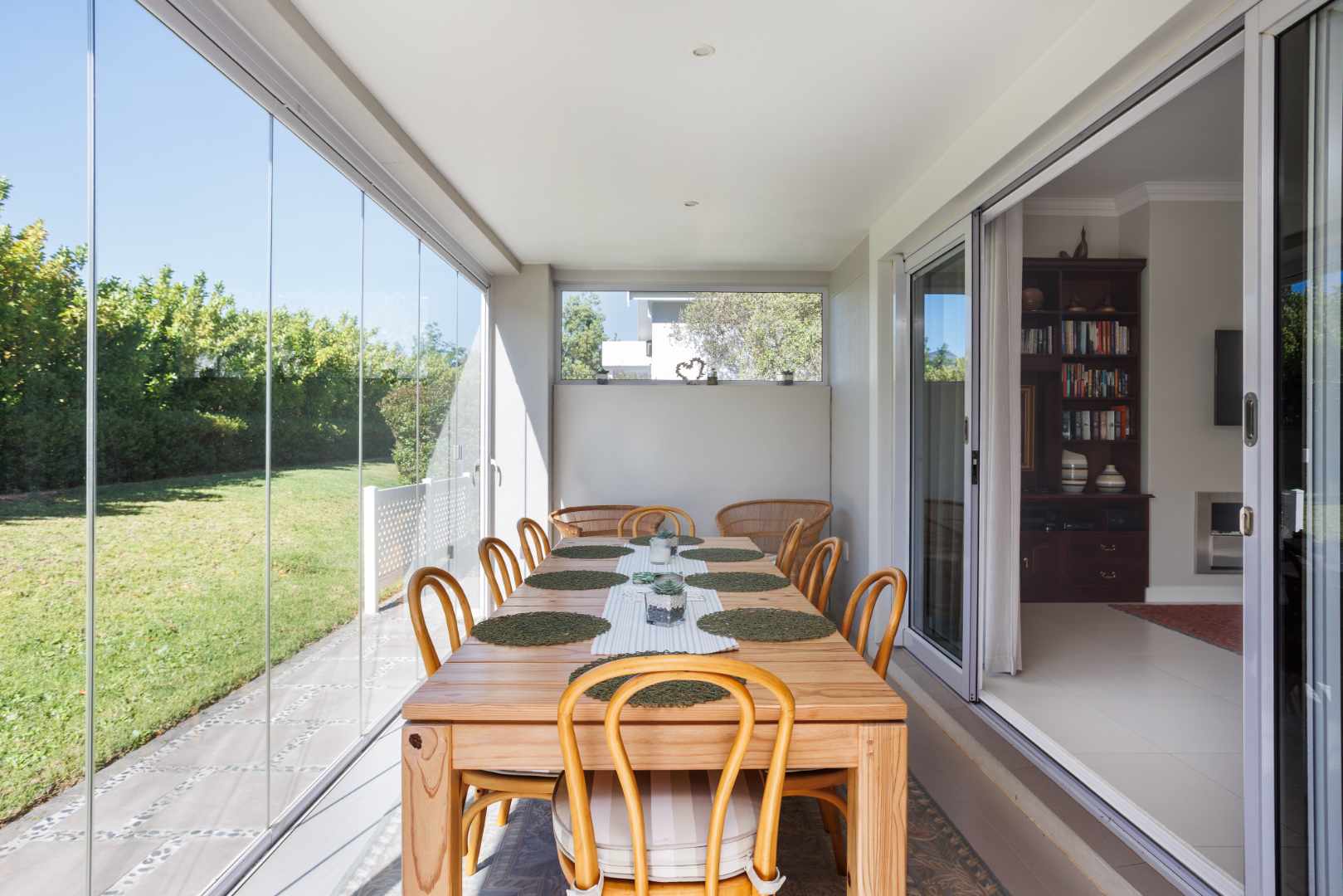 The open-plan living spaces have been designed for effortless flow and everyday enjoyment, featuring a sleek, modern kitchen that connects seamlessly to the dining area and an inviting TV lounge. A gas fireplace adds warmth and character to the interior, while the enclosed patio with frameless stacking doors and a built-in braai extends the living area outdoors, making it ideal for year-round entertaining and relaxed family gatherings.