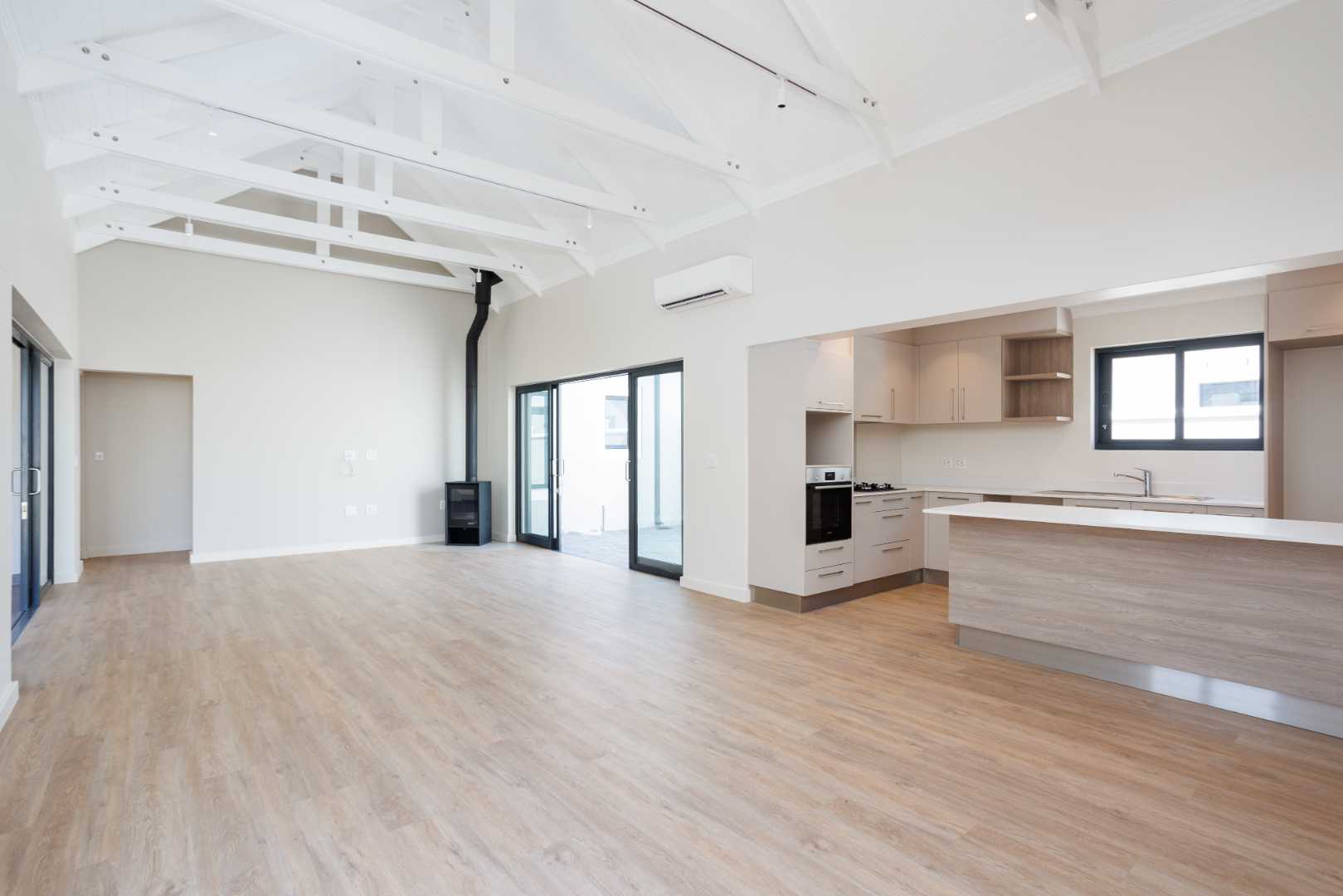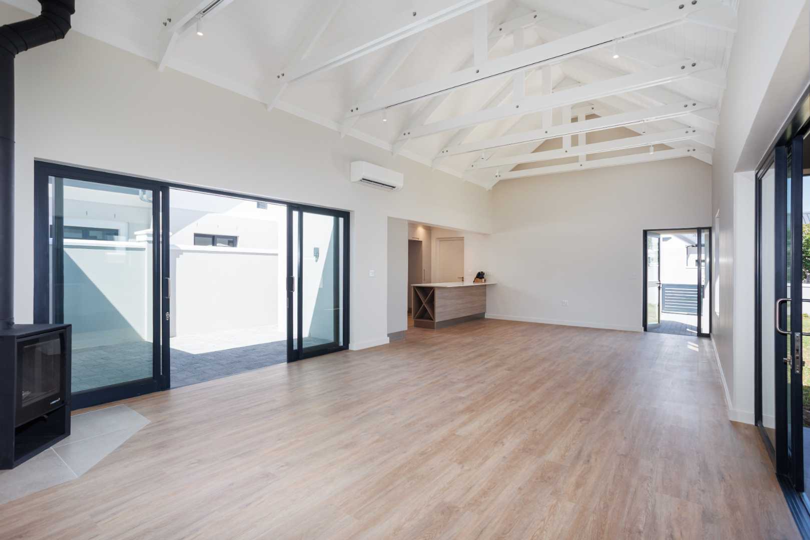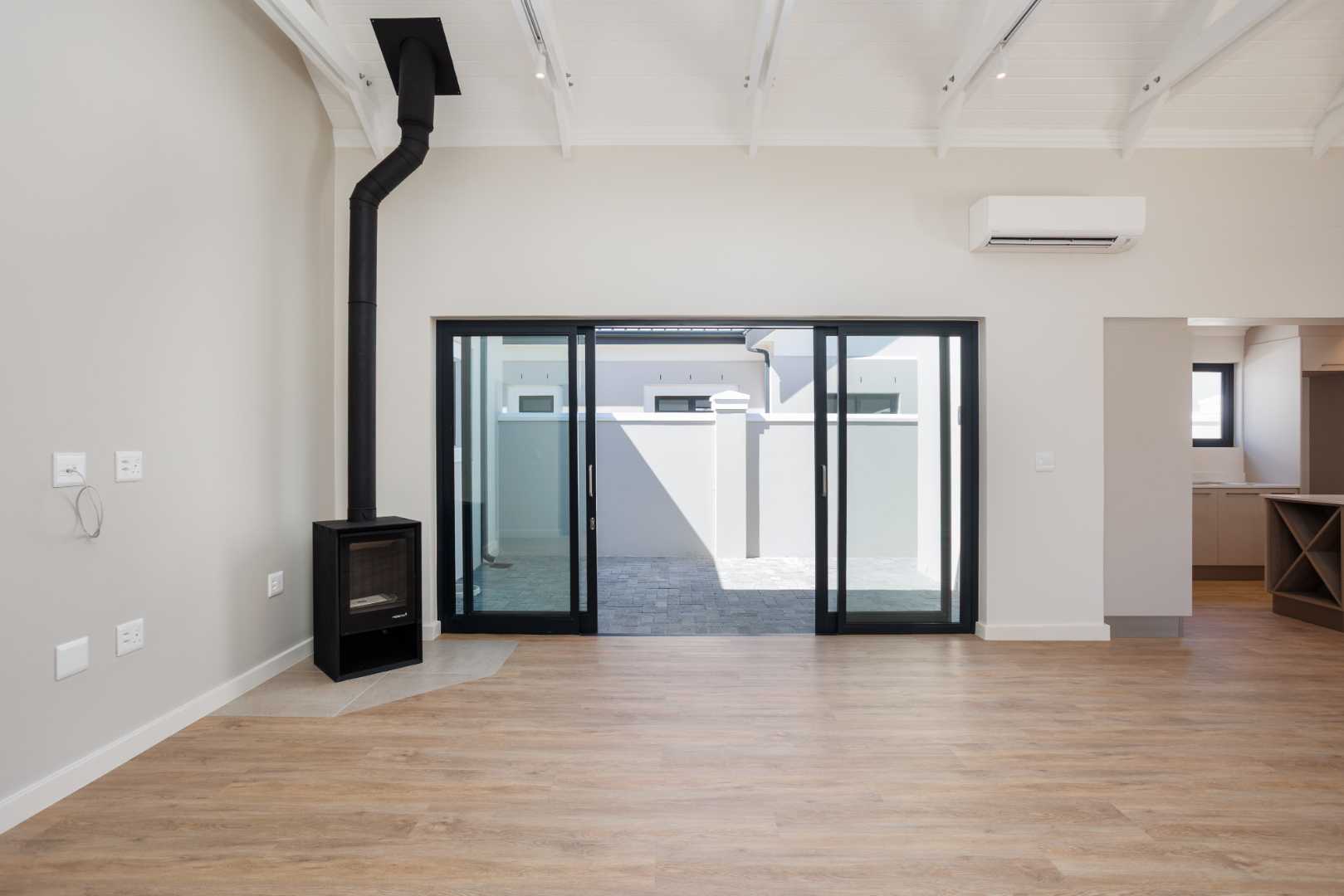 The open-plan living and dining area forms the heart of the home and flows naturally into a modern kitchen fitted with a gas hob and practical work surfaces. A fireplace anchors the lounge, creating a warm and inviting atmosphere throughout the seasons. Large sliding doors open onto a covered patio with a built-in braai, extending the living space outdoors and offering a private setting for entertaining or quiet afternoons at home.